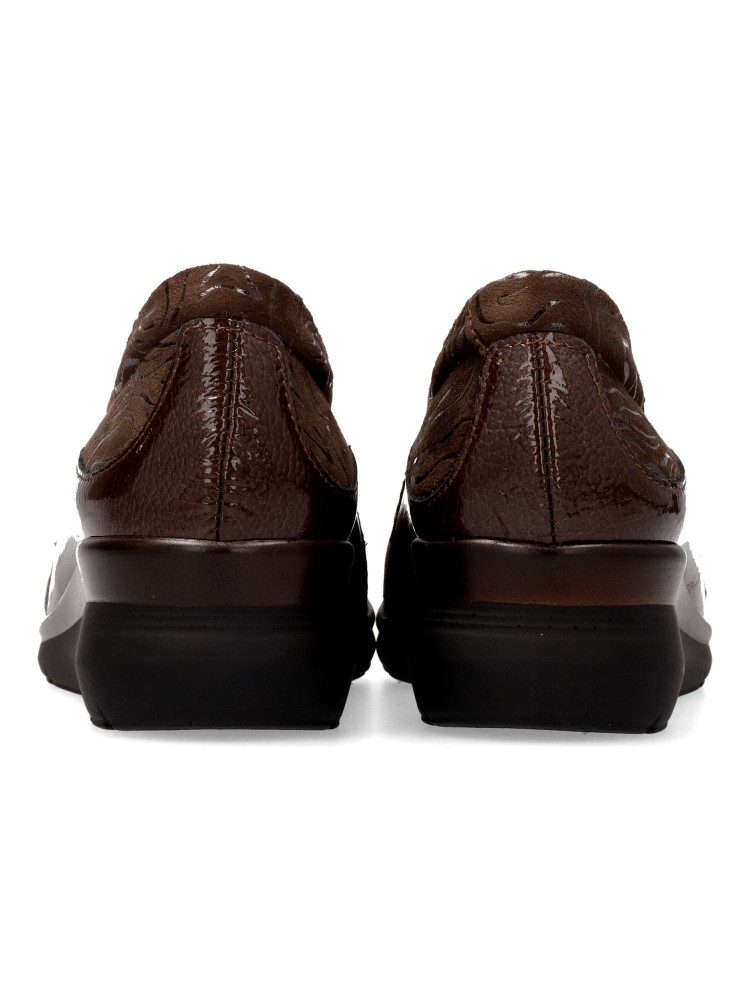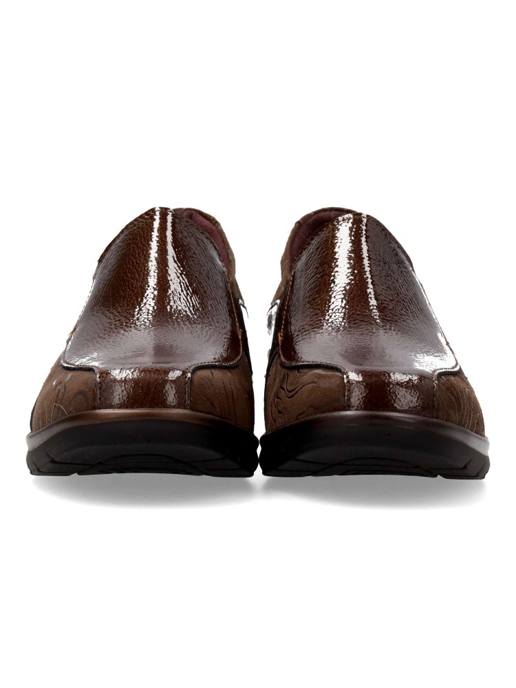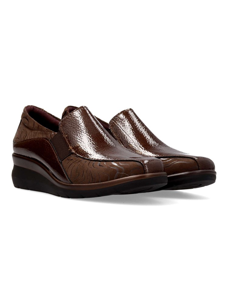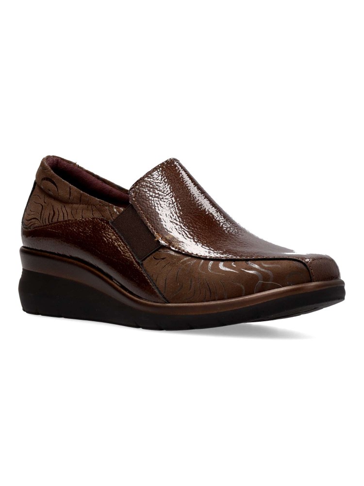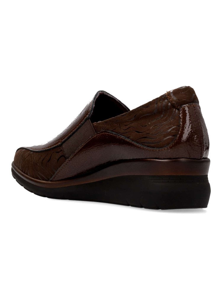 Zapato mocasín de mujer, con elásticos en los laterales. Fabricado en piel y textil, con suela de goma ligera y flexible. Plantilla acolchada y extraíble. Color marrón. Pequeña cuña de 4 cm. Combinan diseño, calidad, confort y bienestar. Hecho en España.