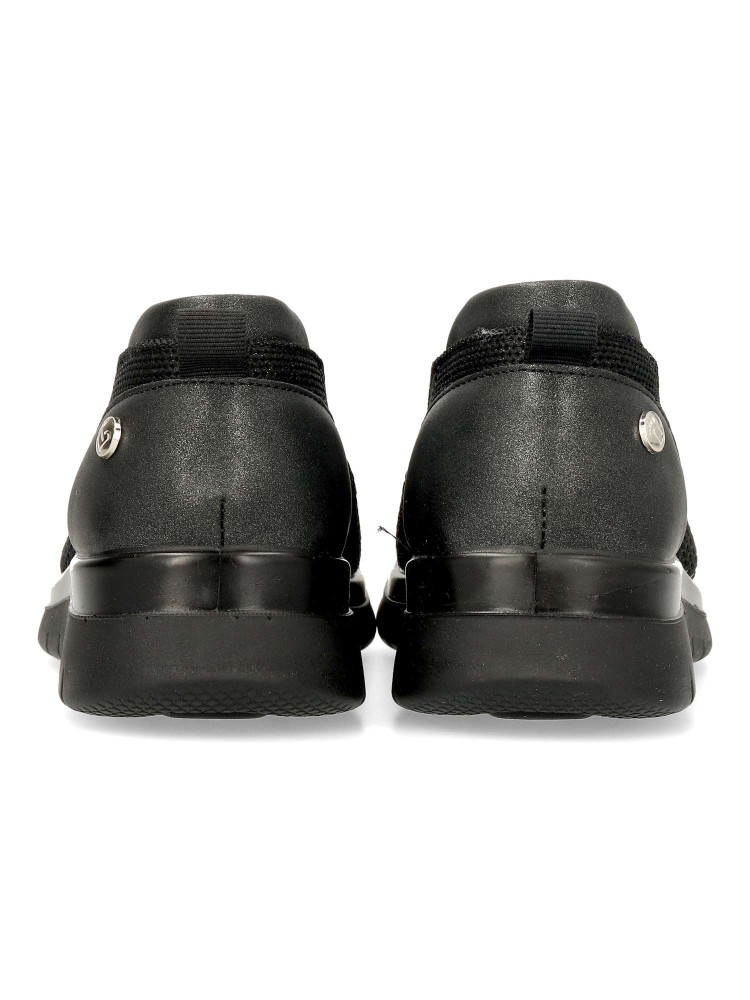 Zapato cómodo de mujer estilo casual. Fabricado en textil tipo calcetín. Suela de goma flexible y ligera. Plantilla acolchada y extraíble. Disponible en color negro. Modelo ligero y transpirable que ofrece máximo confort para uso diario. Amarpies.