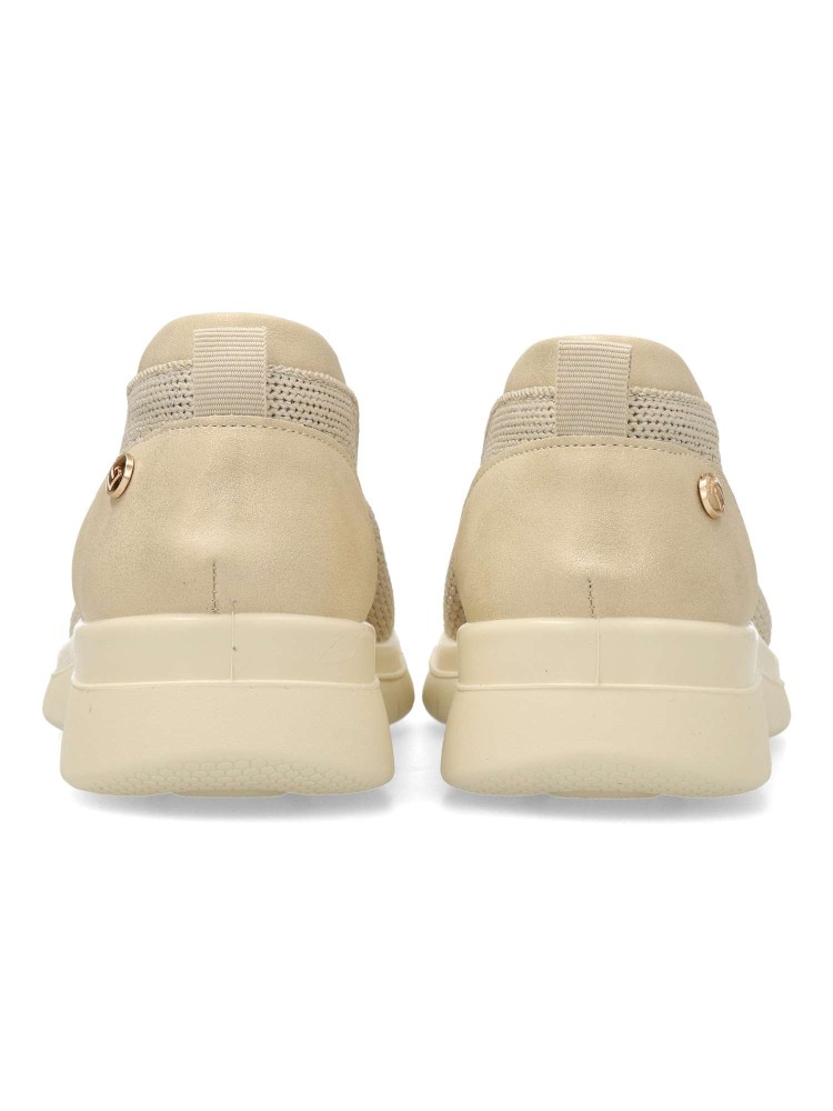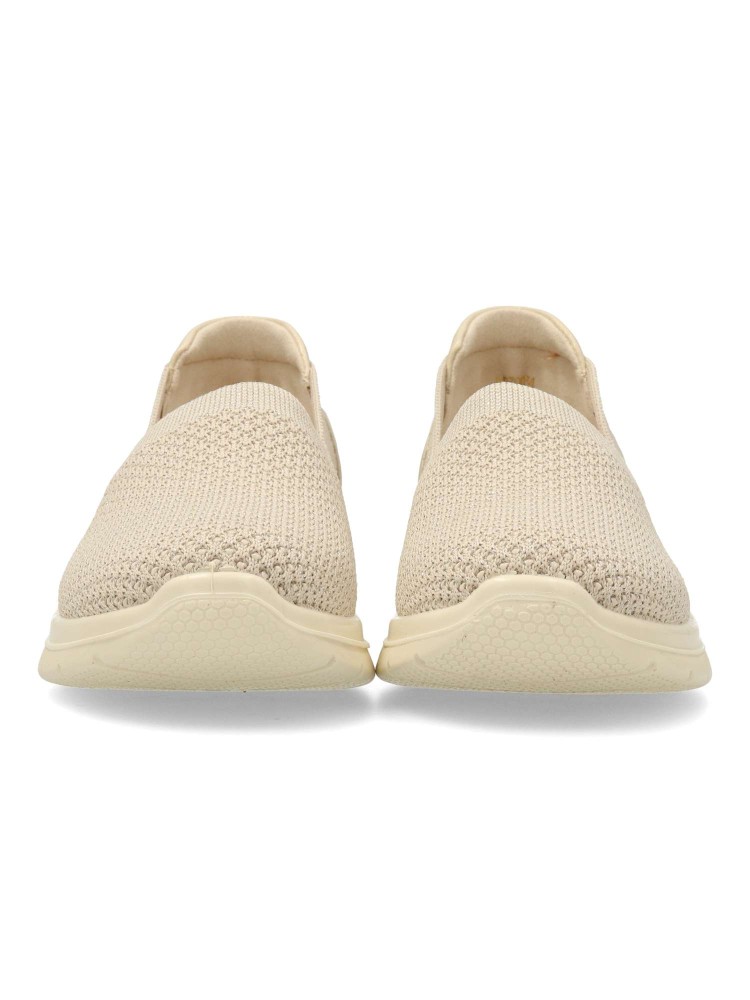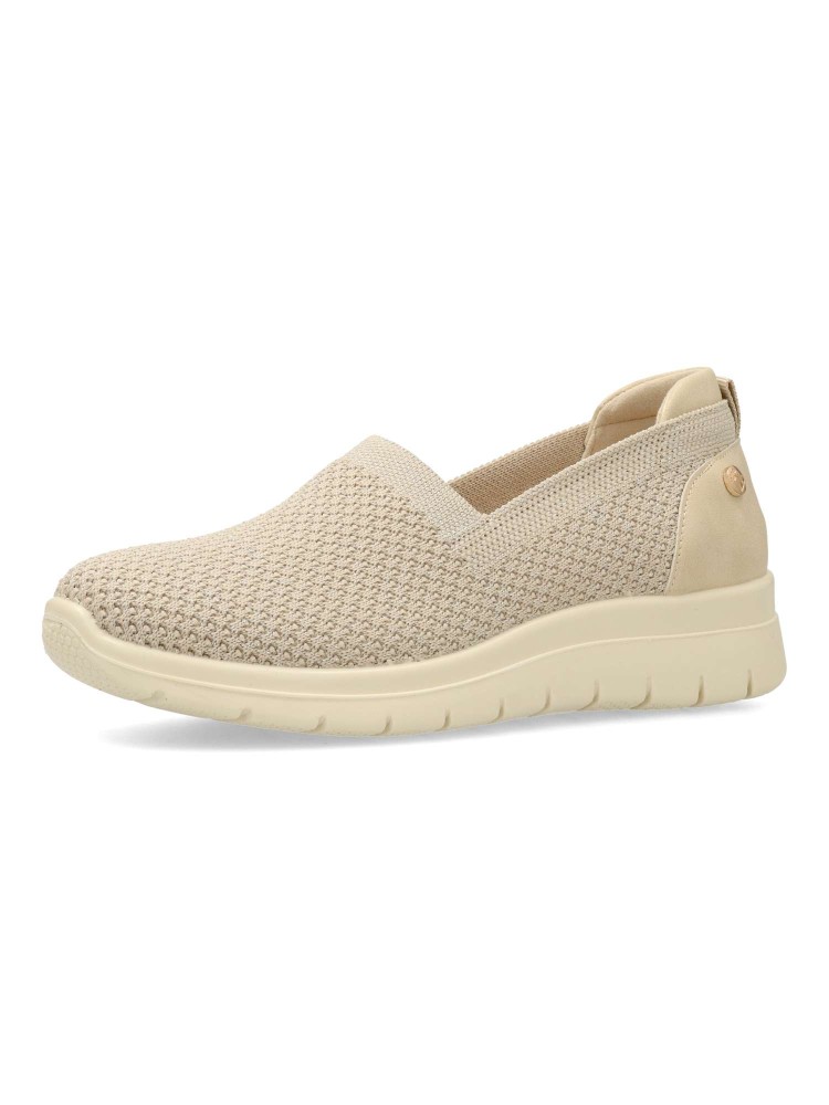 Zapato cómodo de mujer estilo casual. Fabricado en textil tipo calcetín. Suela de goma flexible y ligera. Plantilla acolchada y extraíble. Disponible en color beige. Modelo ligero y transpirable que ofrece máximo confort para uso diario. Amarpies.
