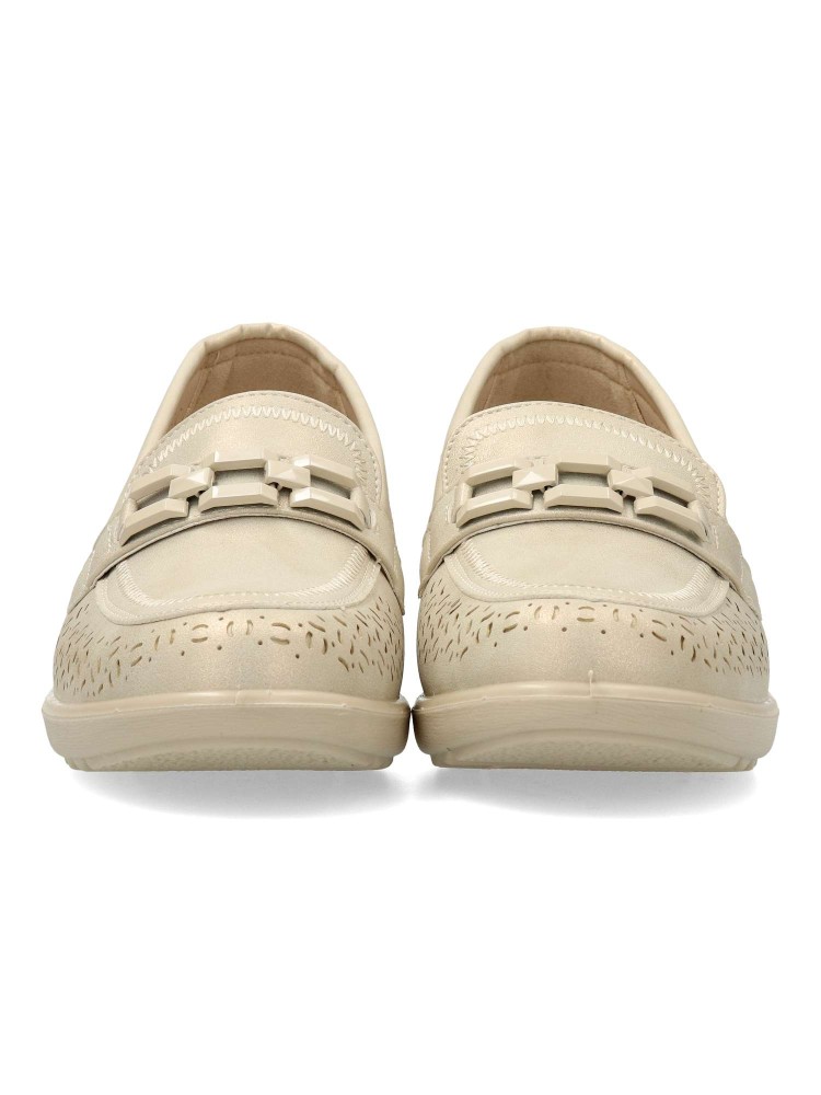 Zapato mocasín de mujer, estilo casual. Modelo cómodo, fabricado en piel sintética picada metalizada. Suela de goma ligera y flexible. Plantilla acolchada y extraíble. Color platino. Modelo versátil y elegante que dará el máximo confort en tu día a día.