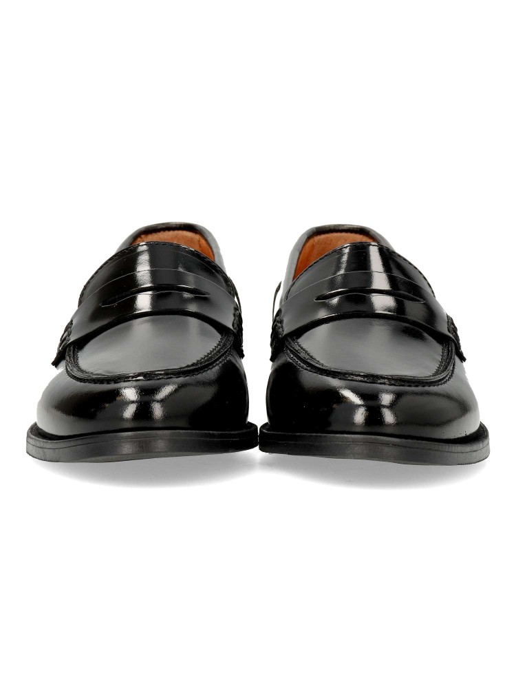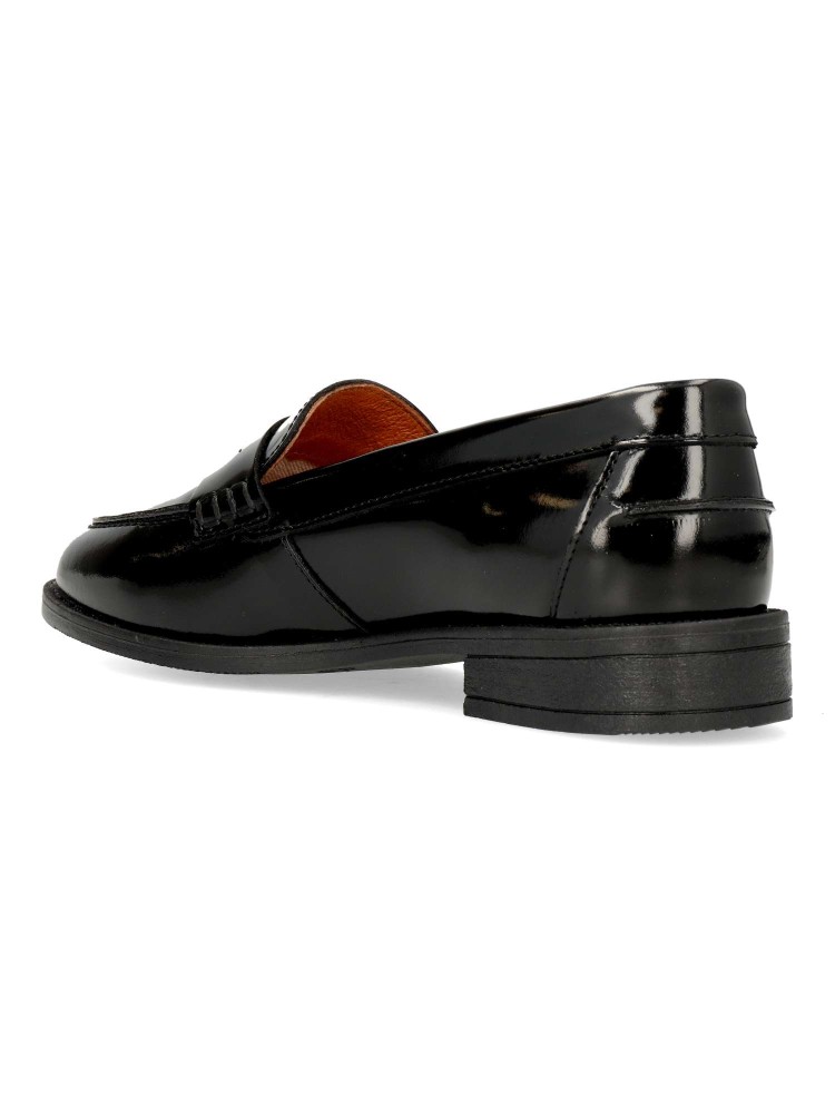 Mocasín cómodo de mujer. Loafers fabricado en piel de primera calidad con antifaz decorativo. Suela de goma flexible. Plantilla y forro de piel acolchada. Color negro charol. Mocasín de vestir, ideal para utilizar con uniformes o con tus looks de diario.