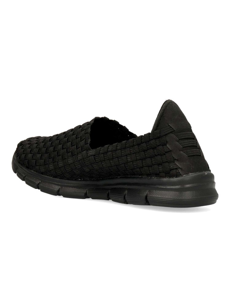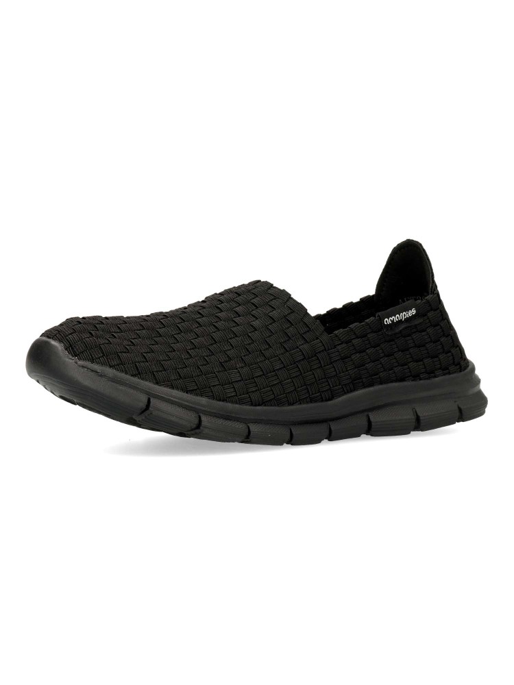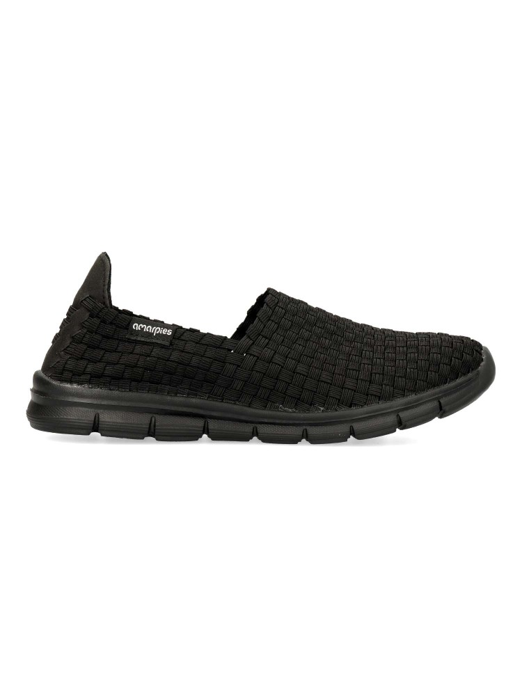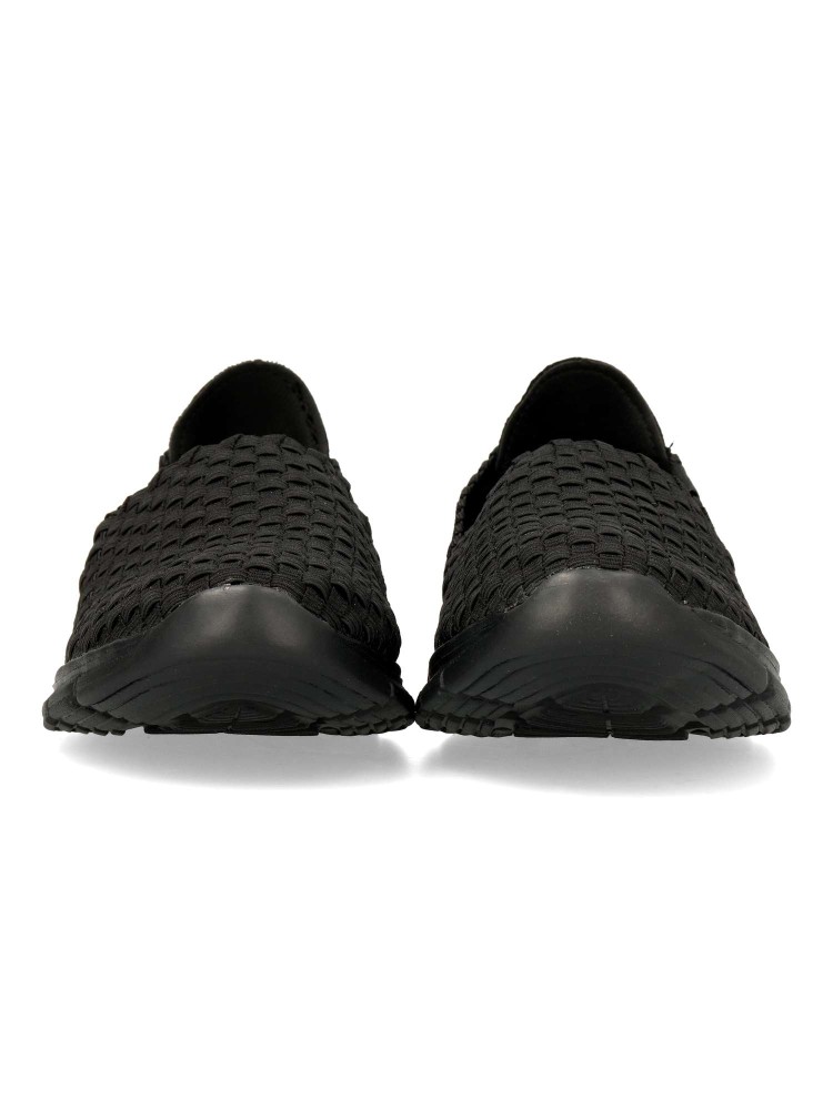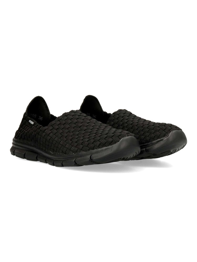 Zapato cómodo de mujer estilo casual. Fabricado con elásticos cruzados. Suela de goma flexible y ligera. Plantilla acolchada y extraíble Memory Sponge. Color negro. Modelo ligero y transpirable que ofrece máximo confort para uso diario. Amarpies.
