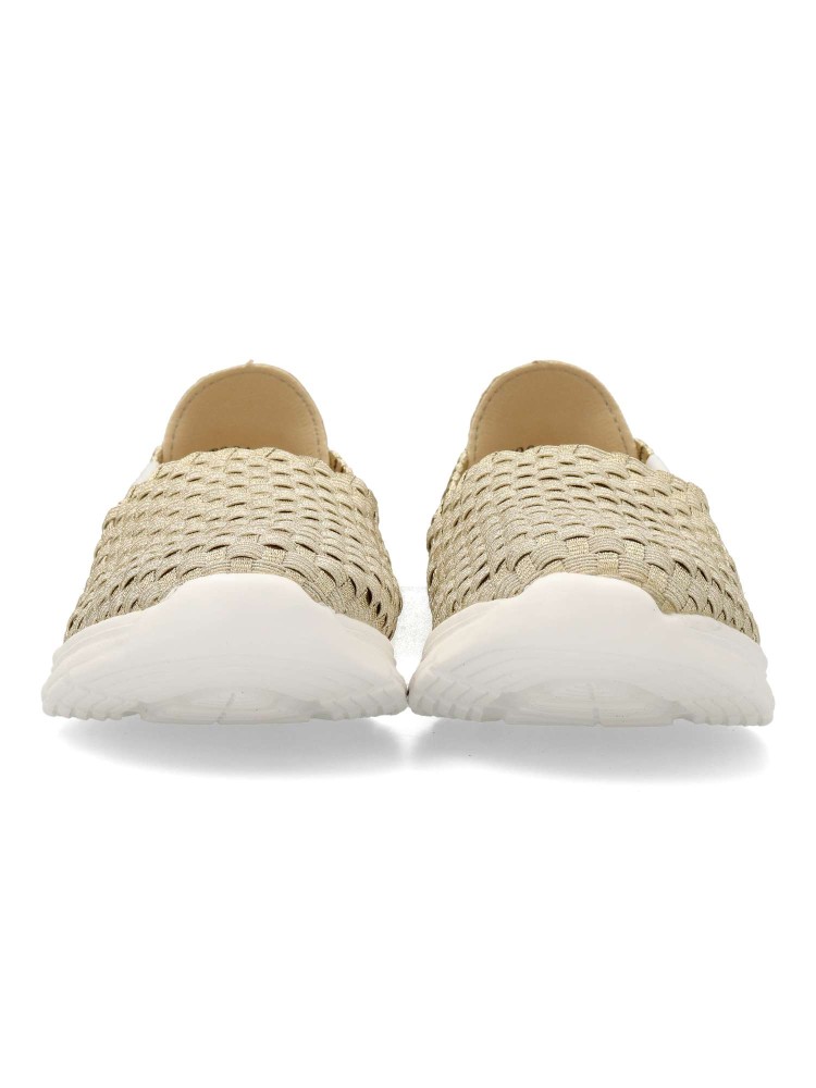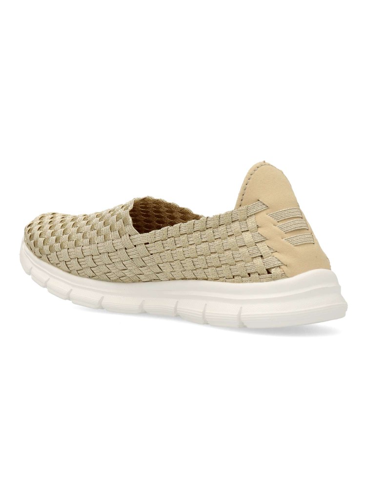 Zapato cómodo de mujer estilo casual. Fabricado con elásticos cruzados. Suela de goma flexible y ligera. Plantilla acolchada y extraíble Memory Sponge. Color platino. Modelo ligero y transpirable que ofrece máximo confort para uso diario. Amarpies.