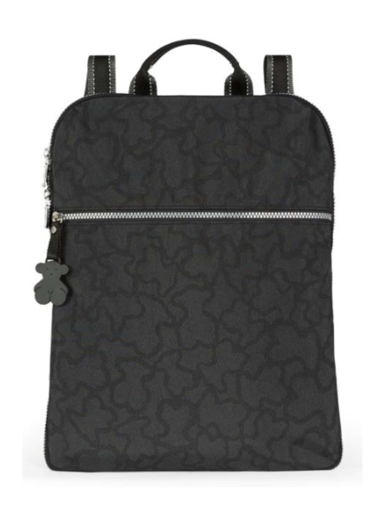 Mochila de tejido hidrófugo, nylon y estampado Kaos New combinado con piel bovina. Color antracita-negro. Bolsillos exteriores: uno con cierre cremallera. Bolsillos interiores: uno con cierre cremallera, dos sin cierre. Medidas: 41x32x13 cm.