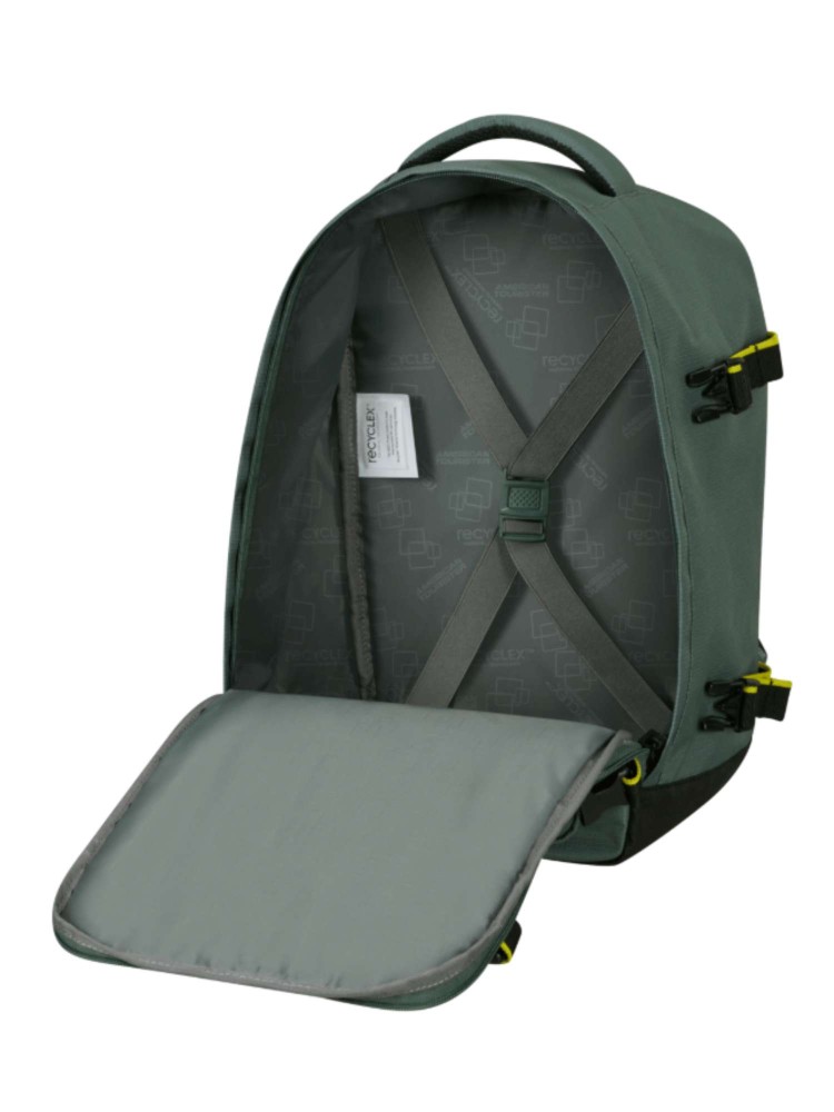 Mochila de cabina TAKE2CABIN. Tecnología de tejido 100% Recyclex, fabricada a partir de botellas de PET recicladas. Dimensiones: 40 x 25 x 20 centímetros. Volumen: 24,2 litros. Peso: 0,46 kilogramos.