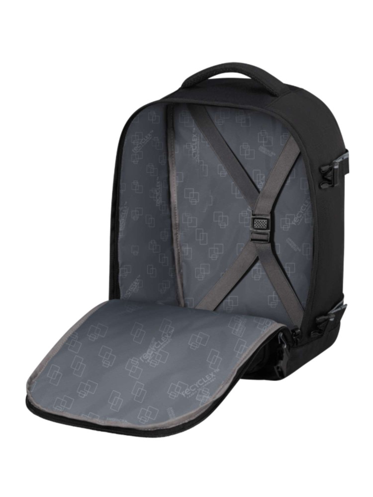 Mochila de cabina TAKE2CABIN. Tecnología de tejido 100% Recyclex, fabricada a partir de botellas de PET recicladas. Dimensiones: 40 x 25 x 20 centímetros. Volumen: 24,2 litros. Peso: 0,46 kilogramos.