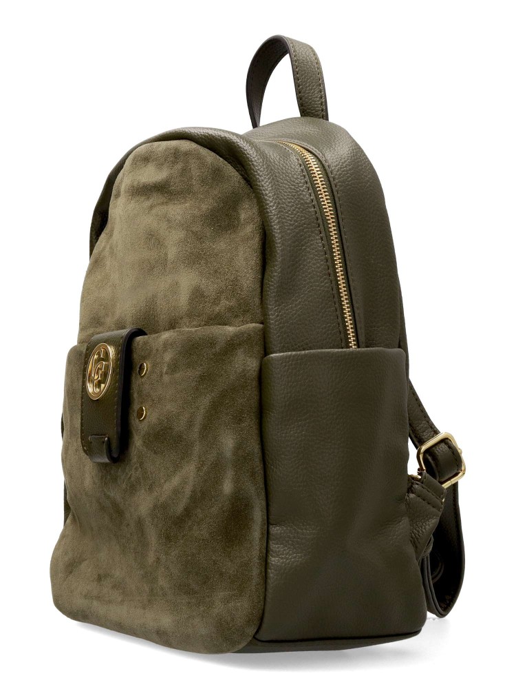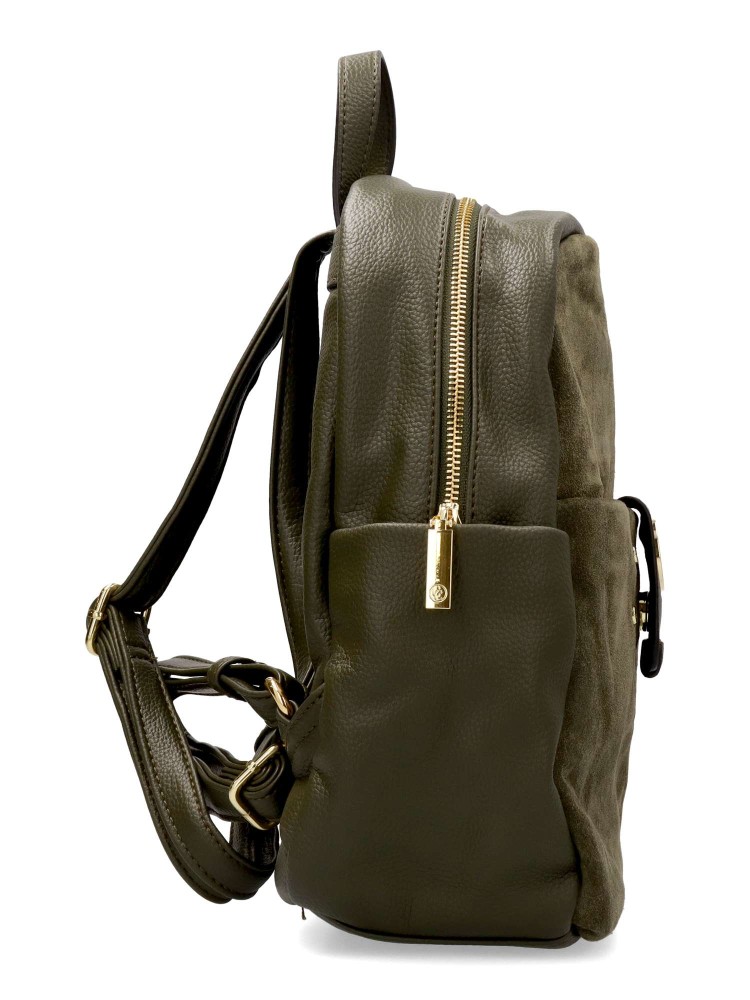 Mochila de Carmela, fabricada en serraje combinado que aporta un contraste elegante y moderno. Cierre de cremallera. Versátil y funcional, es ideal para complementar cualquier look. Medidas: 35 x 28 x 16 cm. Con 7 bolsillos.