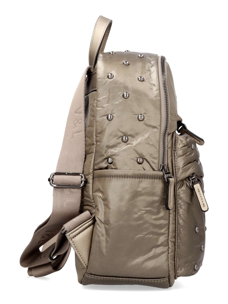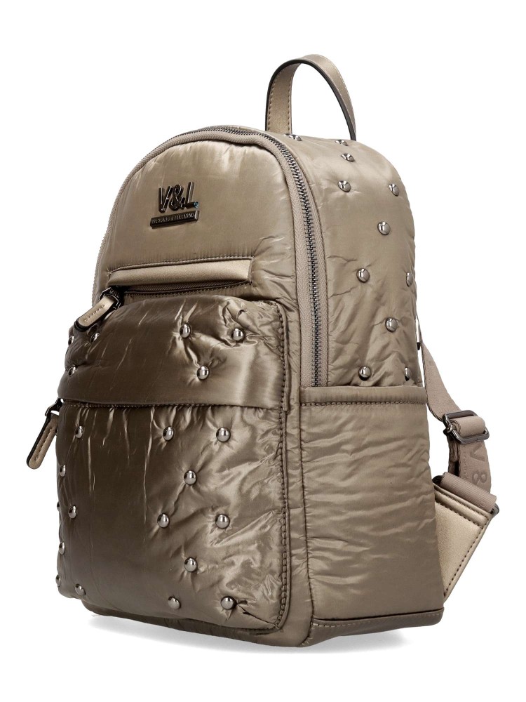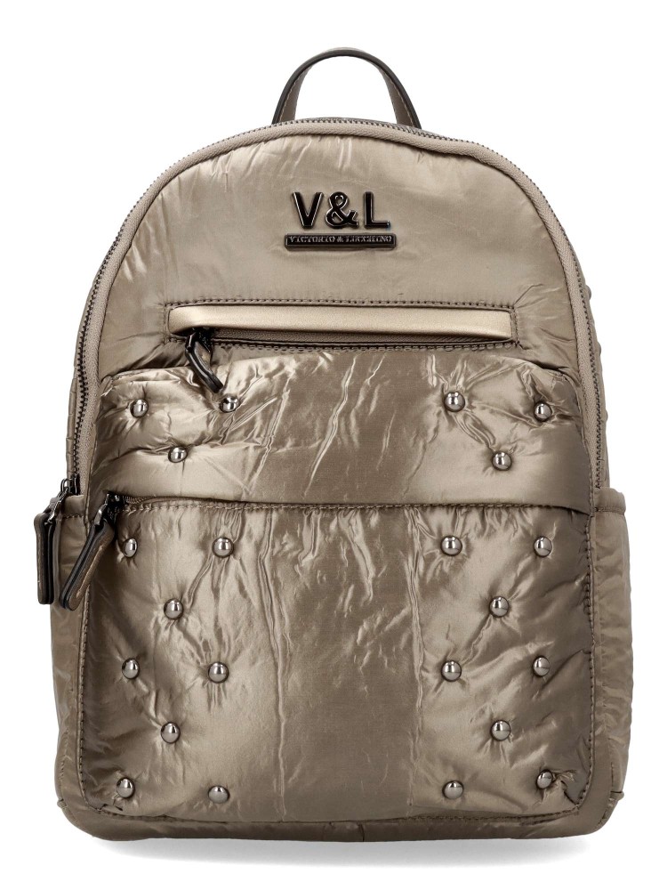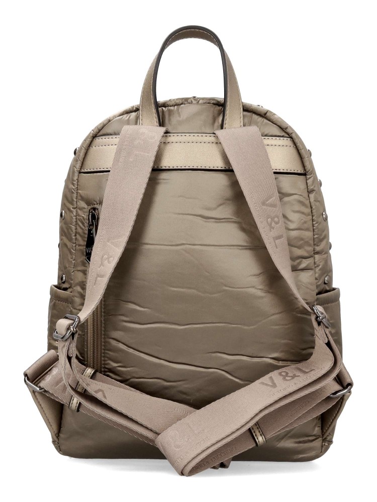 La Victorio & Lucchino Gina Taupe V&L 501 es una mochila femenina de nylon con acabado satinado y detalles metálicos decorativos, ideal para combinar moda y funcionalidad. Medidas aproximadas: 30 x 25 x 12 cm.