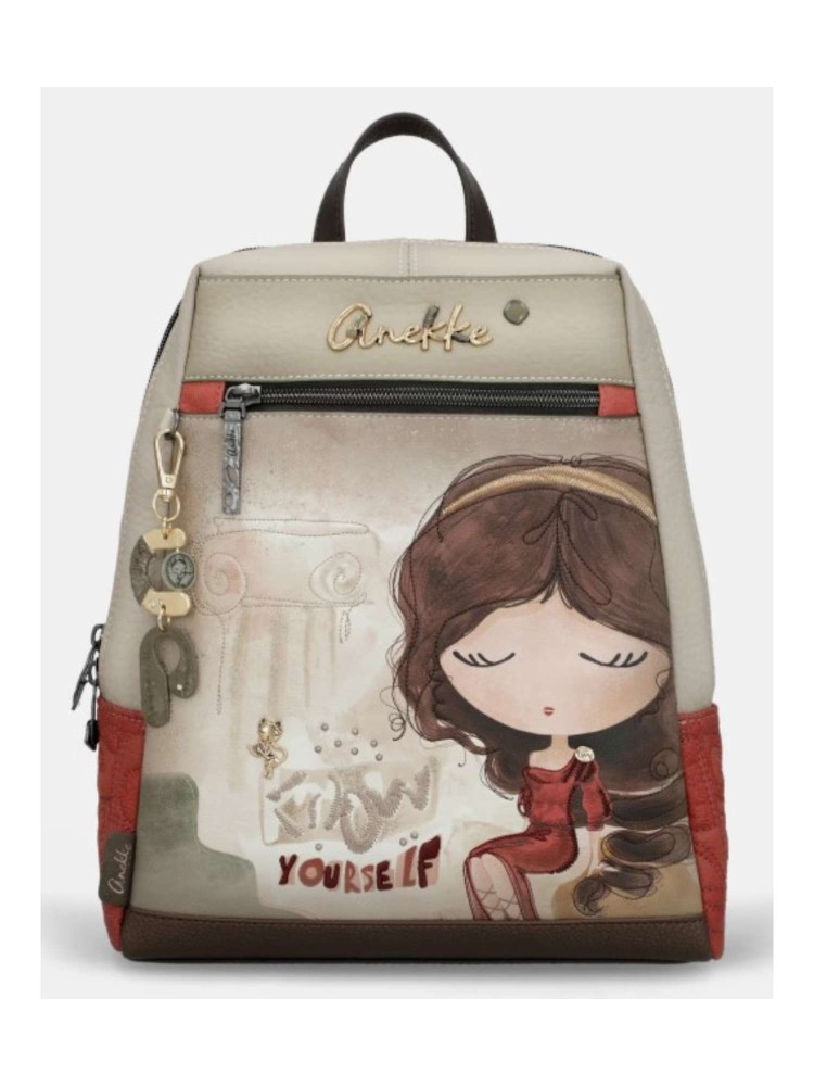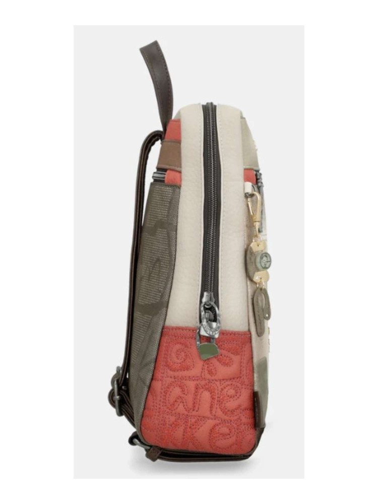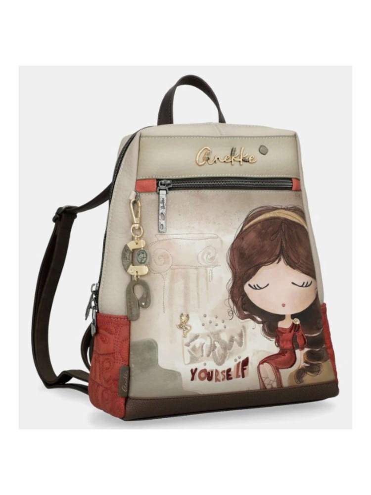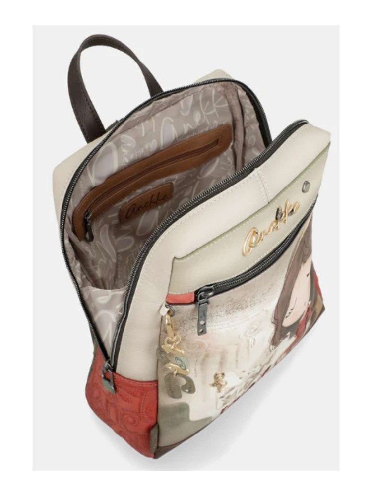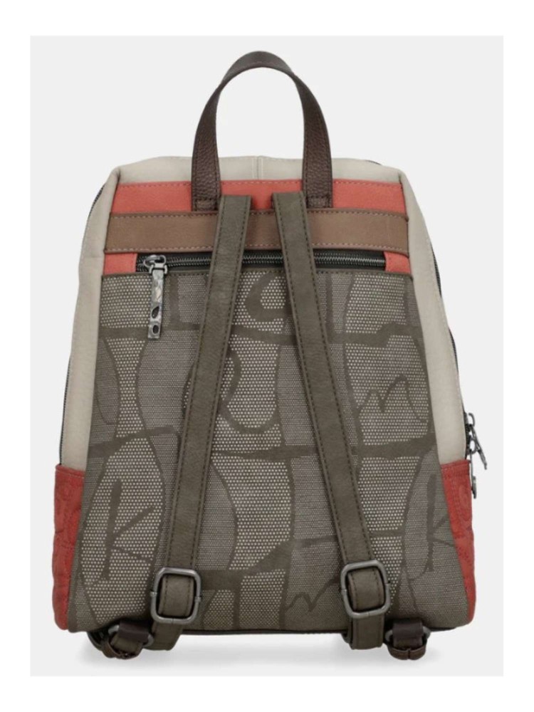 Bolso mochila con cierre de cremallera. Un bolsillo frontal, uno trasero y bolsillo interior con cremallera para el movil. Medidas (Largo x Alto x Ancho): 30 cm / 33 cm / 10 cm.