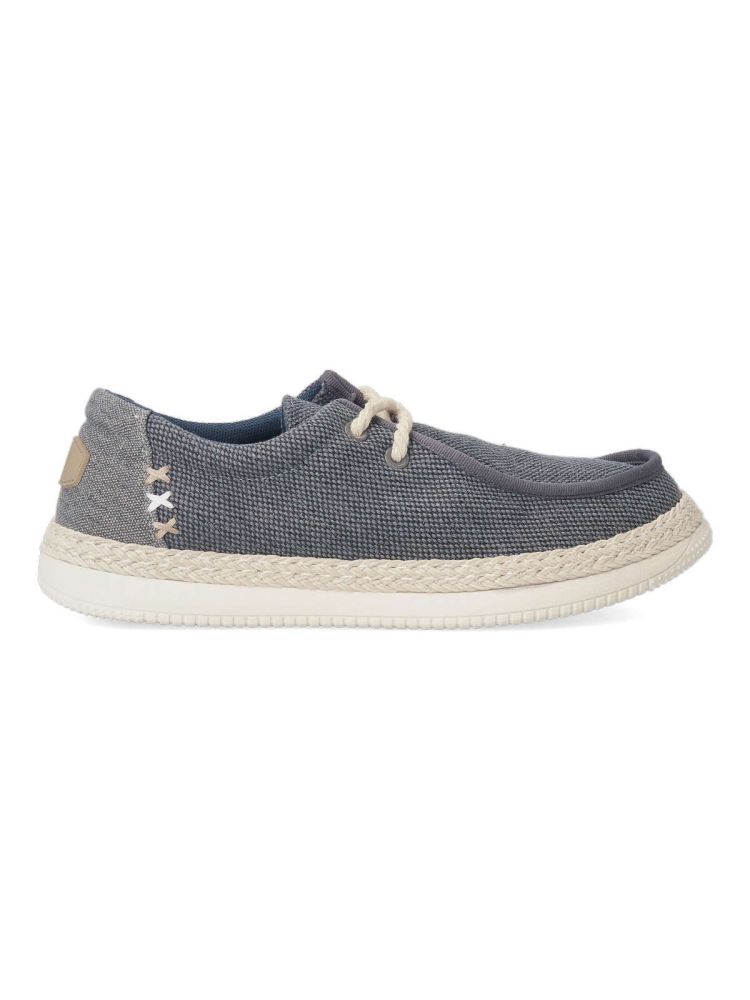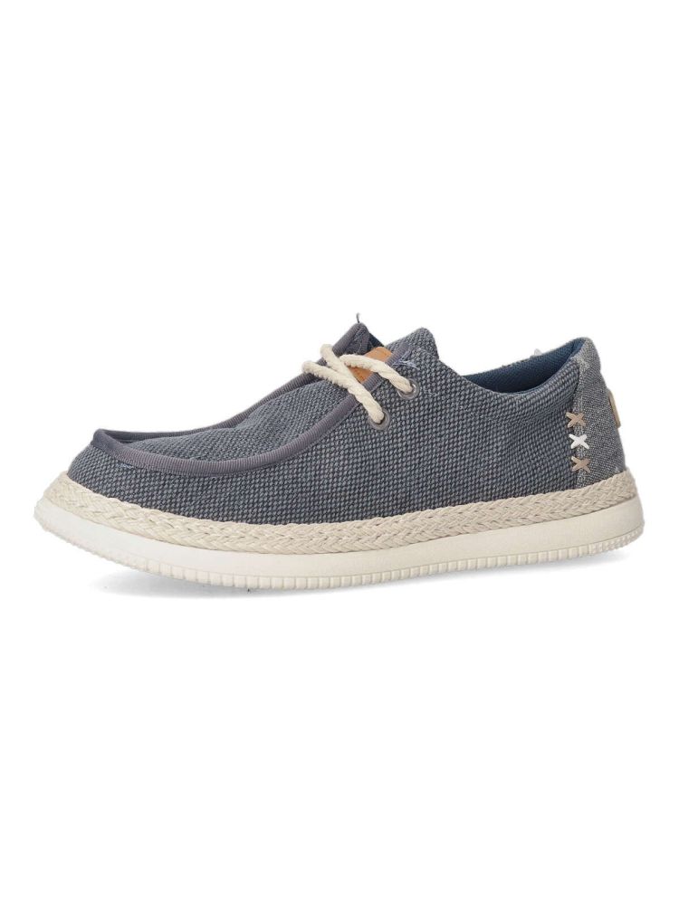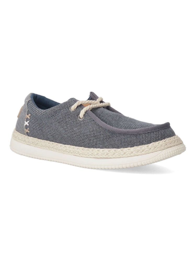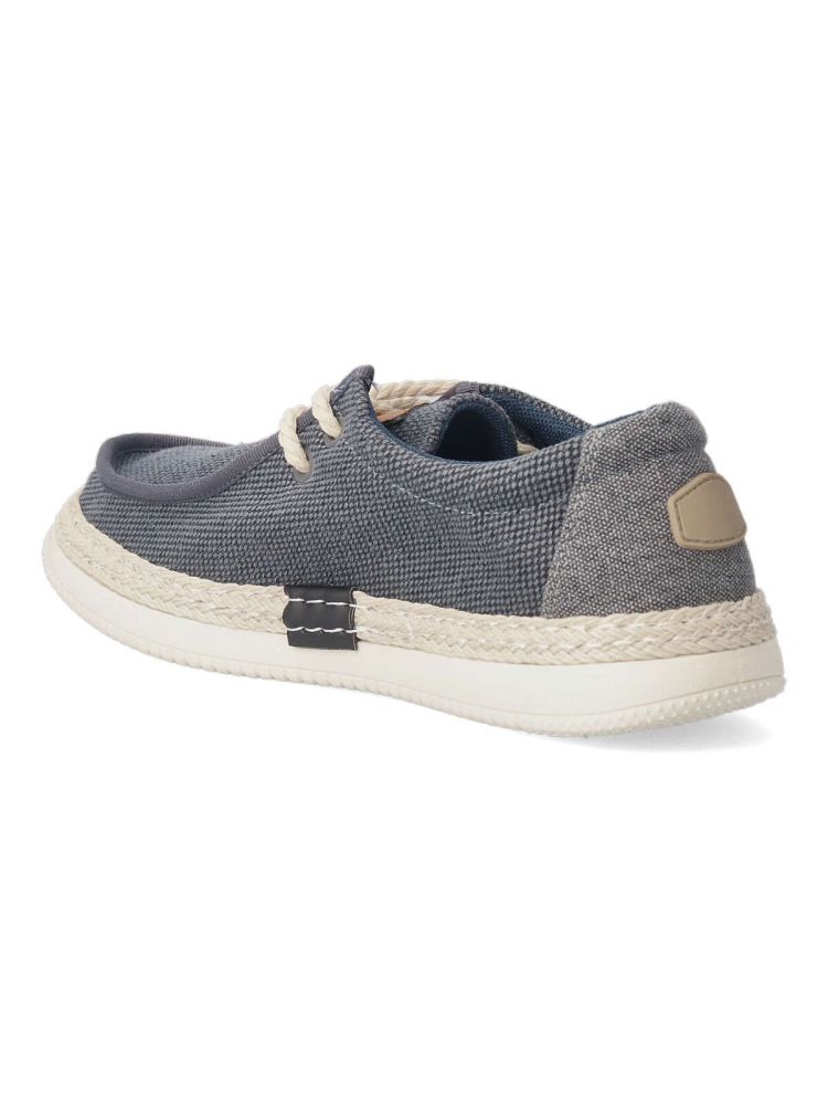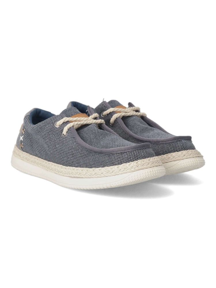 Zapato wallabee de hombre, estilo casual. Cierre de cordones. Fabricado en textil, con suela de goma ligera y flexible. Plantilla acolchada y extraíble. Detalle cuerda trenzada alrededor de la suela. Color marino. Tipo náutico muy fácil de combinar.