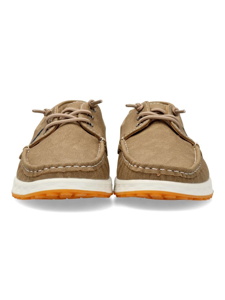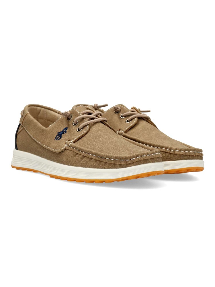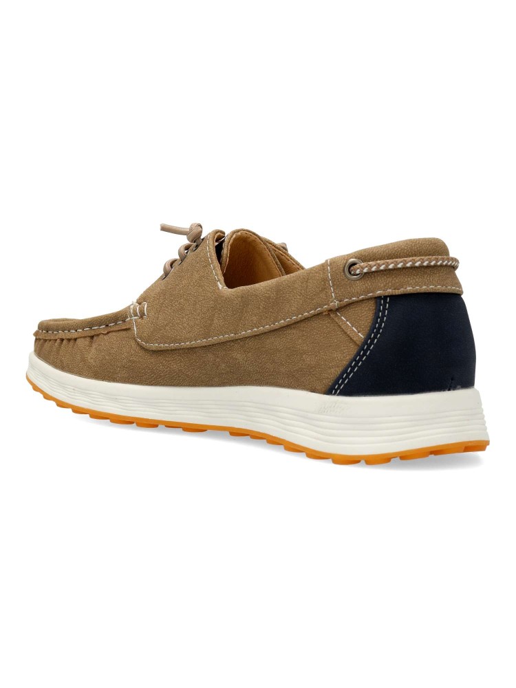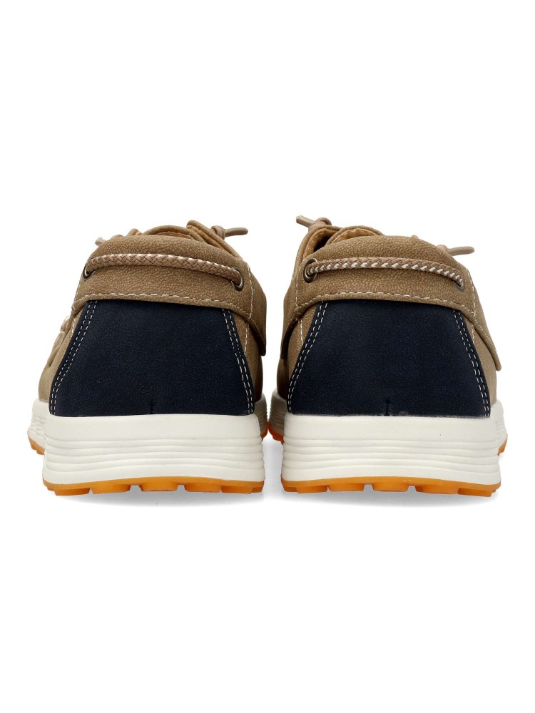 Zapato náutico de hombre, con cierre de cordón elástico. Modelo cómodo, fabricado en material sintético, con suela de goma ligera y flexible. Disponible en color kaki-marino. Zapato de vestir ideal en tu día a día.