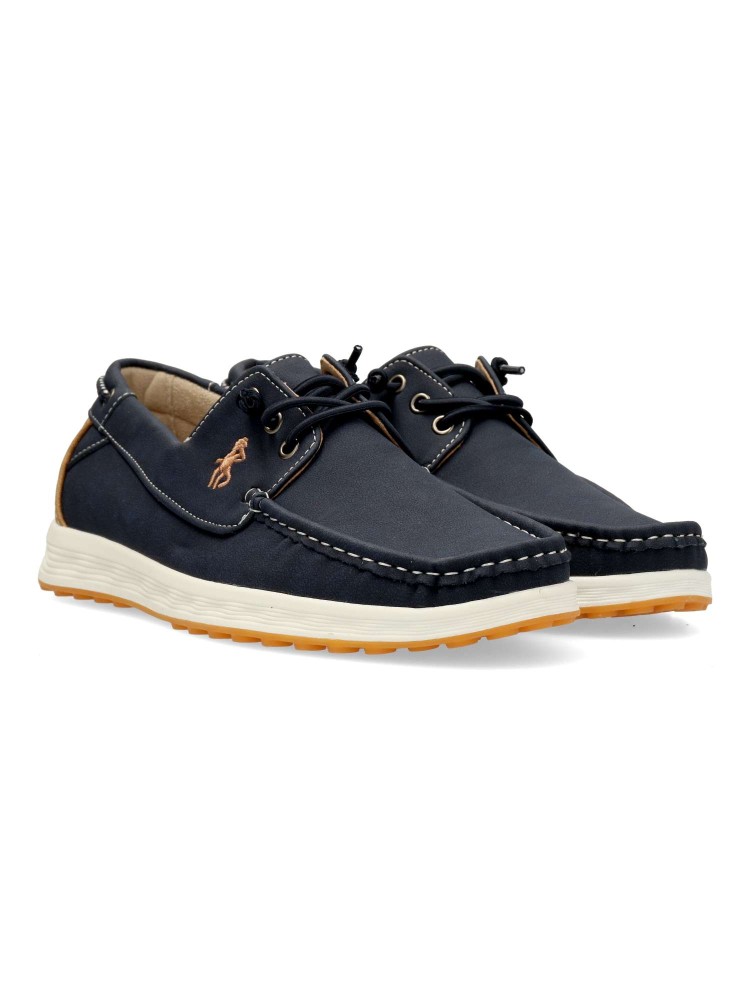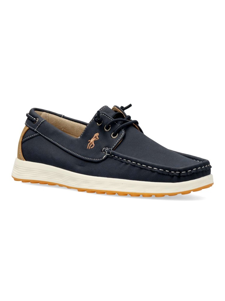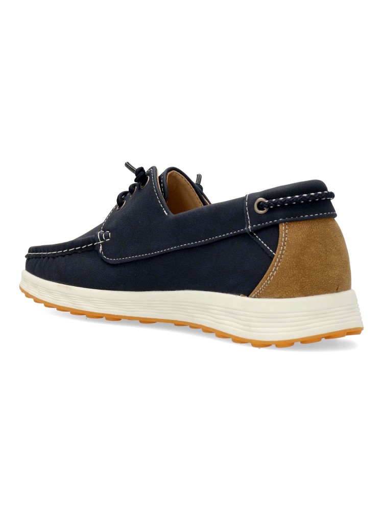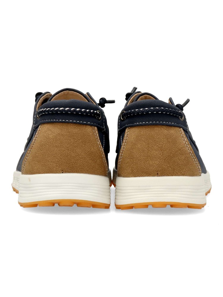 Zapato náutico de hombre, con cierre de cordón elástico. Modelo cómodo, fabricado en material sintético, con suela de goma ligera y flexible. Disponible en color marino-camel. Zapato de vestir ideal en tu día a día.