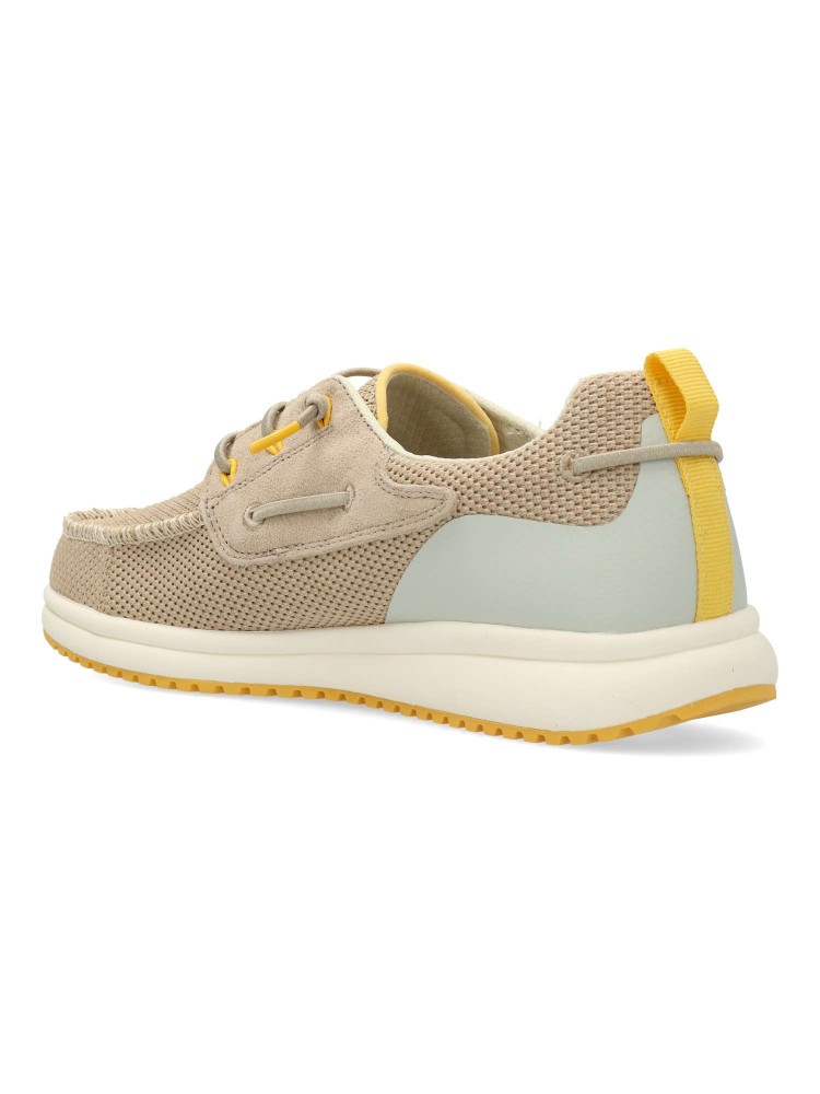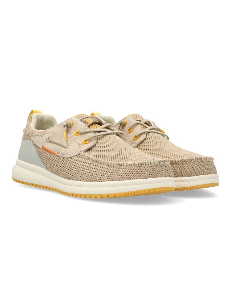 El modelo Bay en color beige de hombre es un calzado tipo náutico de diseño contemporáneo y funcional. Está confeccionado con materiales textiles reciclados. Ultraligero y flexible, reinventa el estilo náutico con una estética moderna para el día a día.