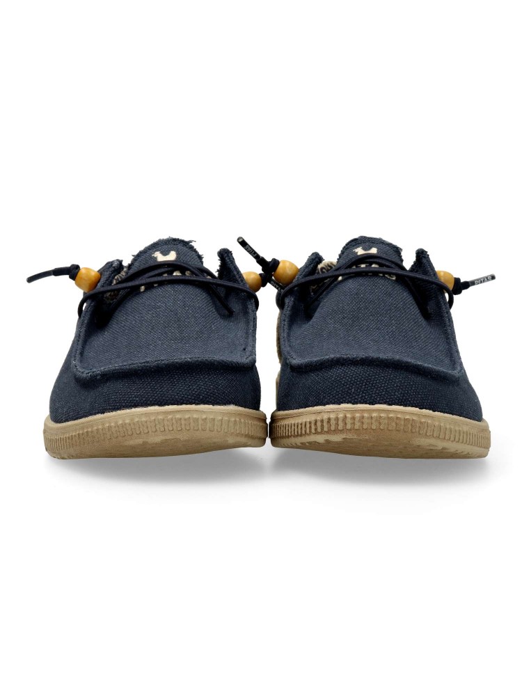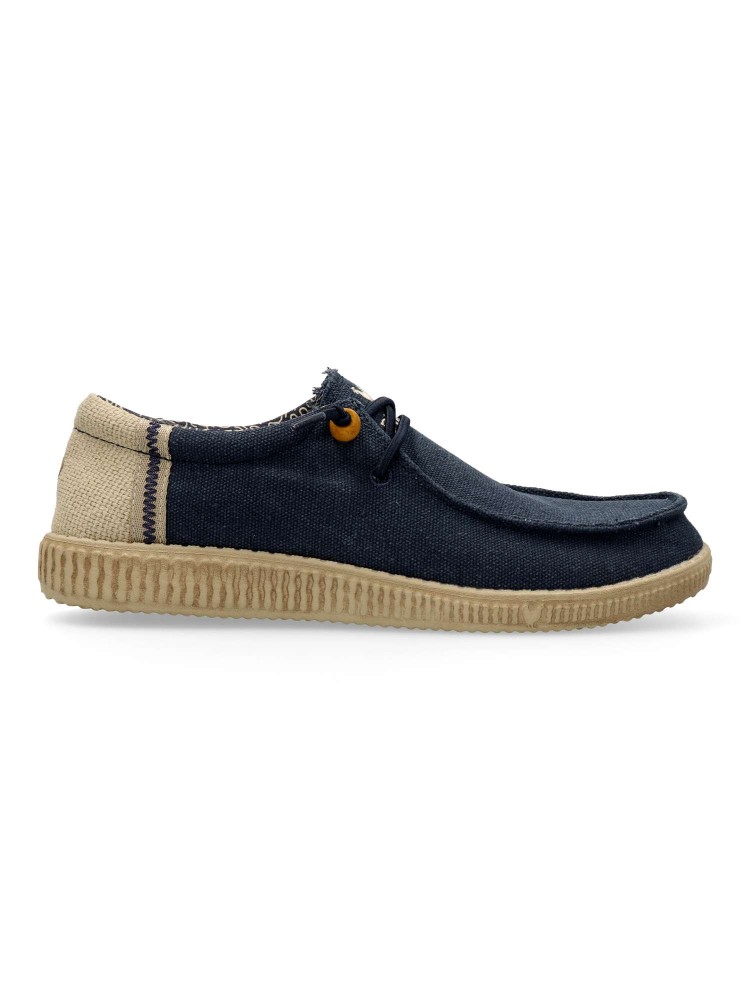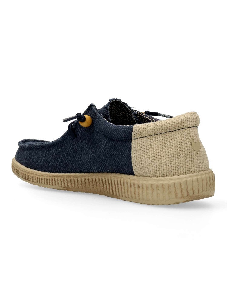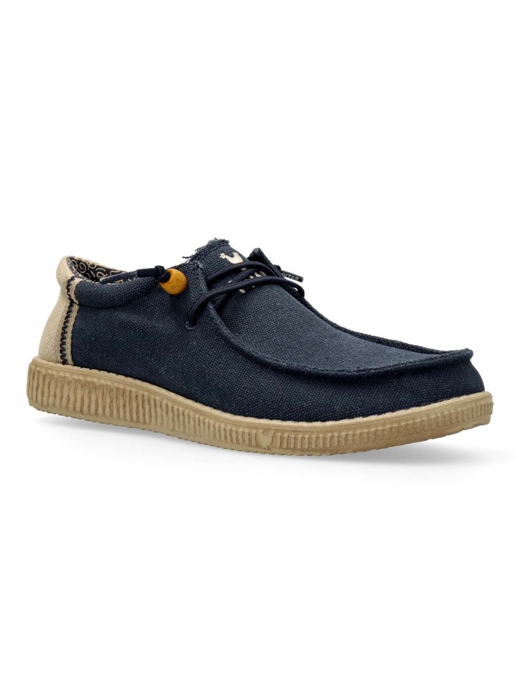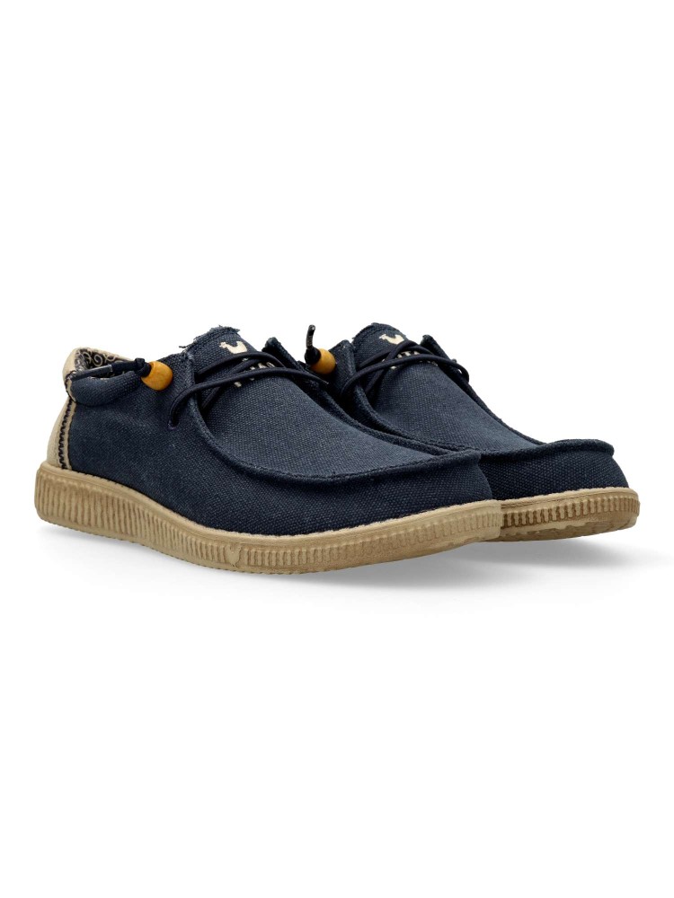 El modelo WP150 Ryan en color marino de hombre es un calzado tipo wallabee. Confeccionado en mezcla de algodón y lino. Es ultraligera y flexible, destacando por su alta capacidad para regular la temperatura y ofrecer una comodidad fresca y natural.