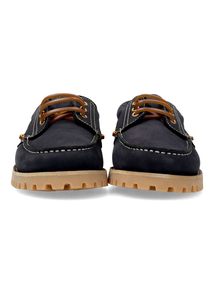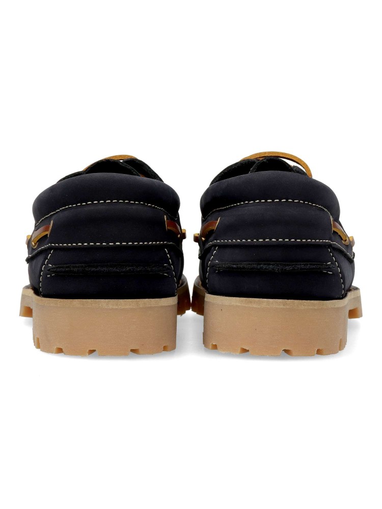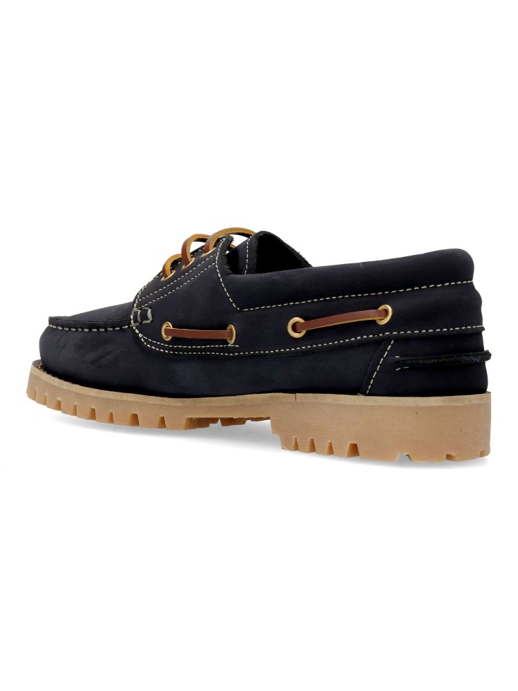Zapato náutico de hombre, con cierre de cordones. Fabricado en piel nobuck, con suela de goma color caramelo. Forro interior y plantilla de piel. Color marino. Náutico de vestir, cómodo, clásico y elegante, que no te puede faltar en tu fondo de armario.
