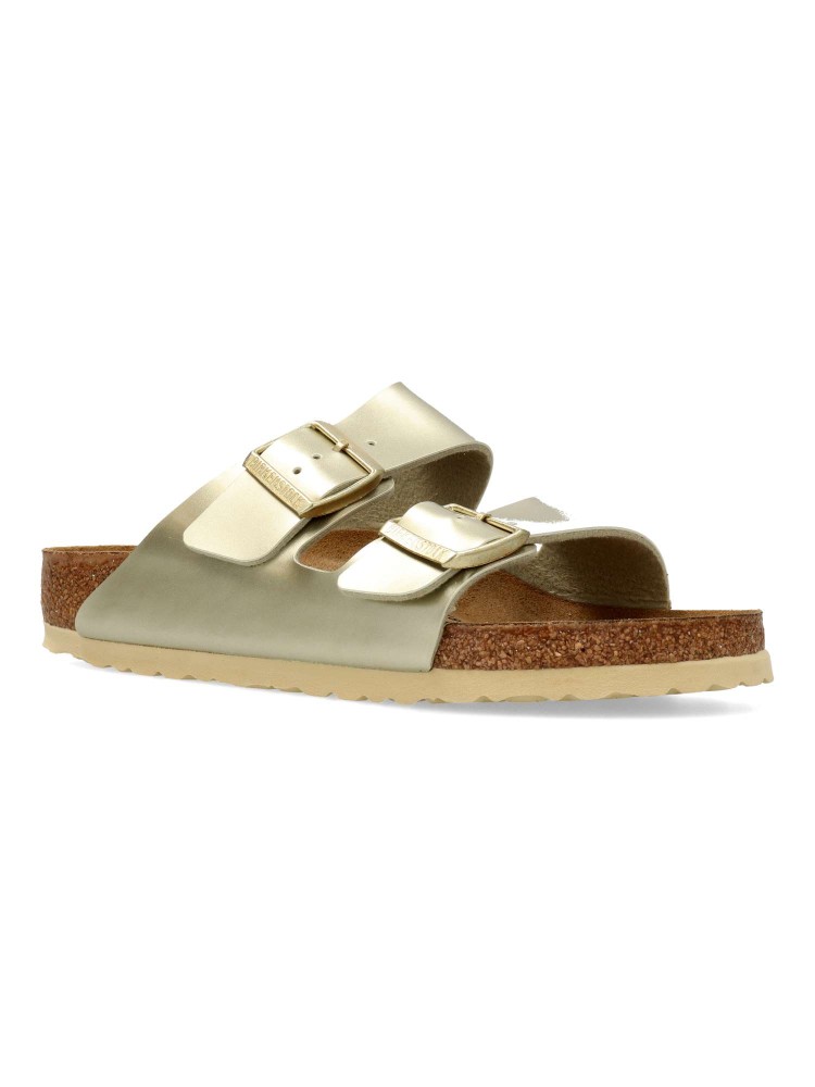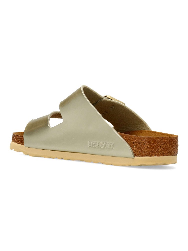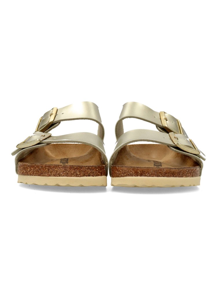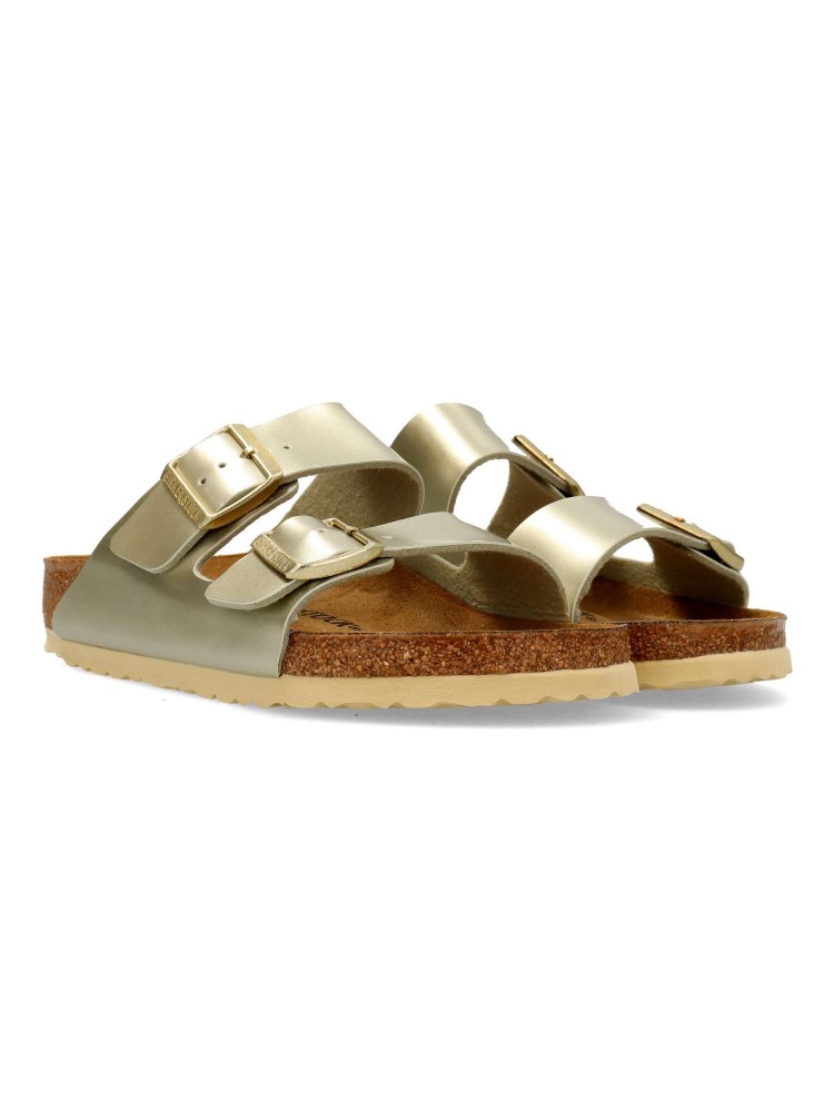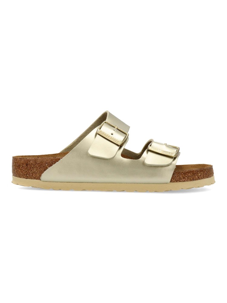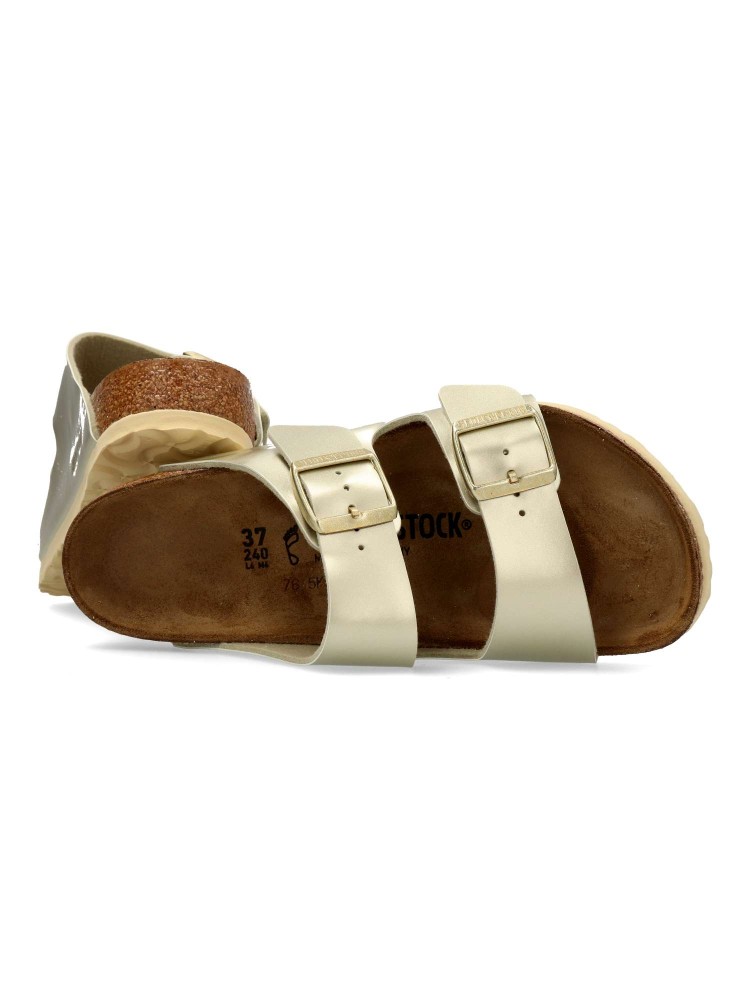 Sandalia bio con plantilla blanda original BIRKENSTOCK; anatómica. Cierre de dos hebillas al empeine. Material superior: Birko-Flor®. Planta de piel con suela goma EVA. Color oro. Made in Germany.