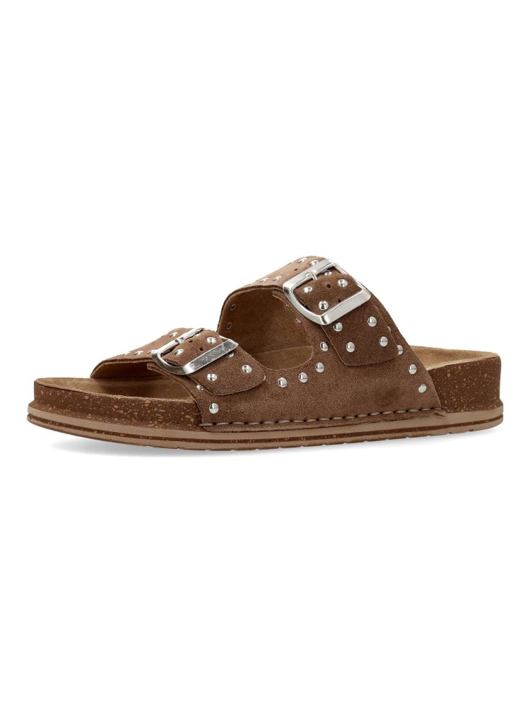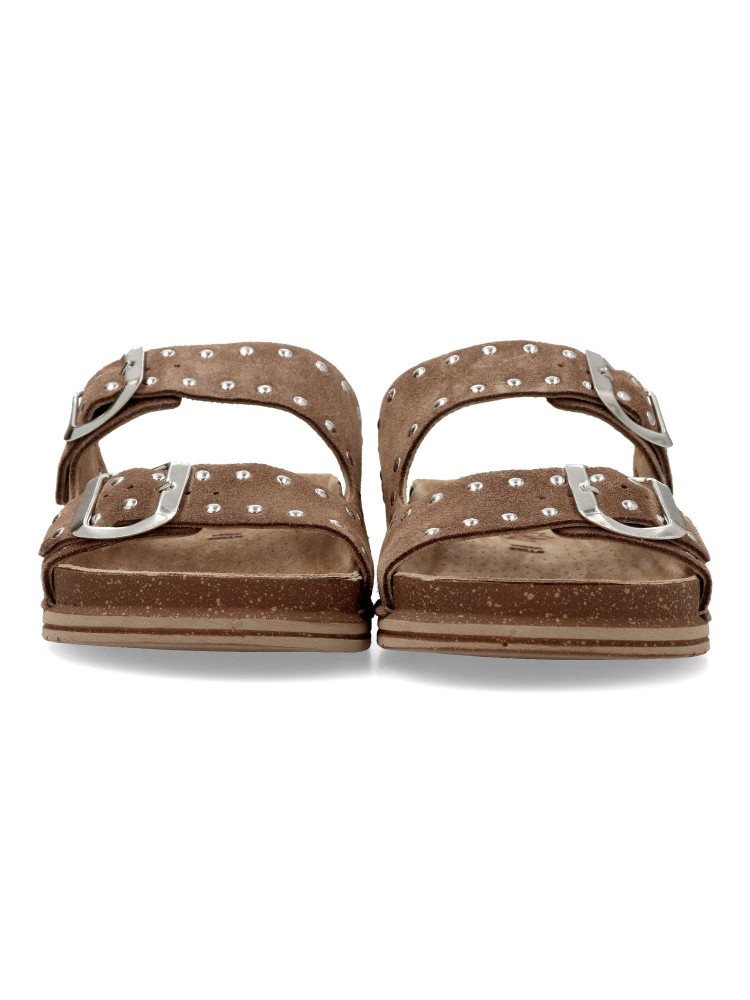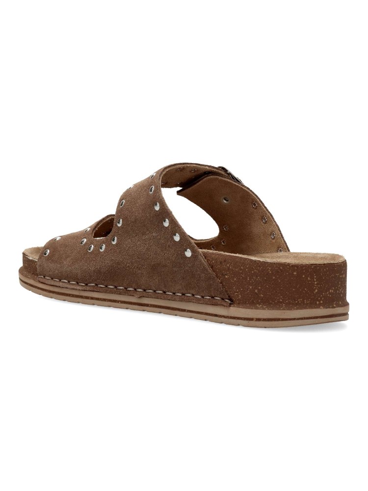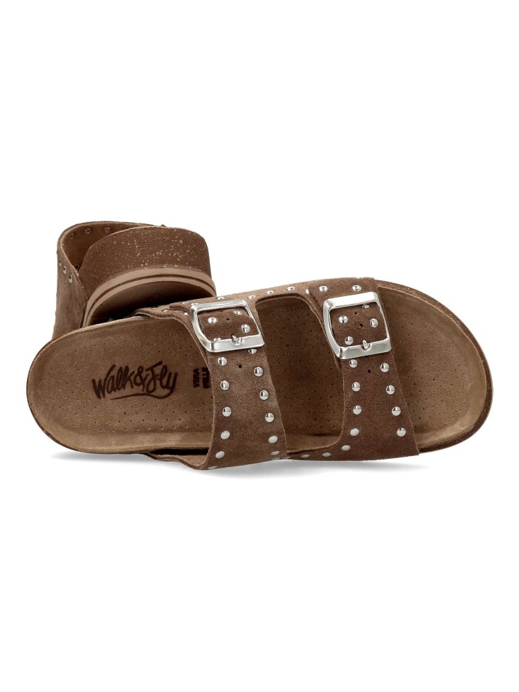 Sandalia cómoda de mujer fabricada en piel de primera calidad, con suela de goma. Cosidas a mano. Modelo tipo bio con cierre de hebillas y tachas decorativas. Planta de piel acolchada. Color taupe. Diseño original y confort hechos para ti. Walk & Fly.