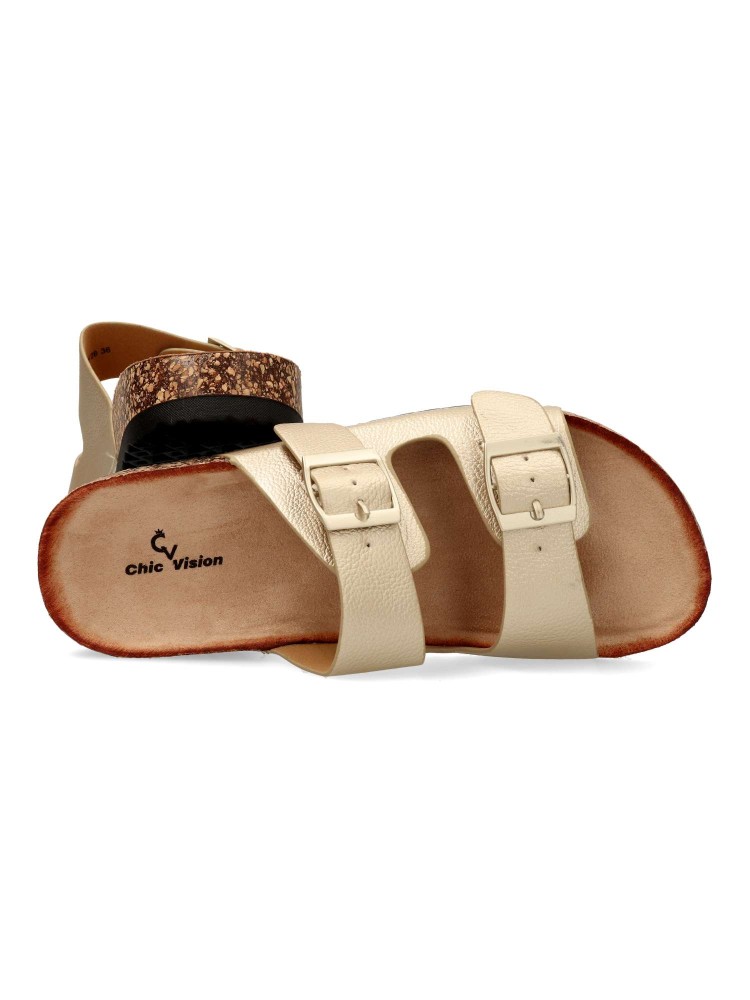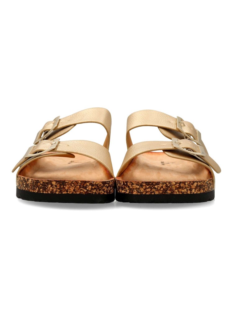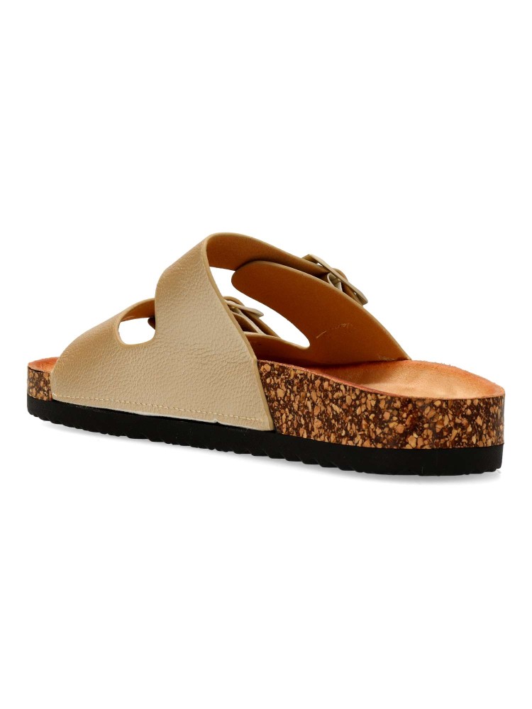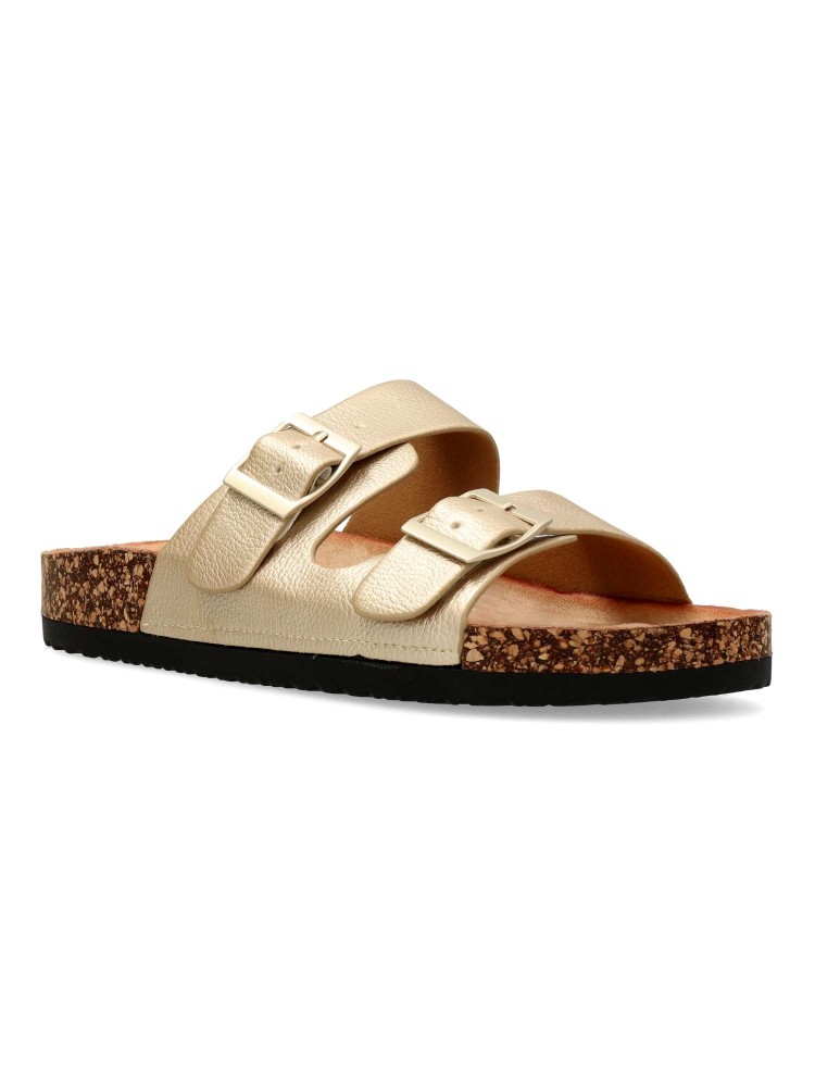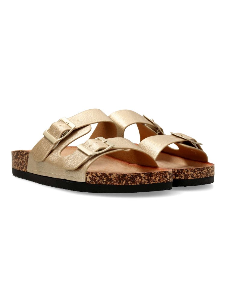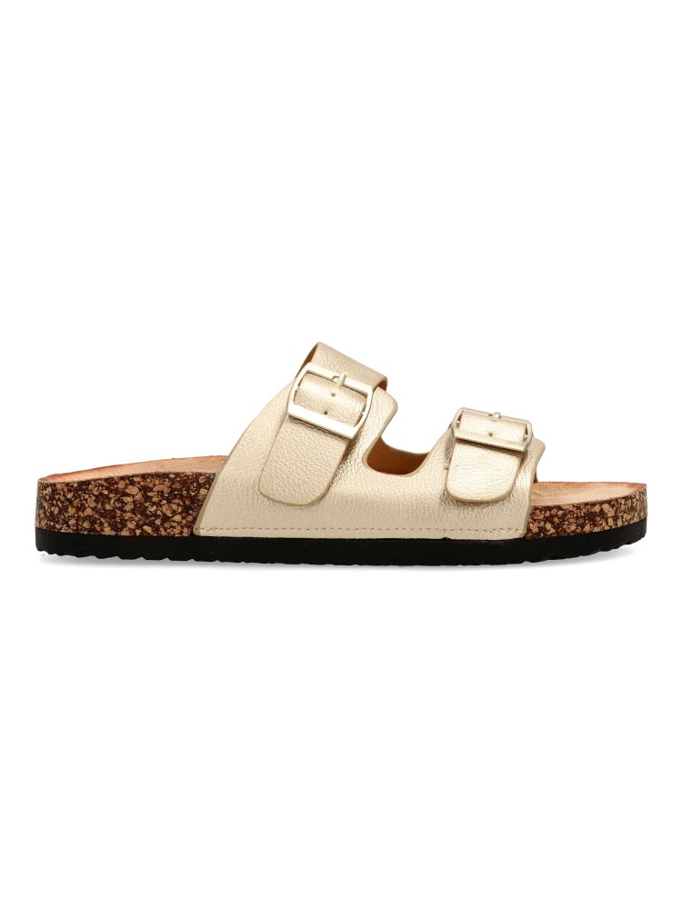 Sandalia de mujer tipo bio. Pala ajustable con doble hebilla. Modelo cómodo, fabricado en material sintético con suela de goma flexible. Planta anatómica acolchada. Color oro. Modelo fresco y confortable que no te puede faltar con tu outfit de verano.