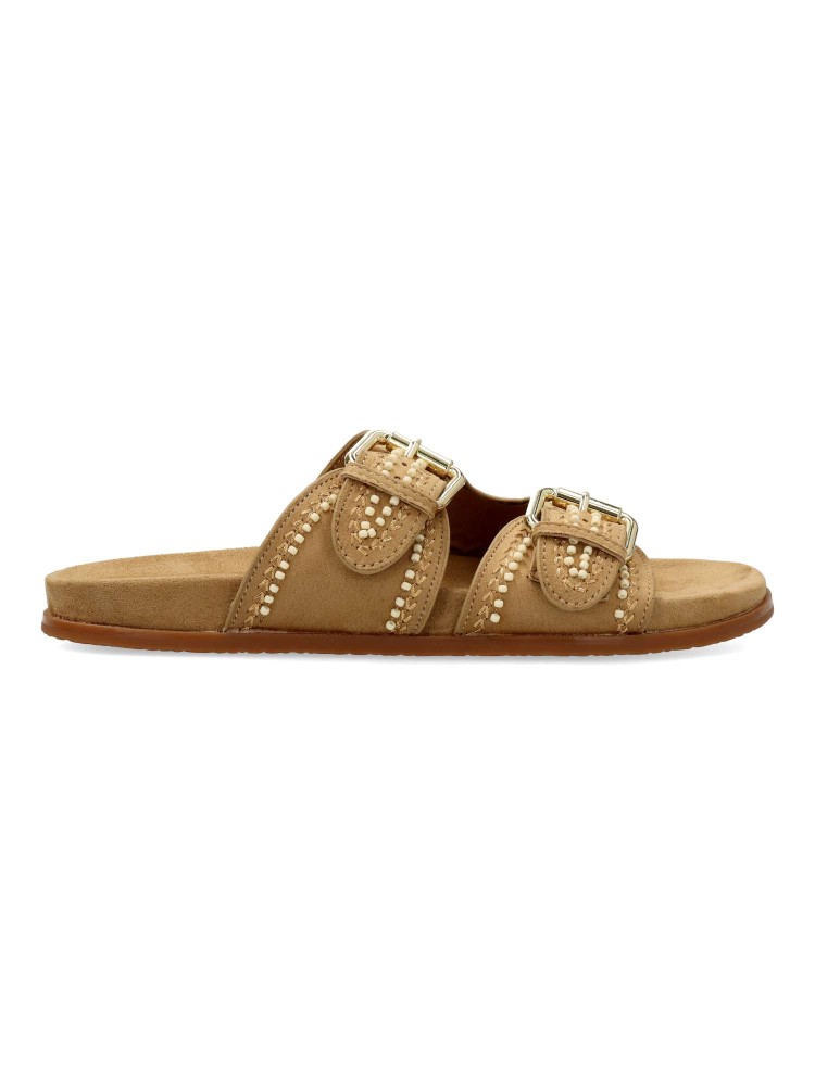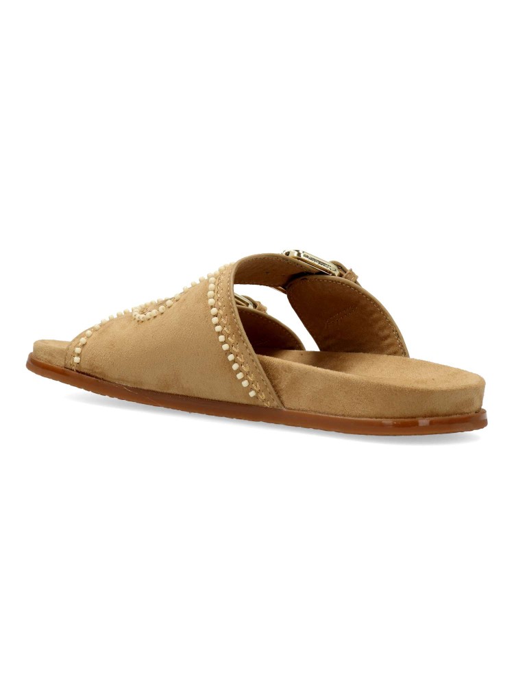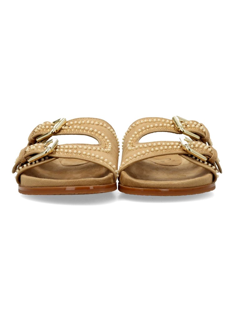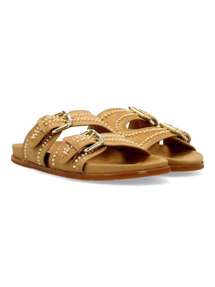 Sandalia de mujer tipo bio. Pala ajustable con doble hebilla. Modelo cómodo, fabricado en antelina aterciopelada, con suela de goma. Planta anatómica acolchada. Color café. Modelo fresco y versátil, con los que disfrutarás de tus paseos de verano.
