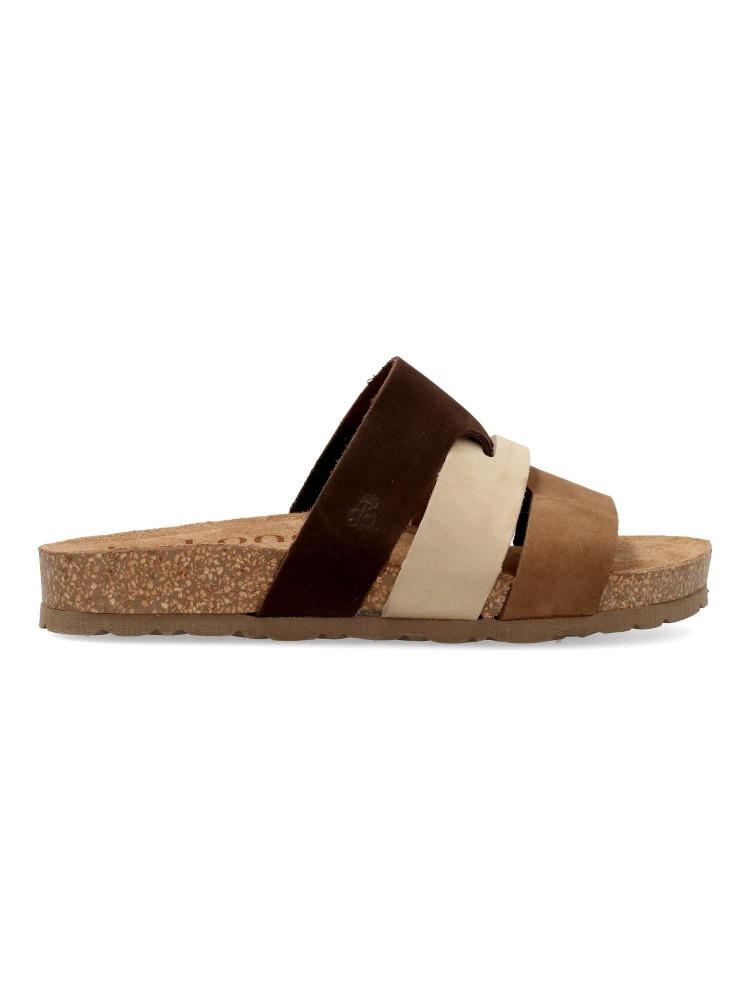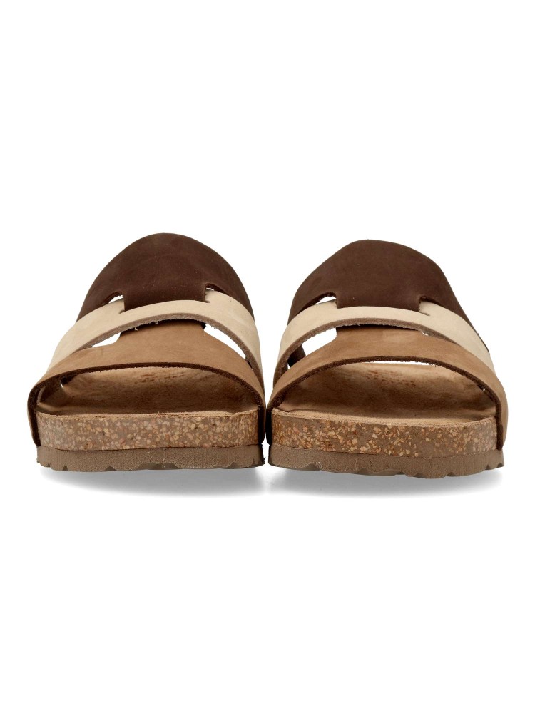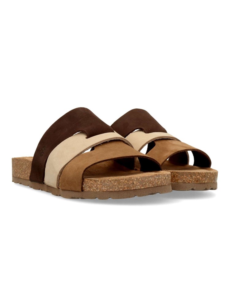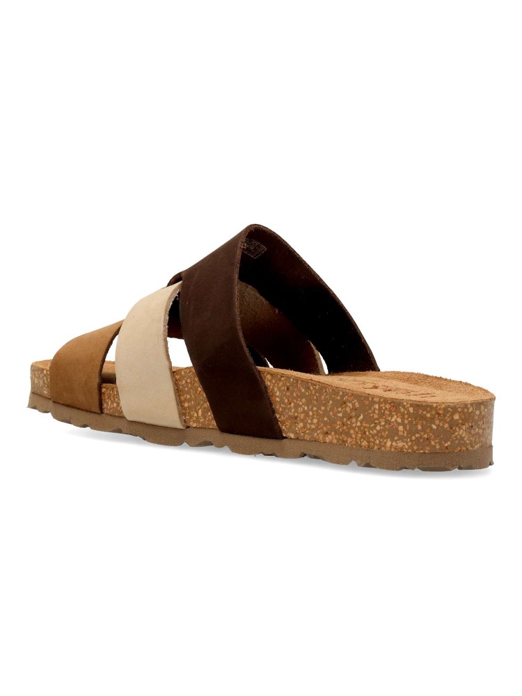 Sandalia mujer de tiras, fabricada en piel nobuck. Sandalia de pala, con planta de piel acolchada. Suela de corcho y goma eva, al mejor estilo Yokono. Color marrón-beige. Ideal con tus looks de verano. Hecho en España.