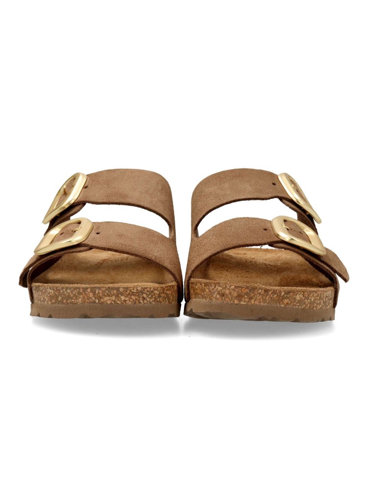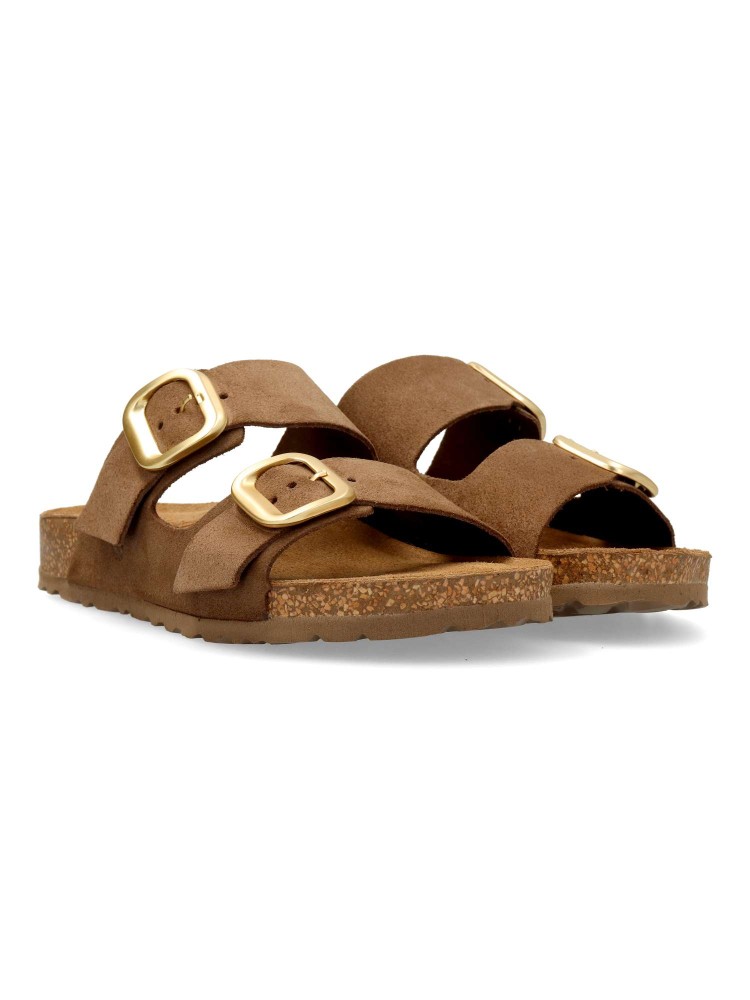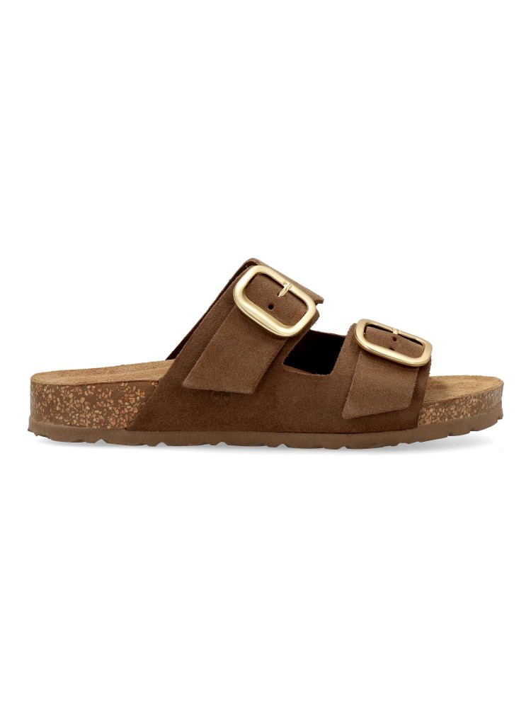 Sandalia bio de mujer con ajuste de hebillas. Fabricada en piel serraje. Planta de piel acolchada. Suela de corcho sobre EVA, al mejor estilo Yokono. Diseño versátil y cómodo, aportando un toque elegante a cualquier conjunto casual. Hecho en España.