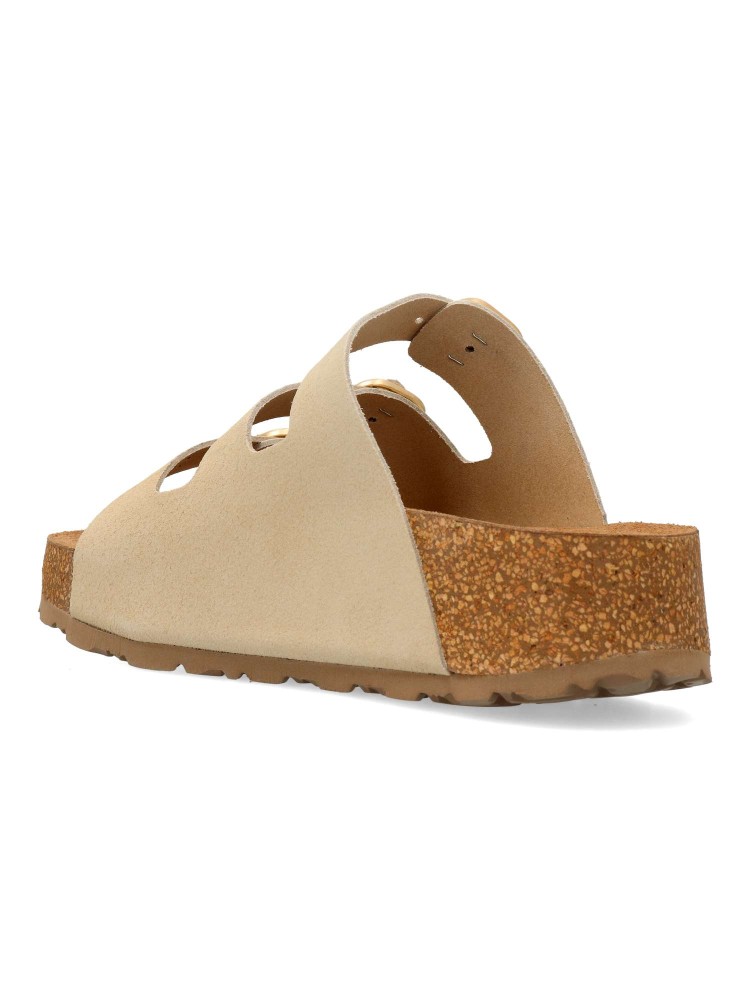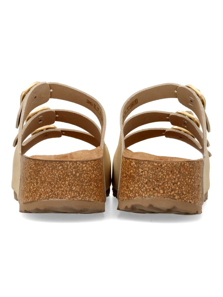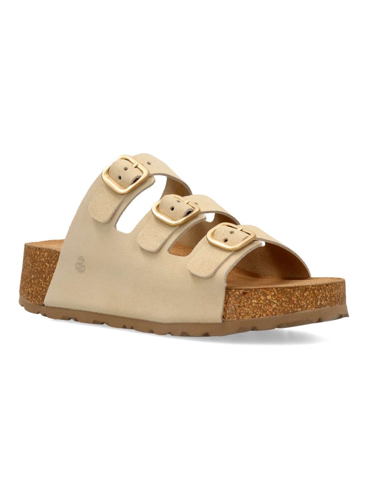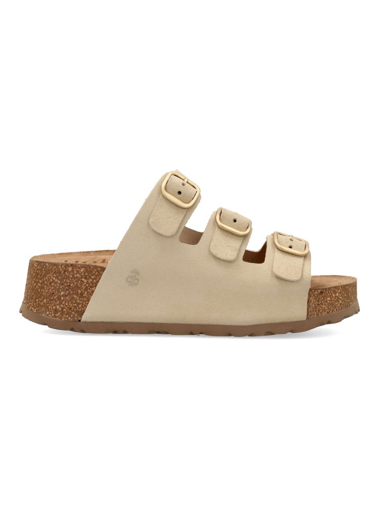 Sandalia de plataforma, fabricada en piel de alta calidad. Pala con tres hebillas ajustables. Fabricada en piel serraje con suela de corcho sobre EVA. Su diseño versátil se adapta fácilmente a cualquier look, desde el más casual hasta el más elegante.