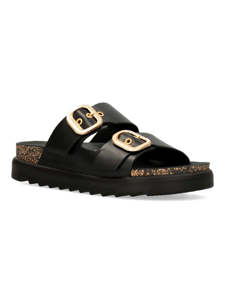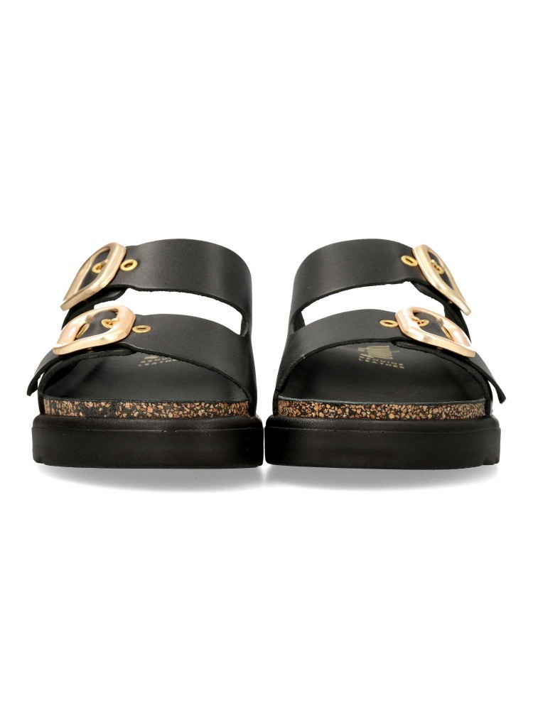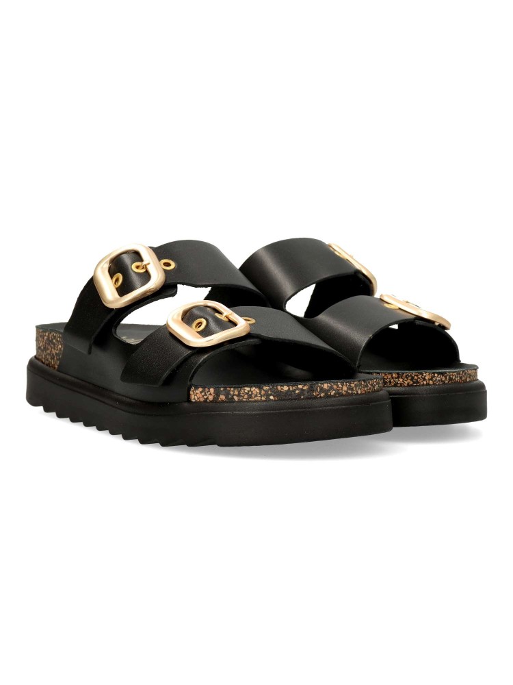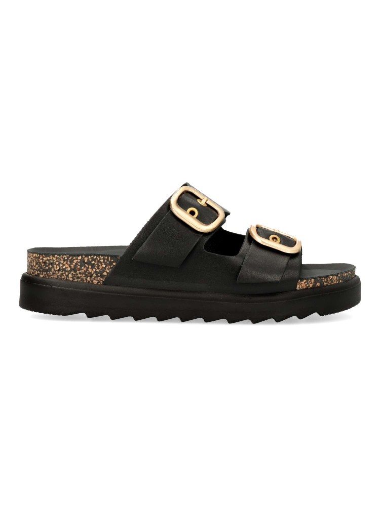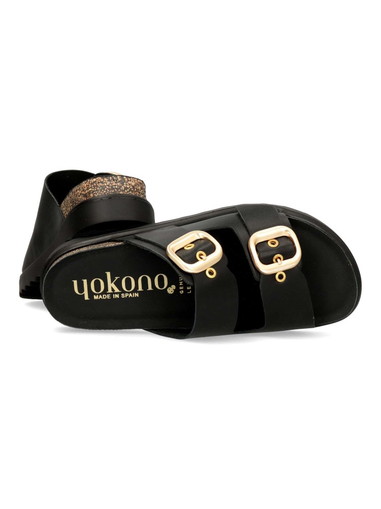 Sandalia bio de mujer, fabricada en piel natural. Doble pala ajustable con hebillas. Planta acolchada. Doble suela de corcho y goma, al mejor estilo Yokono. Altura 4 cm. Color negro. Ideal para tus planes del día a día. Hecho a mano en España.