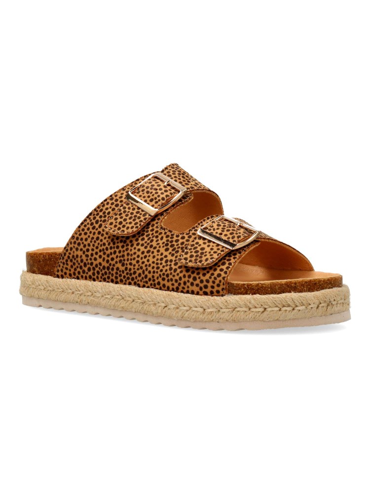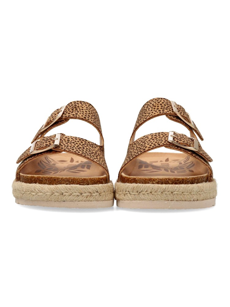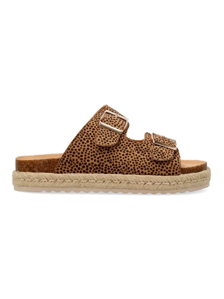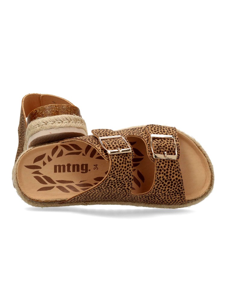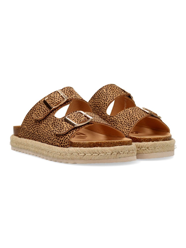 Sandalias animal print para niña. Padyu de Mustang, pensadas para aportar un toque actual a looks veraniegos. Este diseño tipo pala incorpora dos tiras anchas con hebillas. Plataforma con yute sobre EVA. Ideal para combinar con prendas frescas.