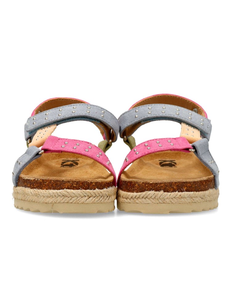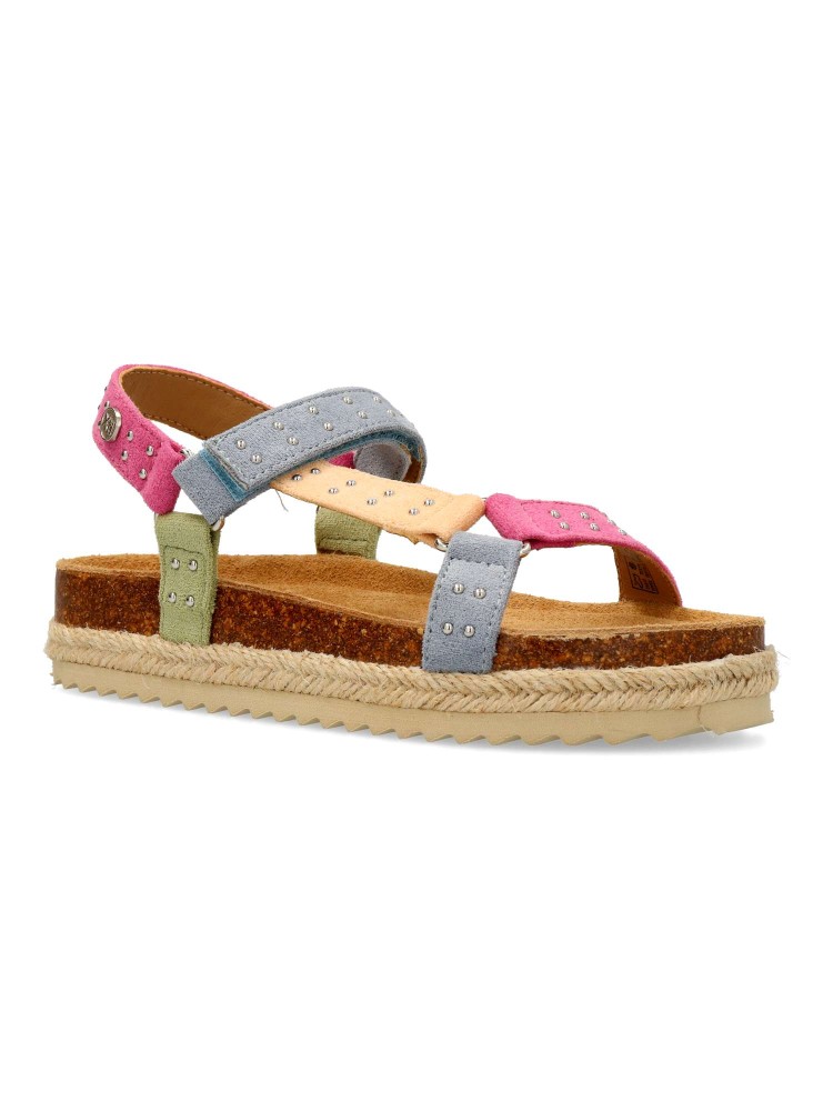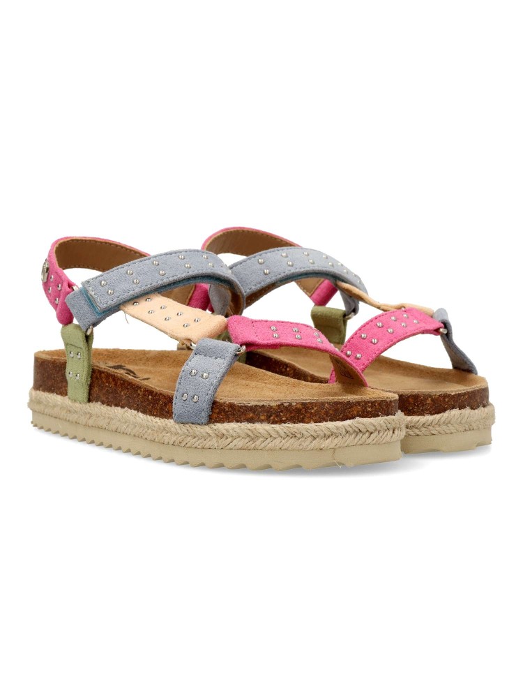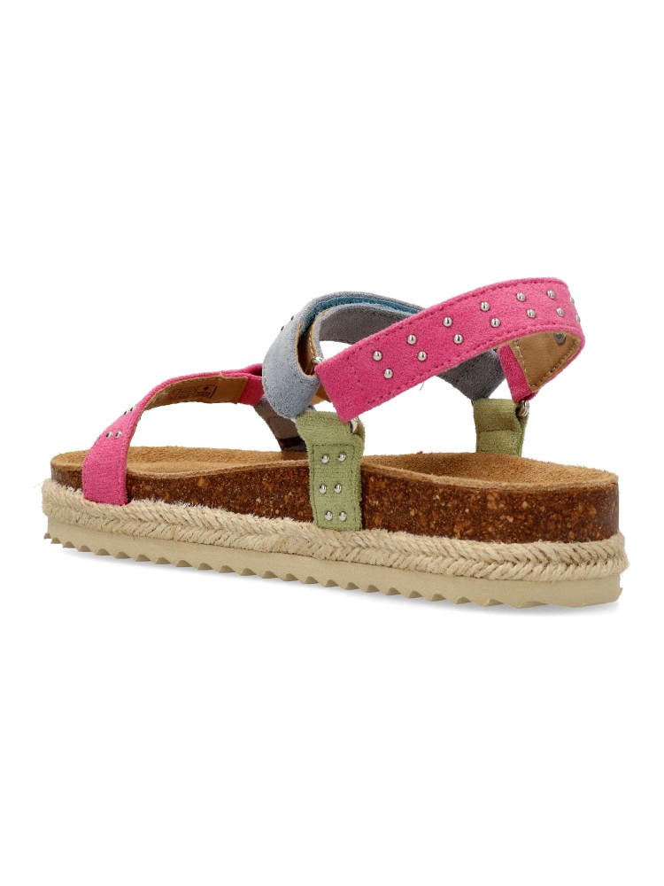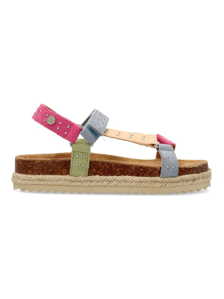 Sandalia de niña tipo bio. Ajuste con tira adherente. Modelo cómodo, fabricado en material antelina multicolor, con suela de goma antideslizante y tira de yute trenzado. Una sandalia muy versátil, ideal con tus outfits de temporada.