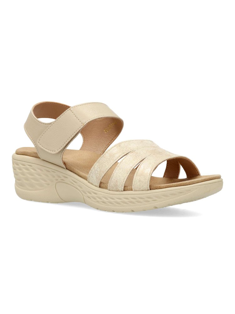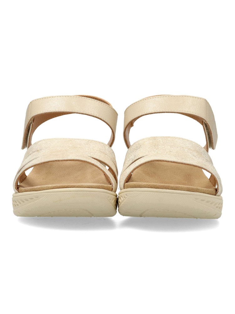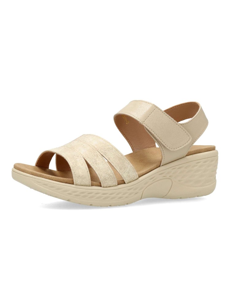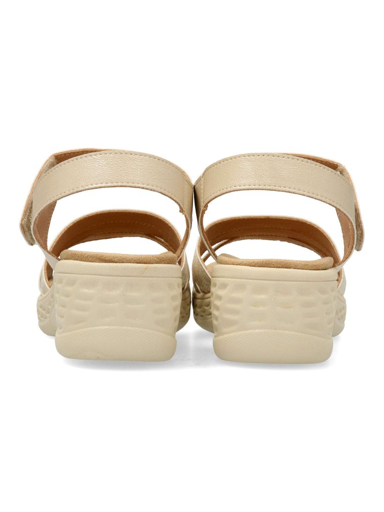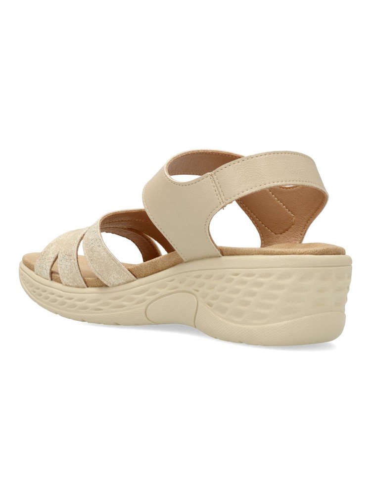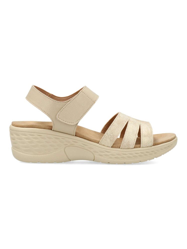 Sandalia cómoda de mujer, con cierre adherente. Fabricado en piel sintética. Suela de goma ligera y flexible. Planta acolchada. Color beige. Máximo confort, en una sandalia versátil, fácil de combinar, ideal en tus paseos de verano.