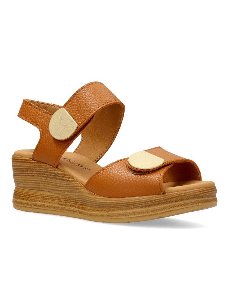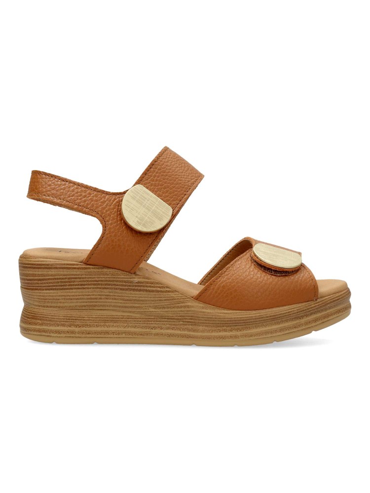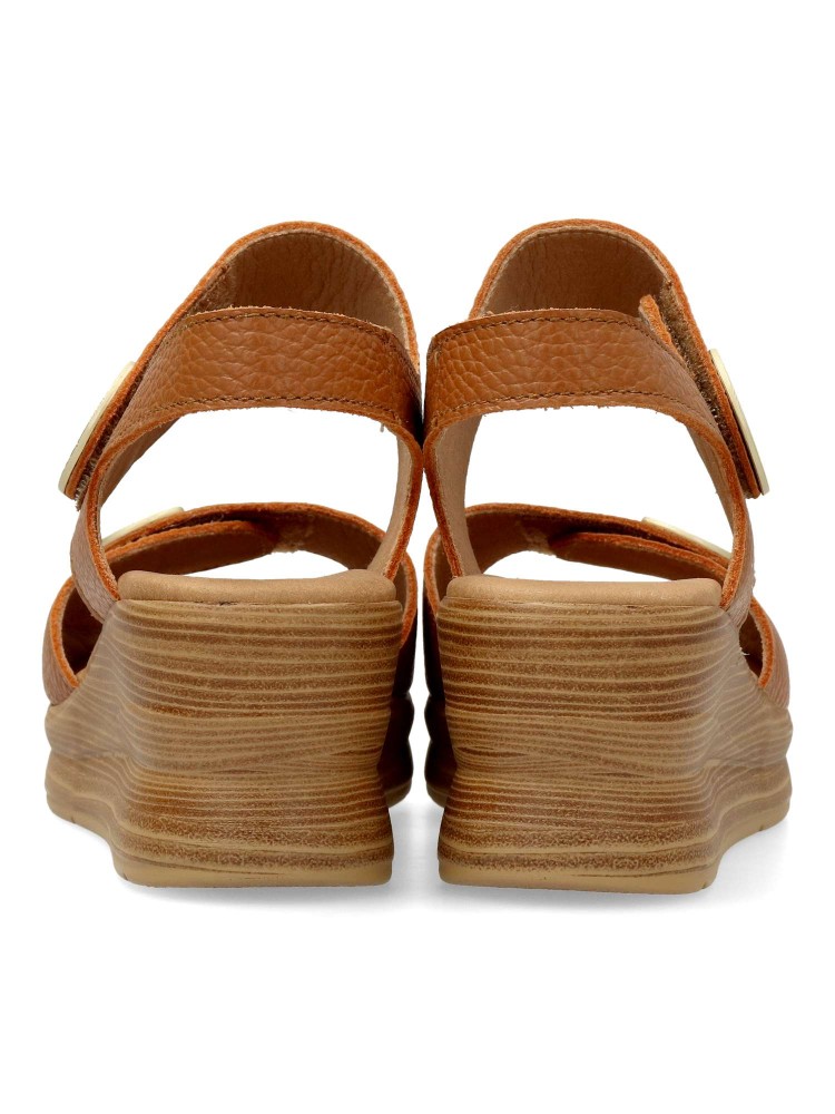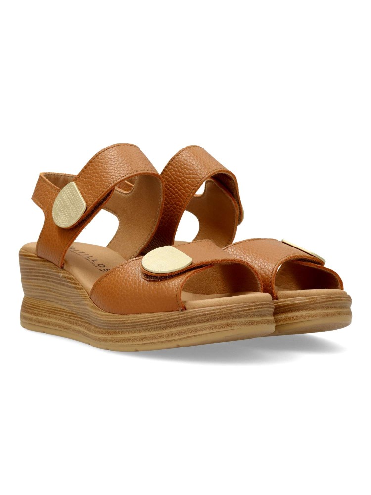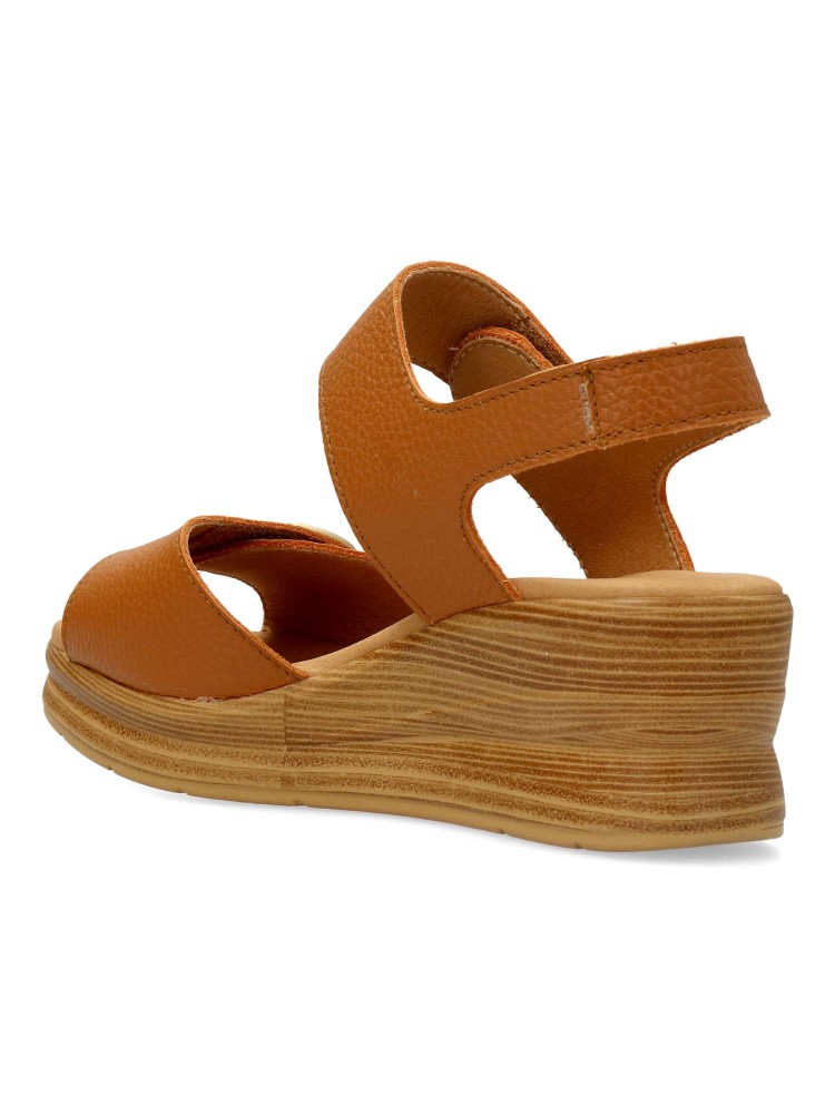 Sandalia cómoda de mujer, con cierre adherente. Fabricado en piel de primera calidad, con suela de goma. Cuña efecto madera de 6 cm. Planta acolchada. Color crema. Proporcionan una agradable sensación de confort y bienestar.