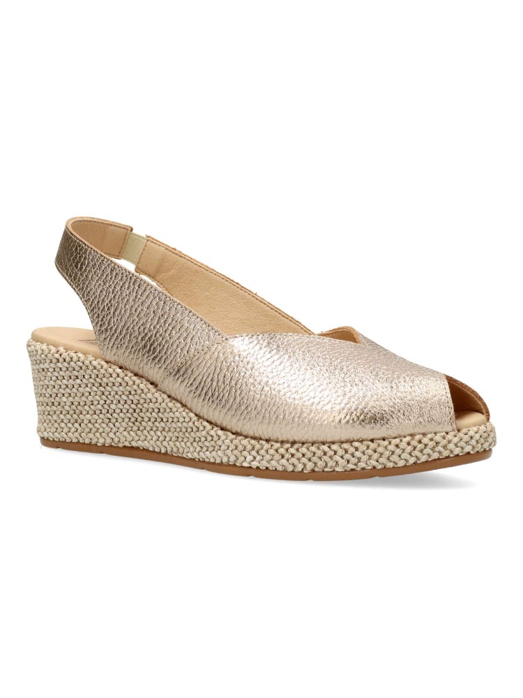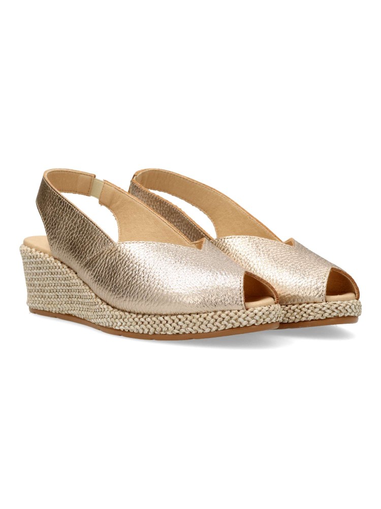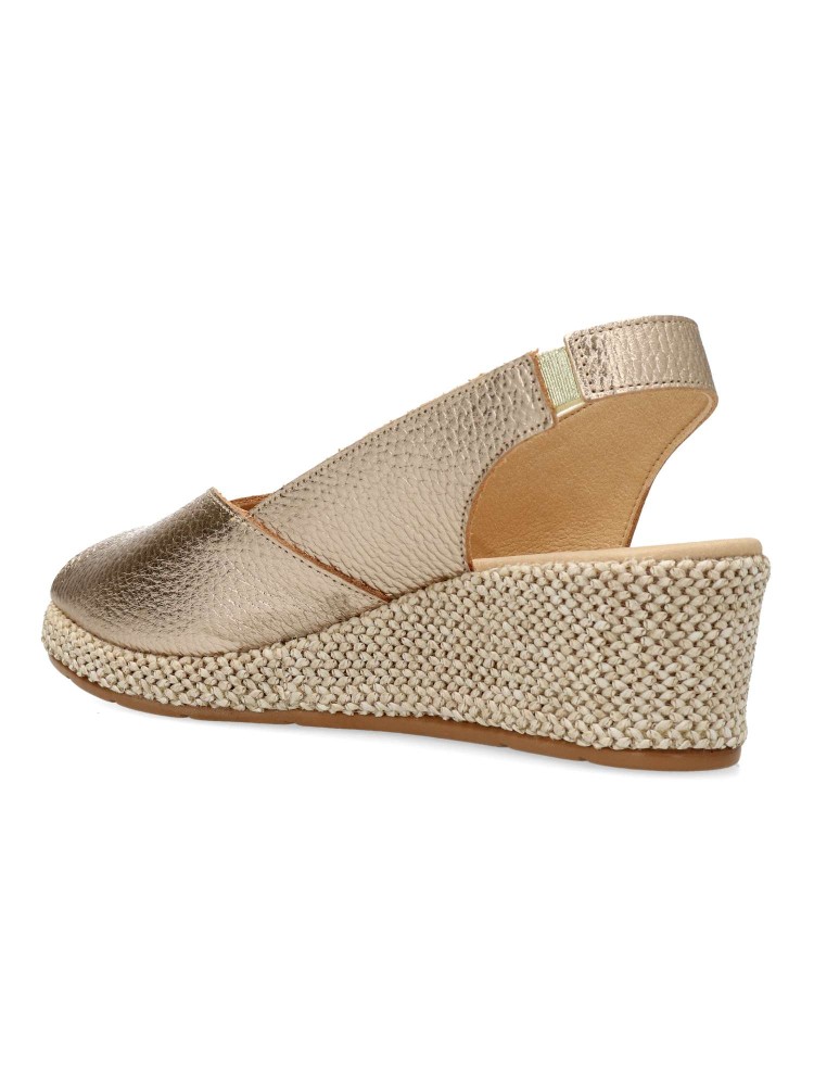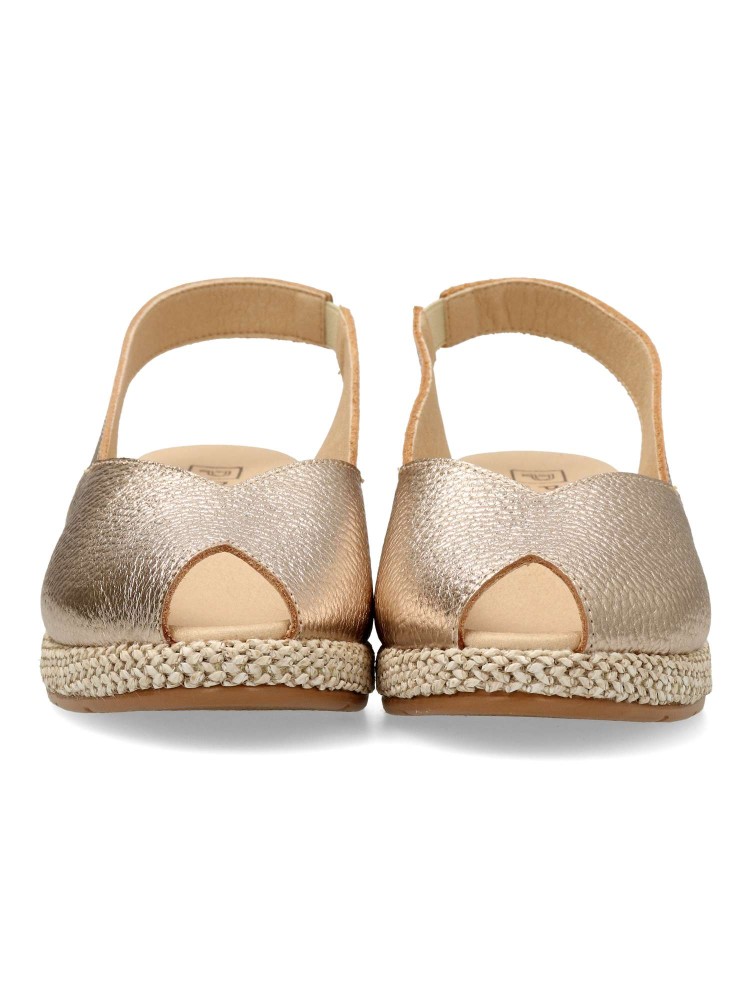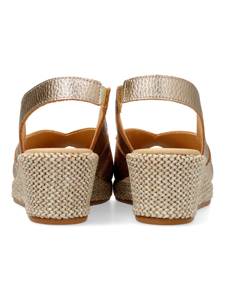 Sandalia cómoda de mujer con punta descubierta y destalonada. Cuña forrada de rafia. Fabricado en piel metalizada de primera calidad. Altura cuña 5,5 cm. Planta acolchada. Color oro. Diseño ligero, que ofrece agradable sensación de confort y bienestar.