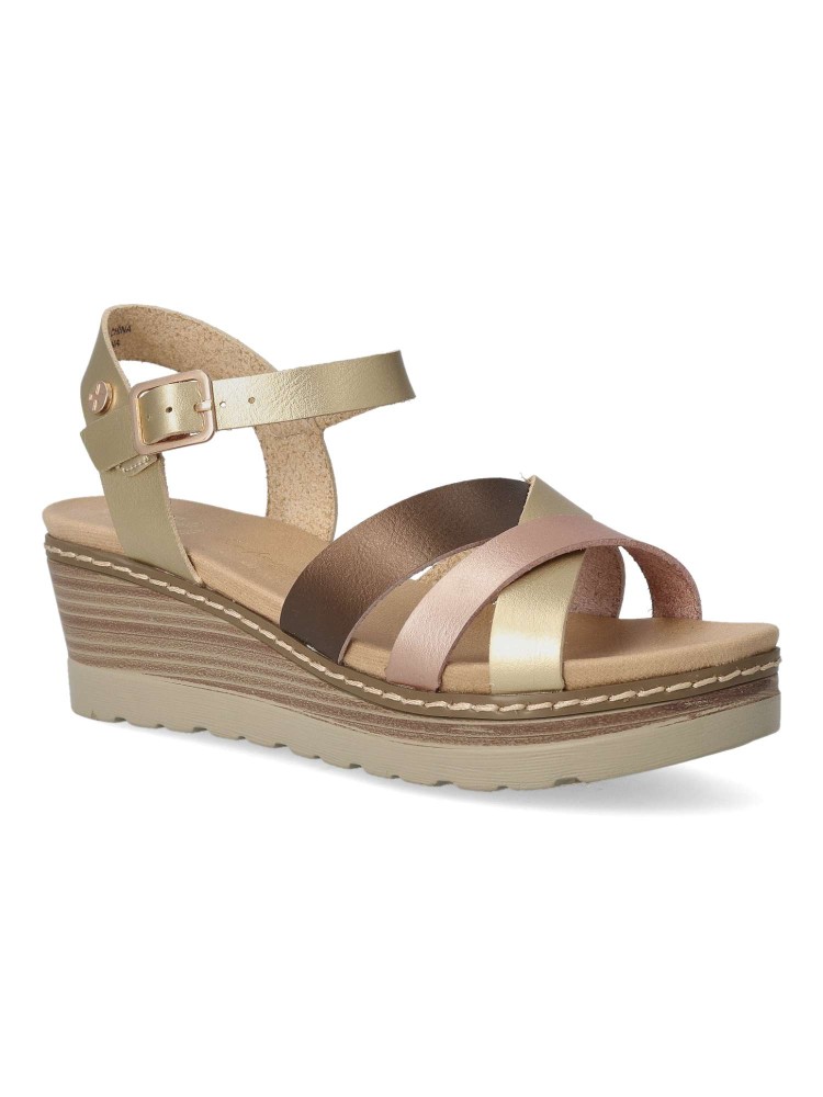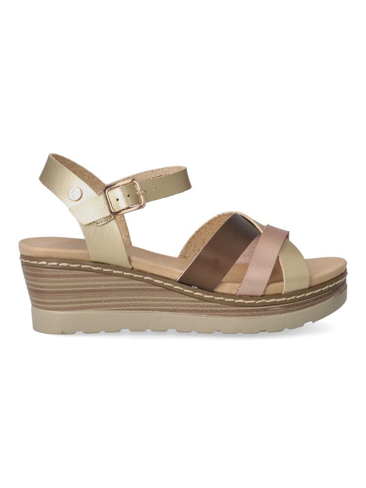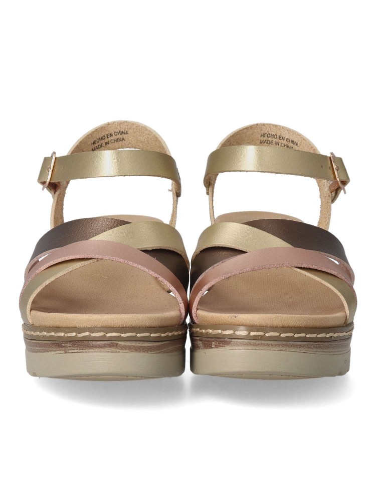 Sandalia con diseño de tiras cruzadas. Cierre de hebilla. Fabricada en material que imita la piel. Suela de goma antideslizante. Planta acolchada. Color multi metal oro-bronce-rosa. Altura cuña 5,5 cm. Diseño cómodo y elegante. Certificado vegano.