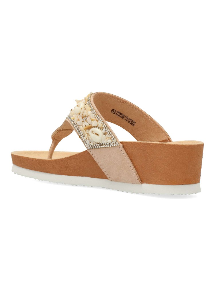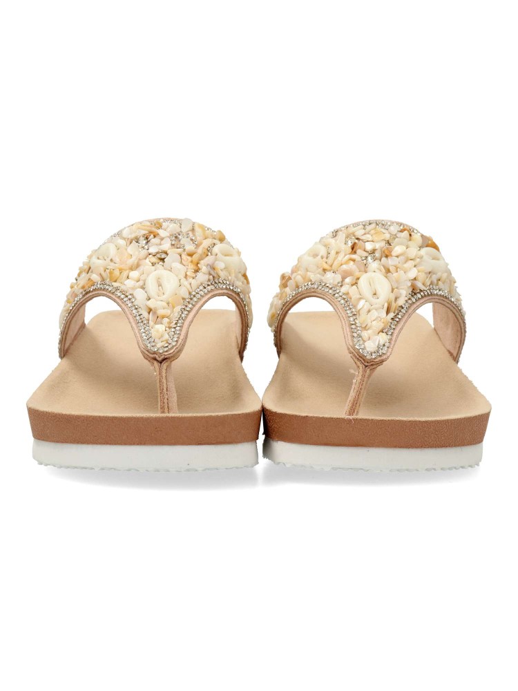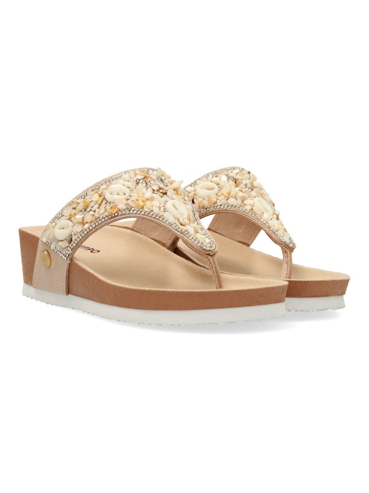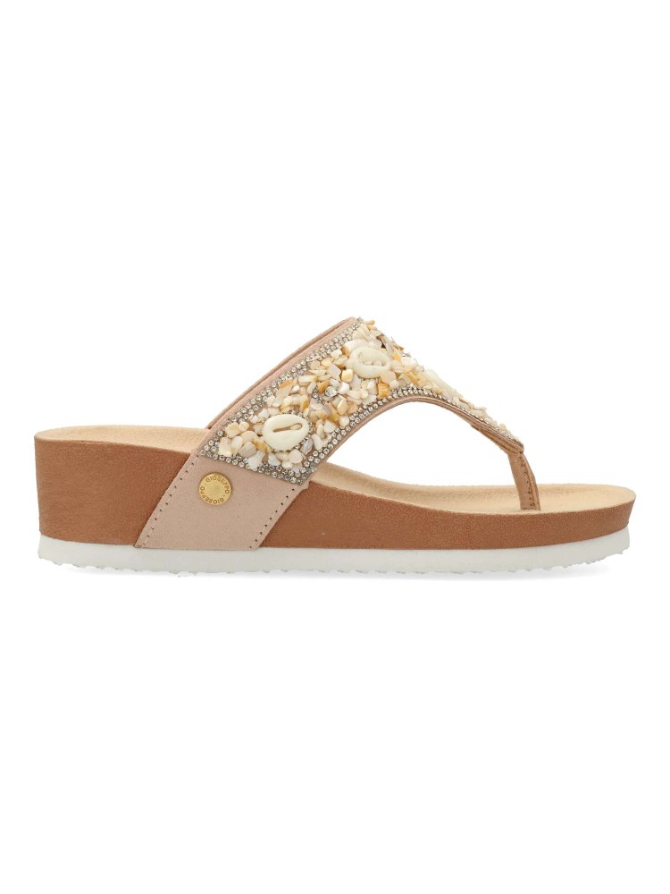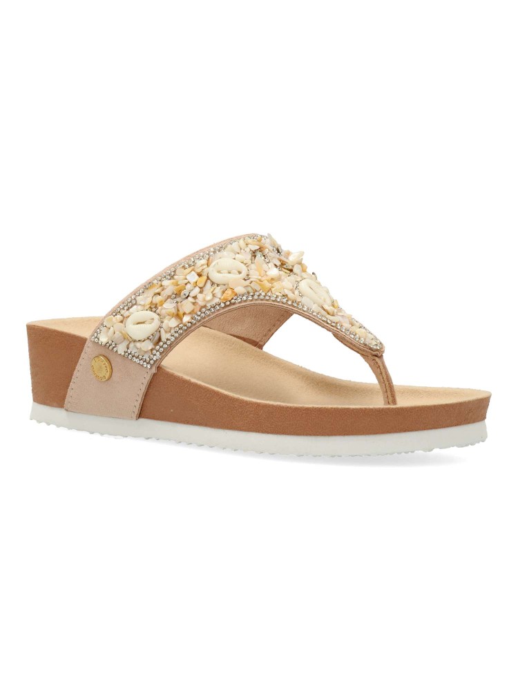 Sandalia cómoda de mujer, tipo bio. Modelo de dedo con tira cubierta de piedras de playa. Suela de goma EVA ligera. Color beige. Pequeña cuña de 4 cm. de altura. Diseño cómodo, elegante y original, ideal con tus looks de verano.