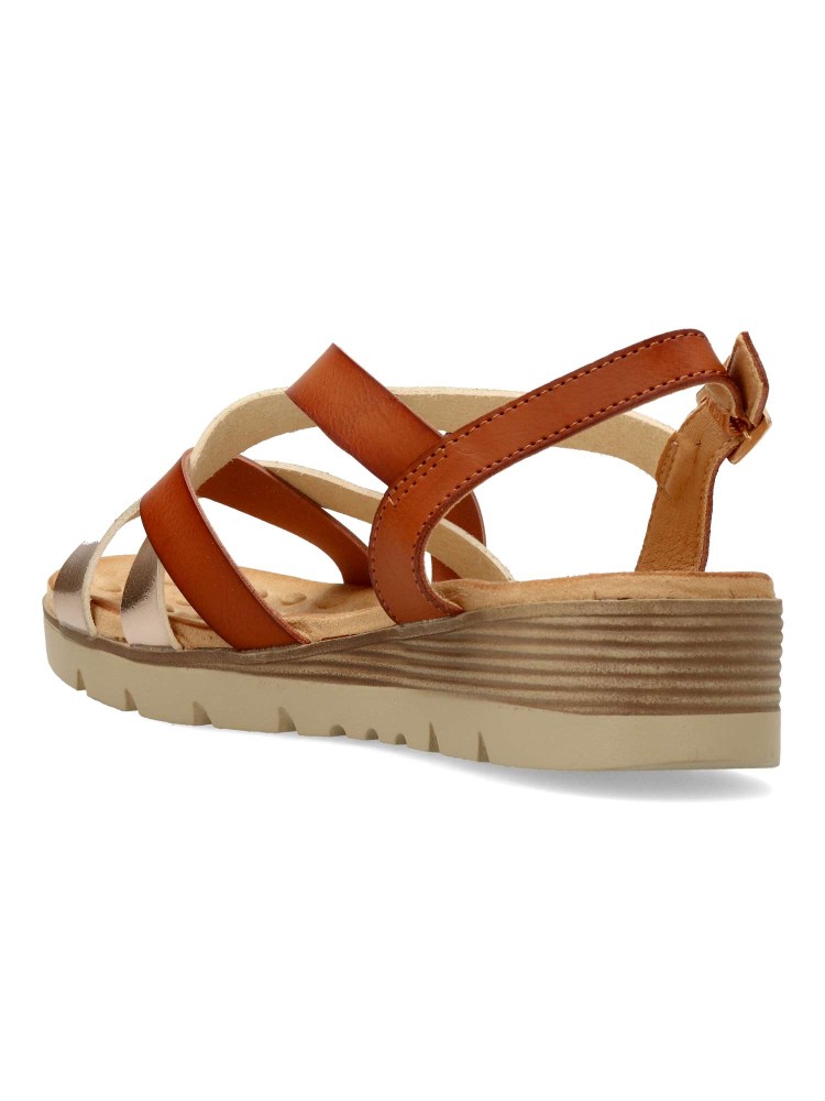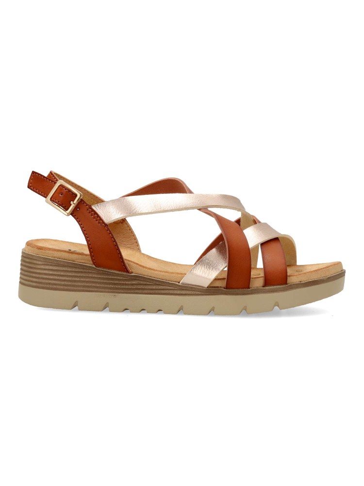 Sandalia de tiras cruzadas, con cierre de hebilla al tobillo. Modelo cómodo, fabricado en piel sintética con suela de goma ligera y flexible. Planta acolchada. Color cuero. Altura cuña 3,5 cm. Diseño versátil, ideal para combinar con tus outfits de verano