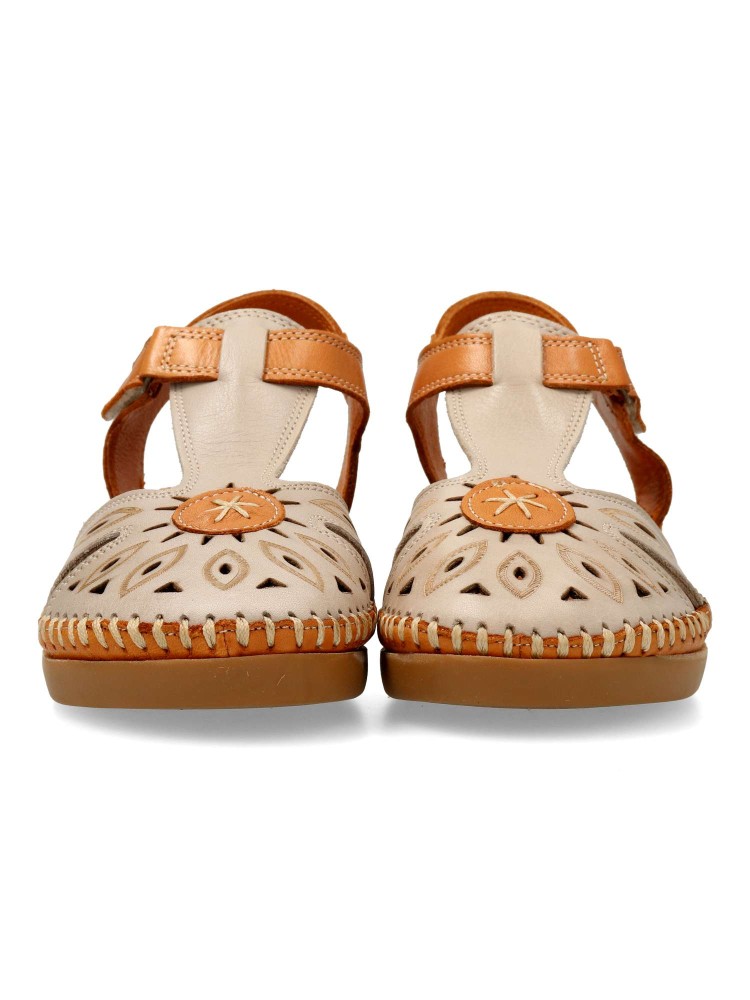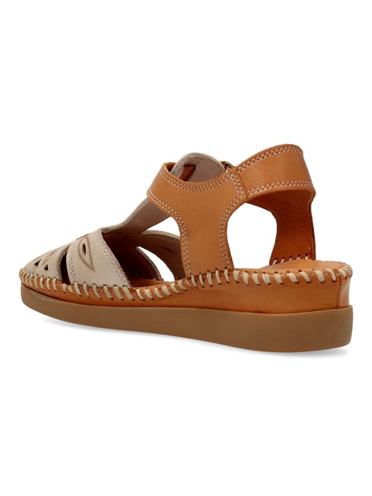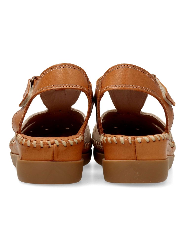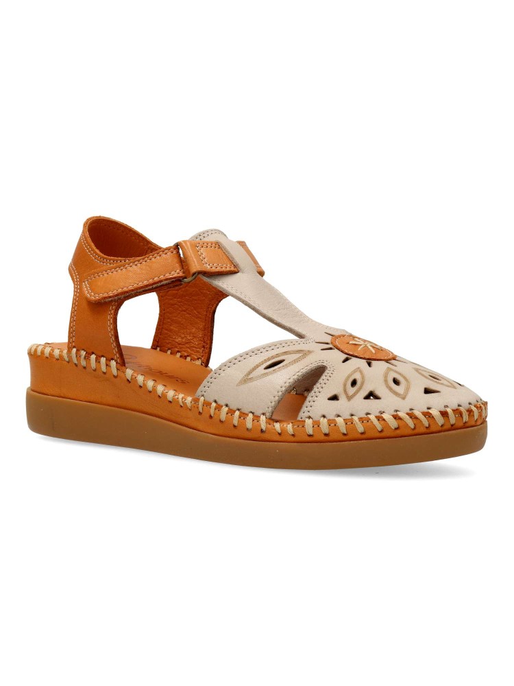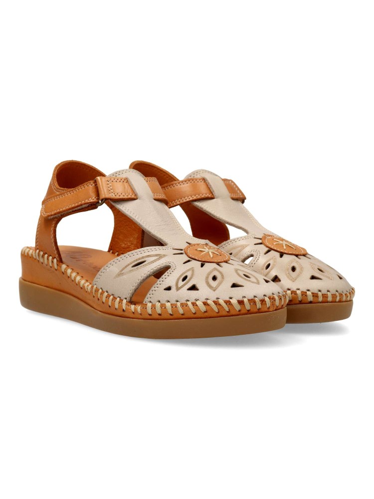 Sandalia de mujer con cierre adherente. Modelo cómodo, fabricado en piel natural troquelada, con suela de goma ligera y flexible. Planta acolchada. Color taupe-cuero. Altura cuña 4,5 cm. Diseño versátil y máximo confort para andar sin limites.