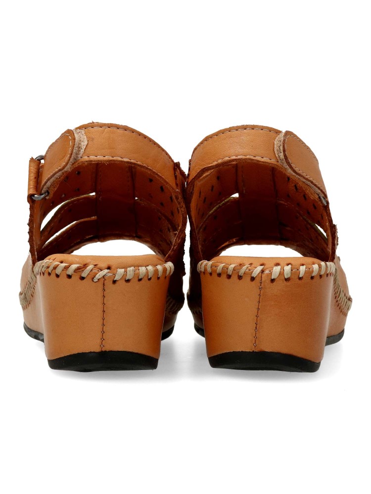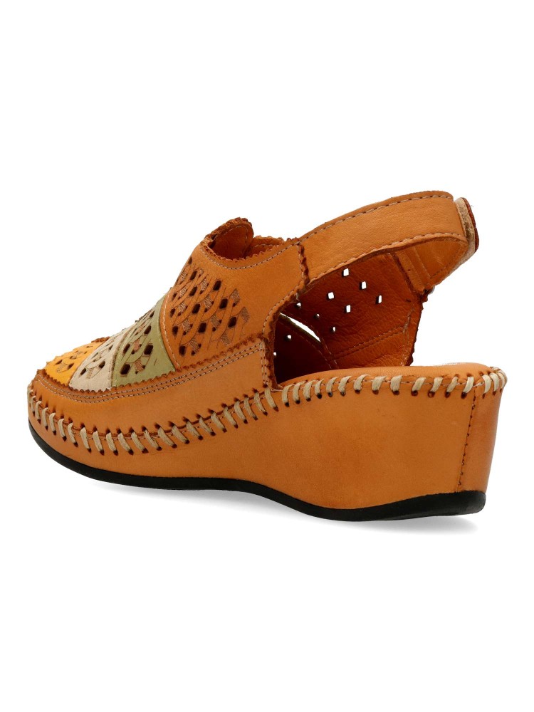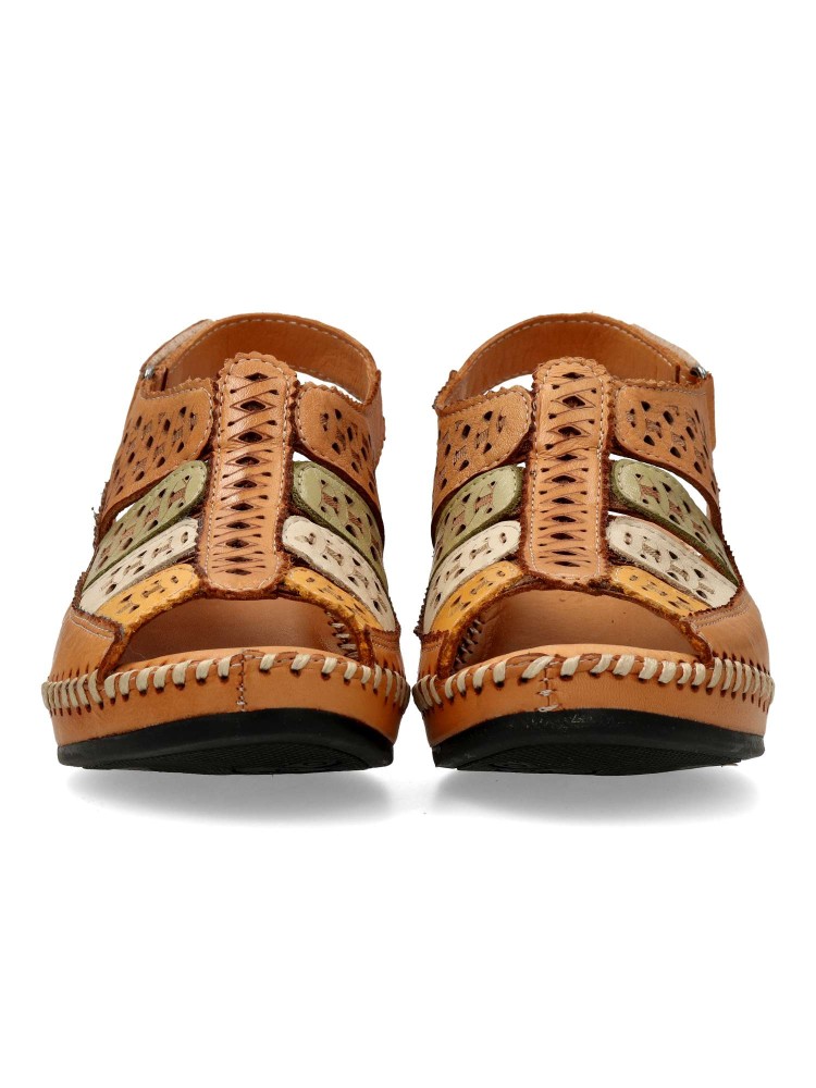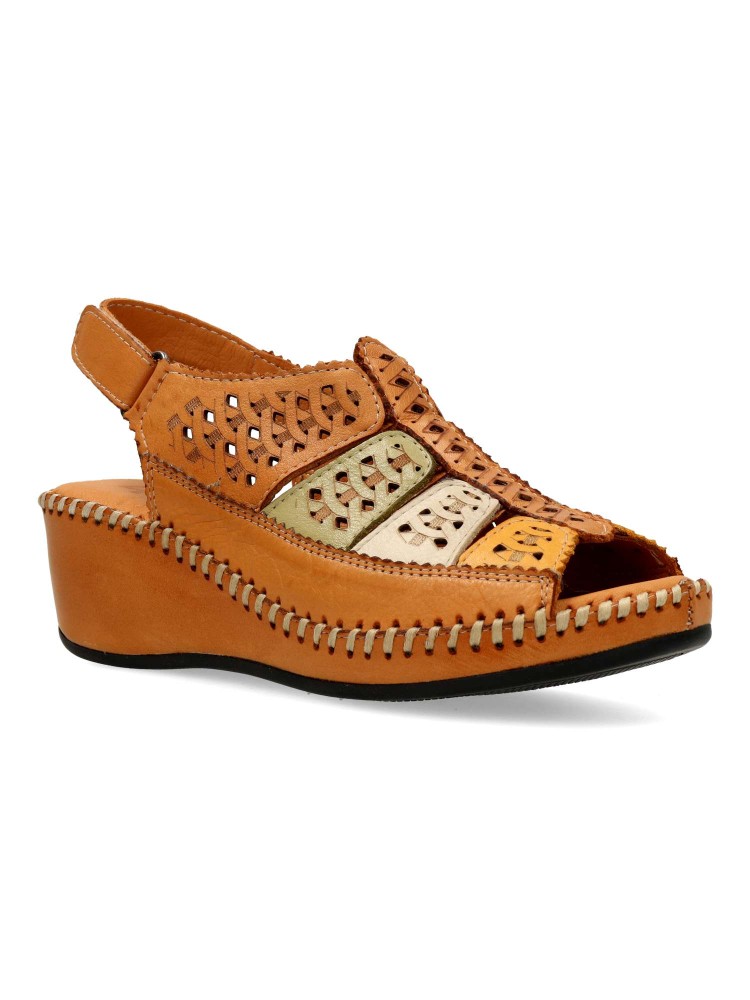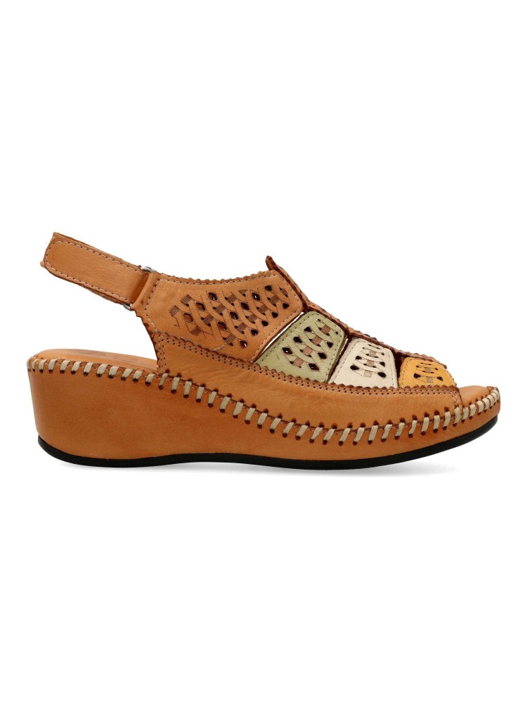 Sandalia troquelada de mujer, con cierre de velcro. Modelo cómodo, fabricado en piel natural, con suela de goma ligera y flexible. Planta acolchada. Color cuero-multicolor. Altura cuña 5 cm. Diseño y confort para andar sin limites.