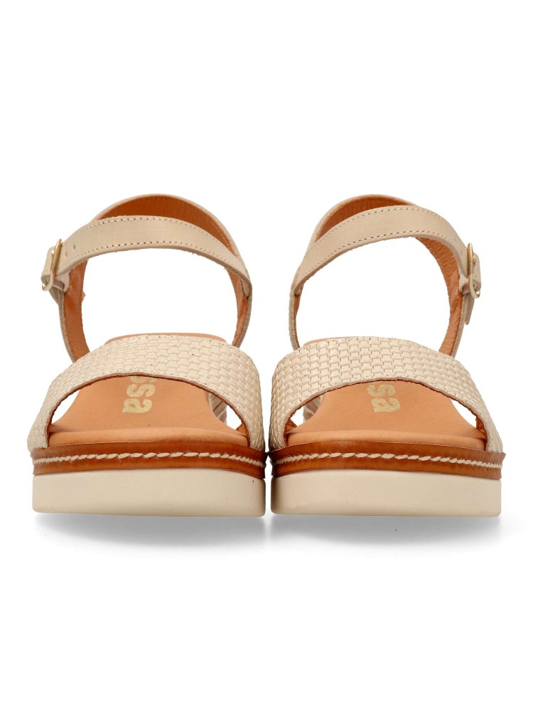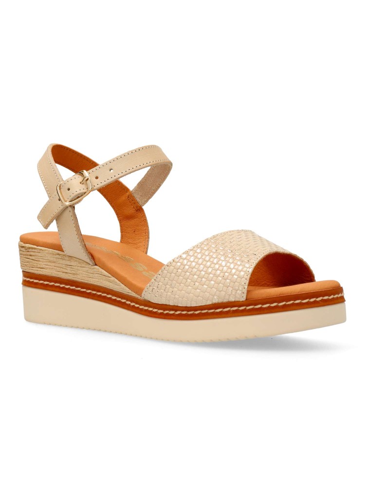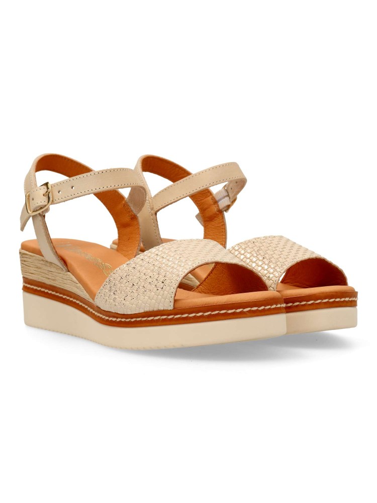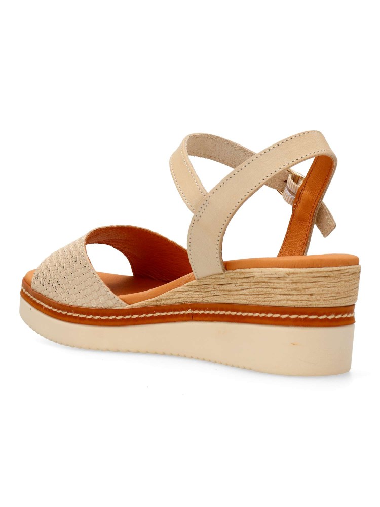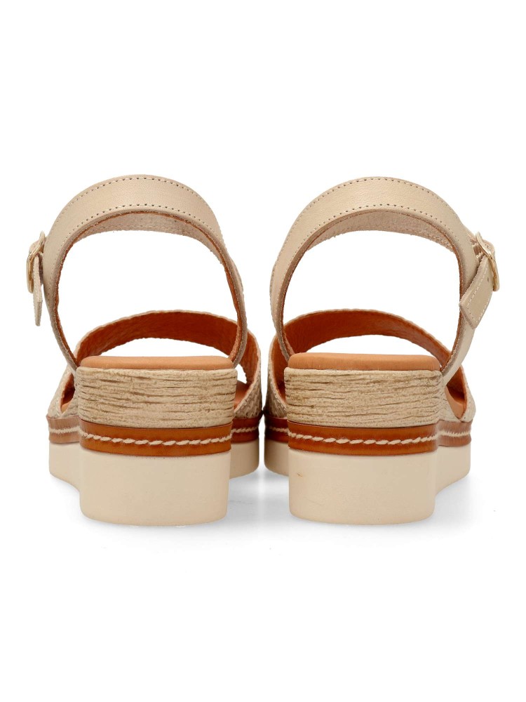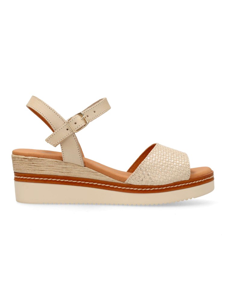 Sandalia cómoda para mujer. Fabricada en piel, con suela de goma. Cierre de hebilla al tobillo. Cuña de 5,5 cm. Forros y plantillas 100% transpirables. Planta de piel acolchada. Color beige-platino. Diseño y confort fácil de combinar. Hecho en España.