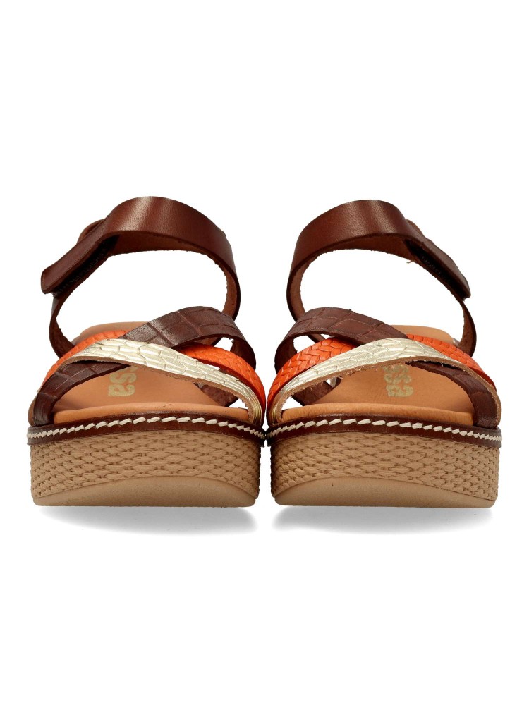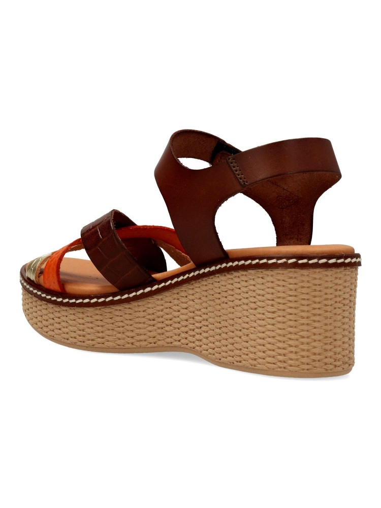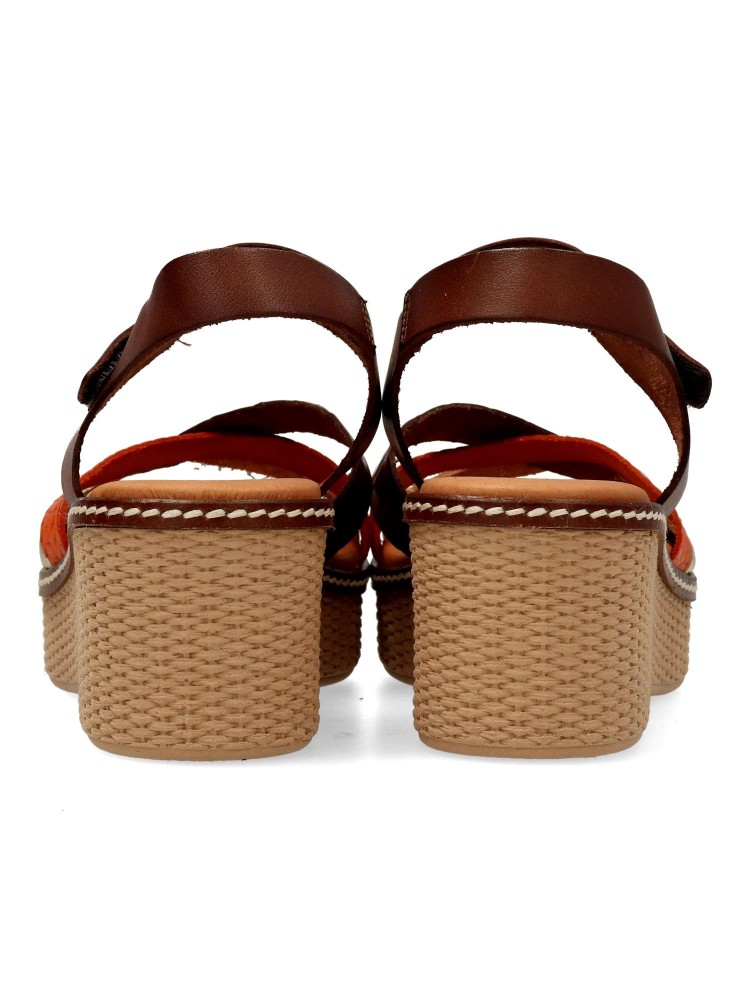 Sandalia de mujer con diseño de tiras cruzadas. Modelo cómodo fabricado en piel grabada, con suela de goma. Planta de piel con acolchado gel, confort total. Transpirables 100%. Plataforma efecto cuerda trenzada de 6 cm. Hecho a mano en España.