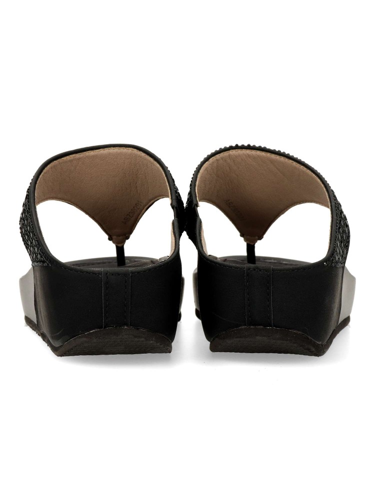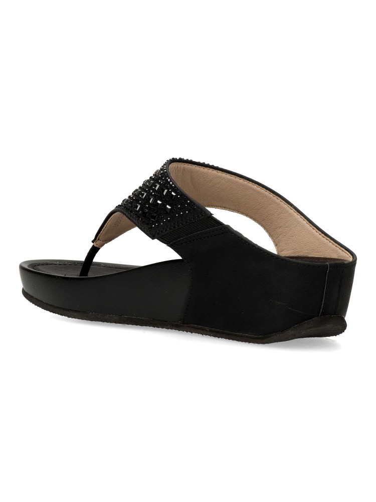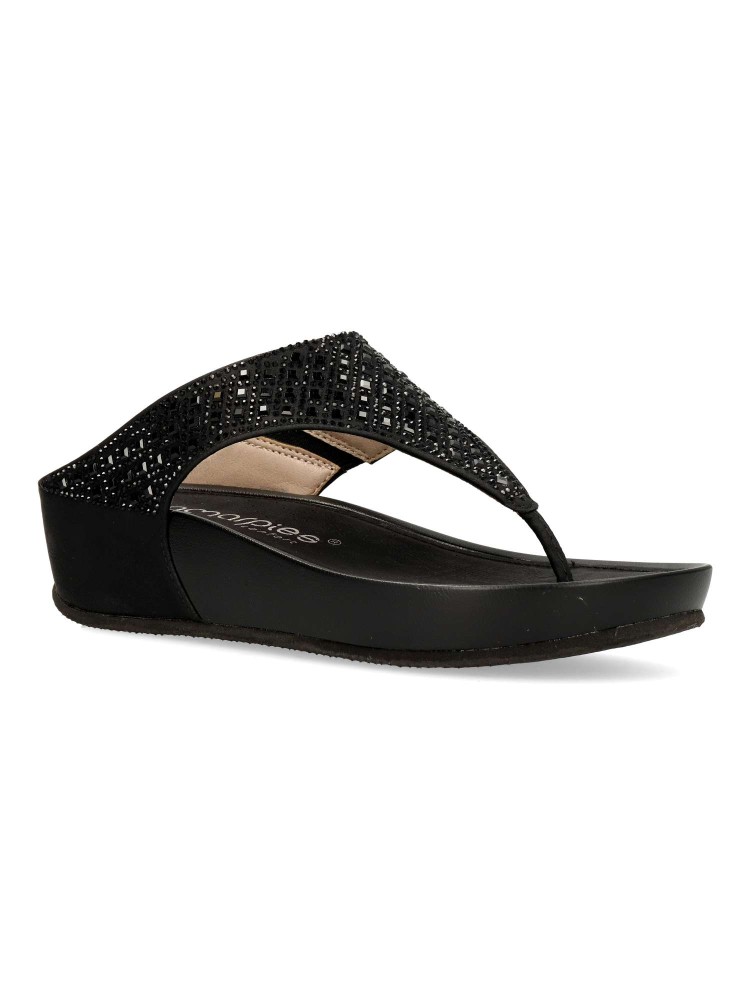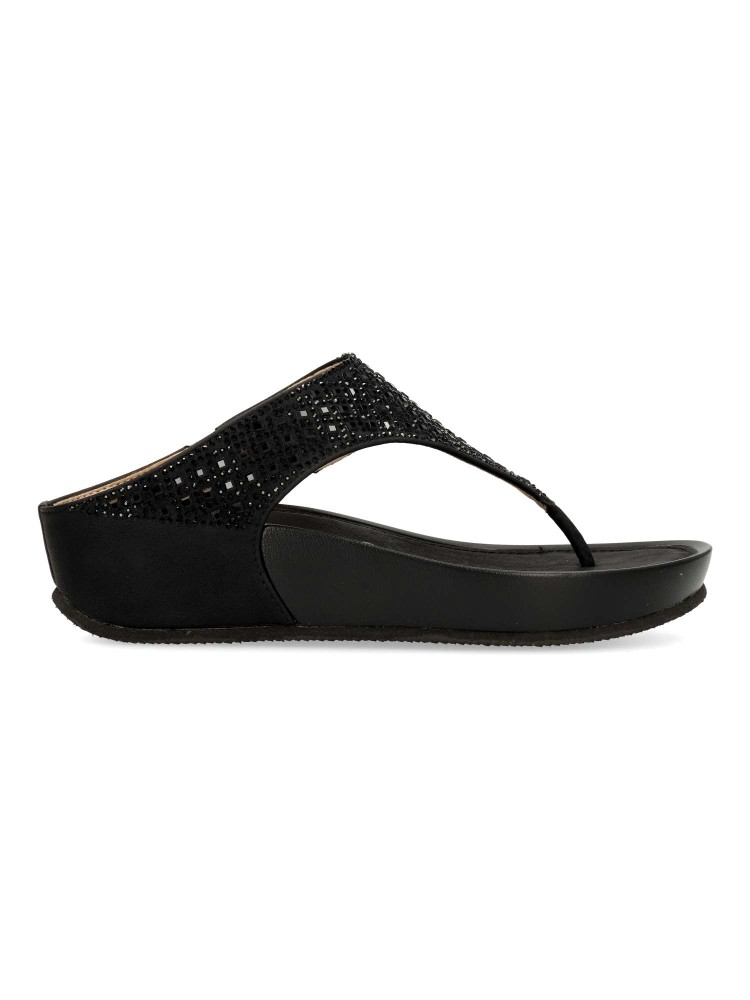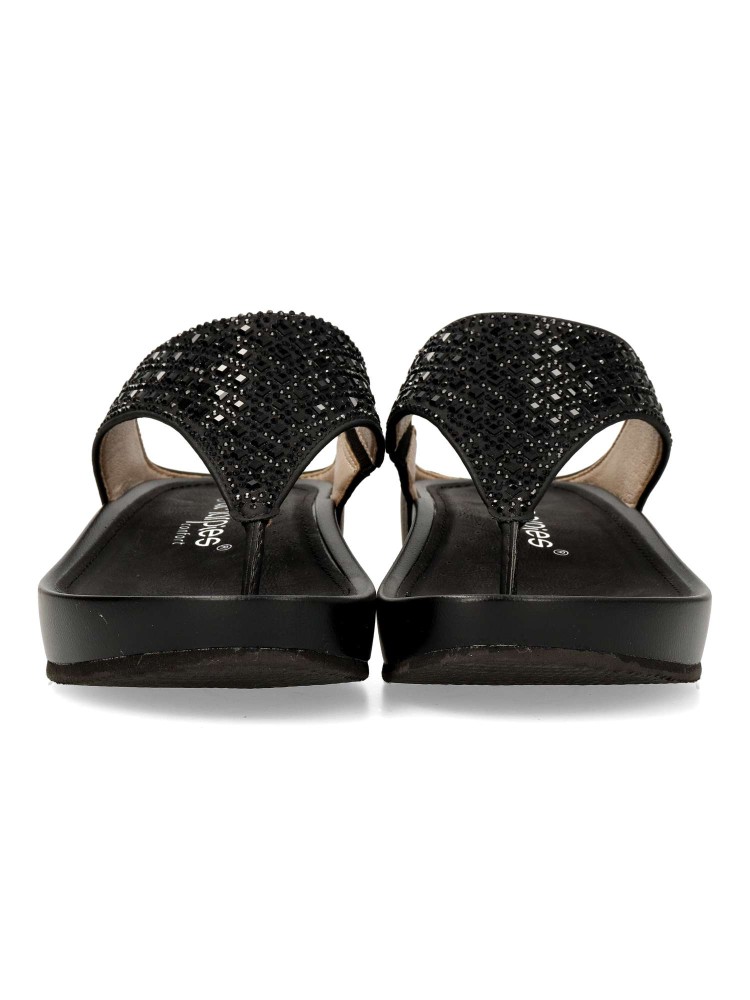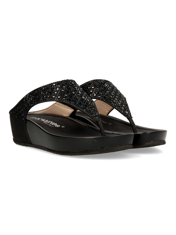 Sandalia casual cómoda de mujer, tipo esclava. Color negro. Fabricada en material sintético, con suela de goma ligera. Planta acolchada. Altura cuña 4,5 cm. Detalle pedrería brillo. Amarpies, confort diario para combinar con tus outfits de verano.