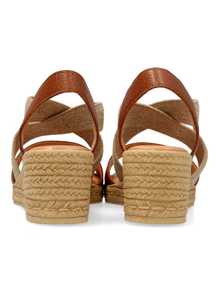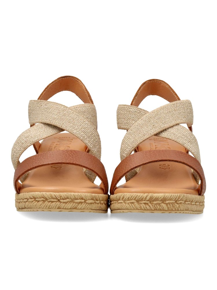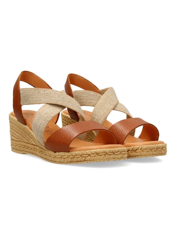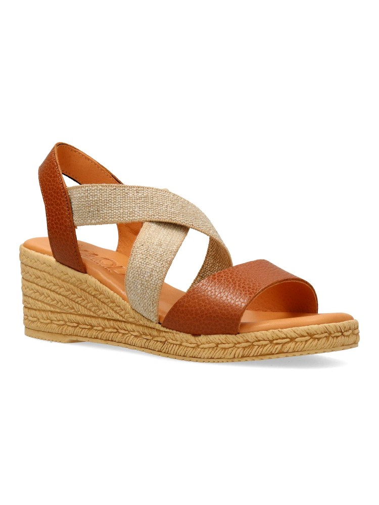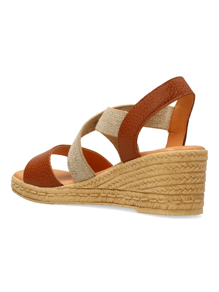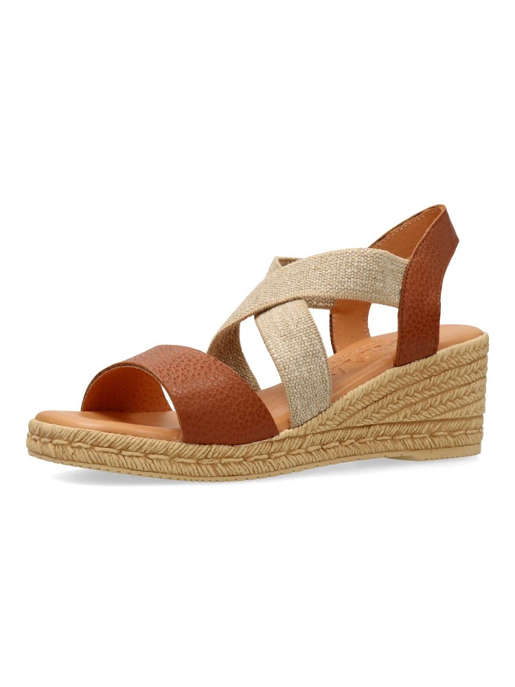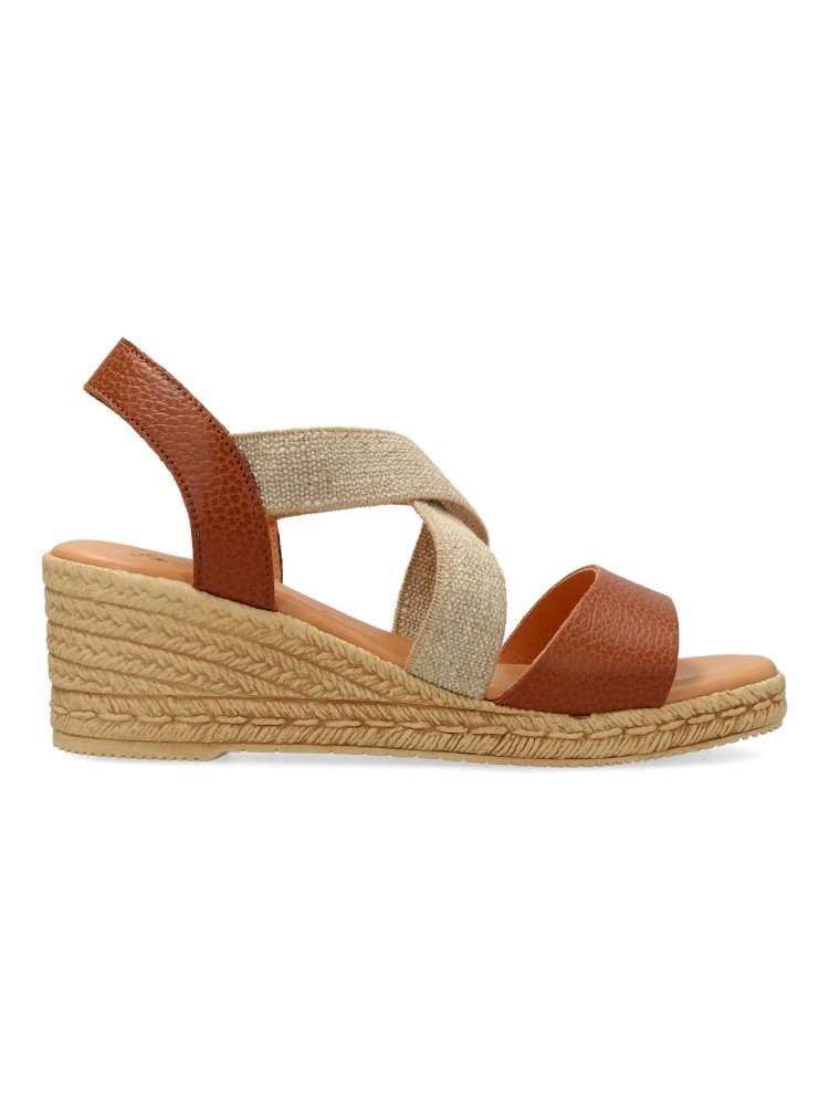 Sandalia cómoda de mujer. Fabricada en piel metalizada. Tiras elásticas cruzadas al empeine. Cuña efecto yute de 5,5 cm. Planta de piel acolchada. Diseño y confort ideal con tus outfits de primavera verano. Color cuero. Hecho en España.