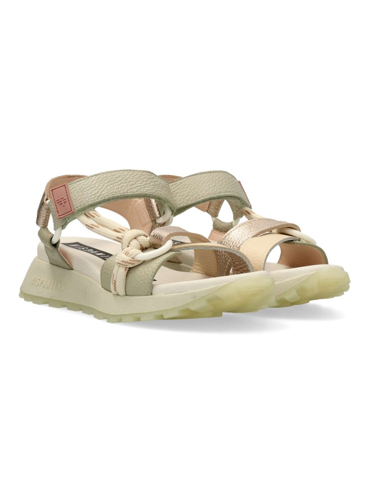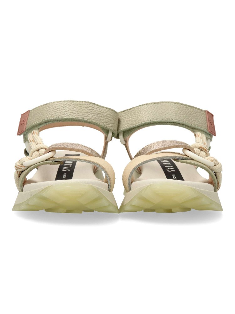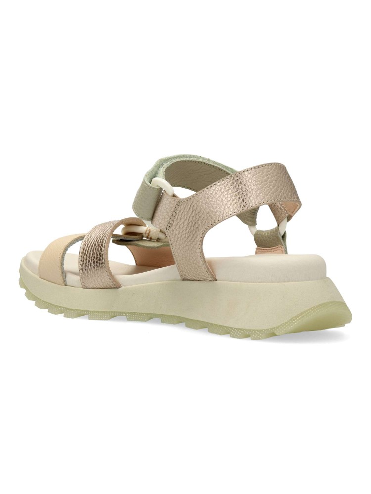 Sandalia sport para mujer, con cierre de tira adherente. Modelo cómodo, fabricado en piel, con suela gruesa de goma de 4 cm. Tecnología TRIFLOW, que aporta flexibilidad y confort en la pisada. Color verde-champán. Ideal con tu outfit de verano.