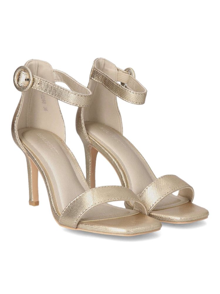 Sandalia de fiesta para mujer. Modelo de pala, con pulsera al tobillo y cierre de hebilla. Fabricado en piel sintética. Tacón fino de 8 cm. de altura. Color oro. Sandalia de vestir, ideal para bodas, comuniones, bautizos y demás celebraciones.