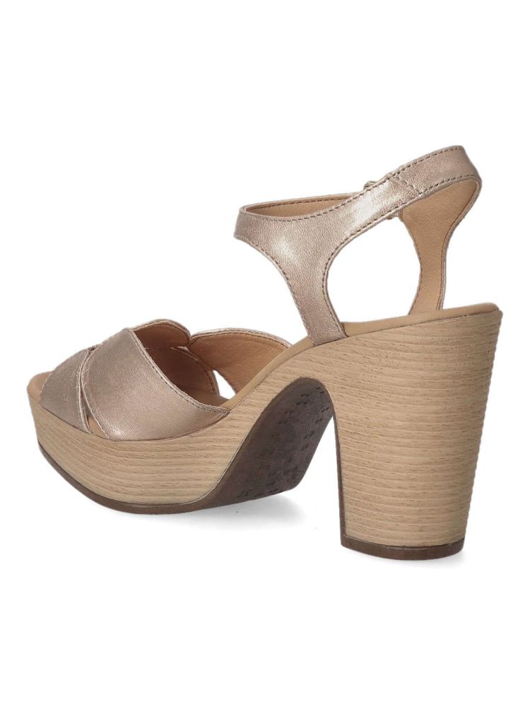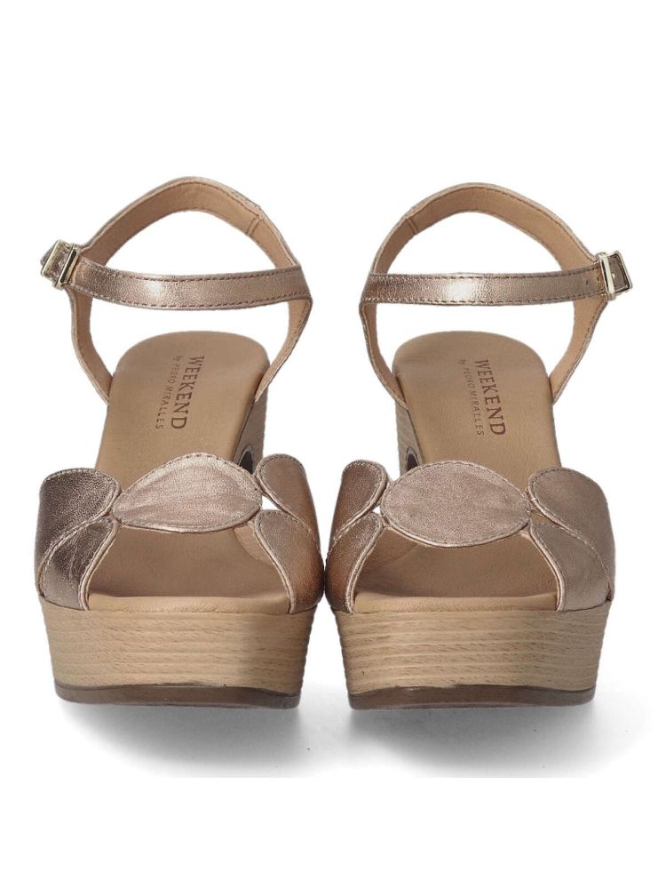 Sandalias de tacón destalonada de piel metalizada. Color oro rosa. Confeccionadas con plantillas suaves y acolchadas. Sandalia cómoda, perfecta para el verano. Opción perfecta para añadir un toque de elegancia y estilo a tu armario.