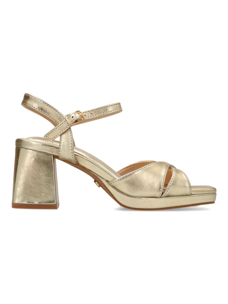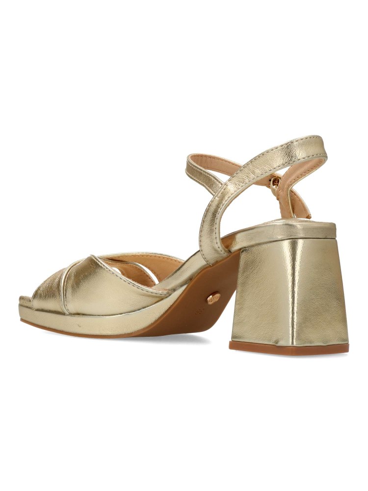 Sandalia de fiesta para mujer. Modelo de tiras cruzadas, con pulsera al tobillo y cierre de hebilla. Fabricado en piel sintética, con suela de goma. Tacón ancho de 7 cm. Color oro. Ideal para fiestas, eventos y celebraciones.