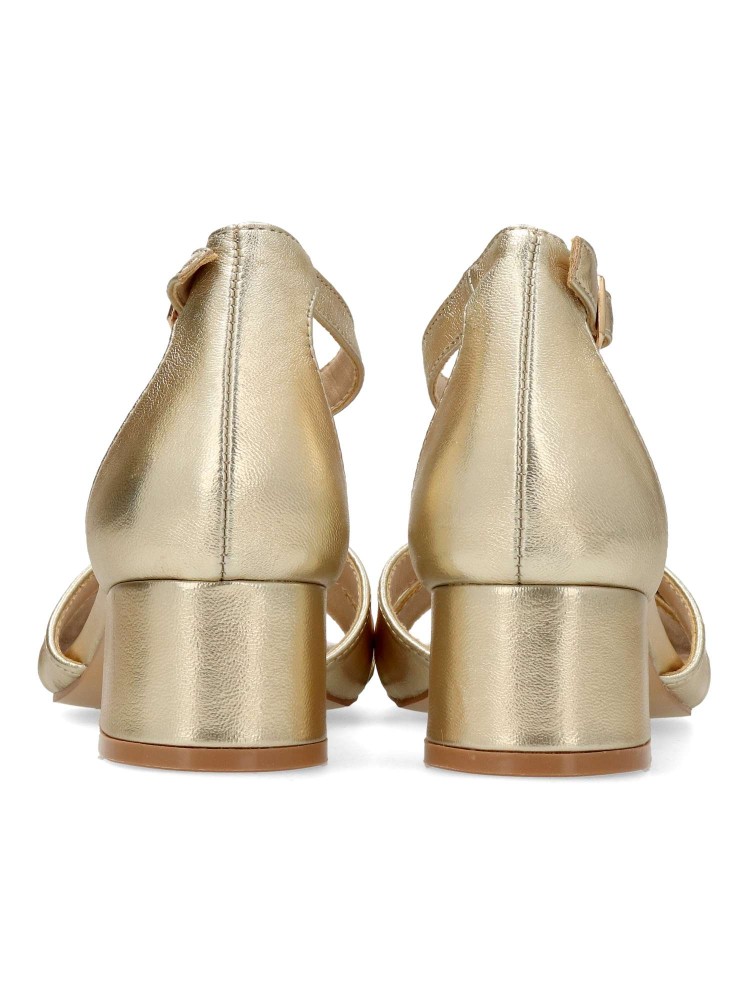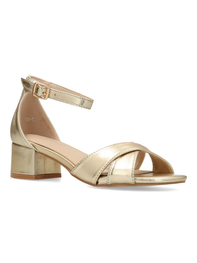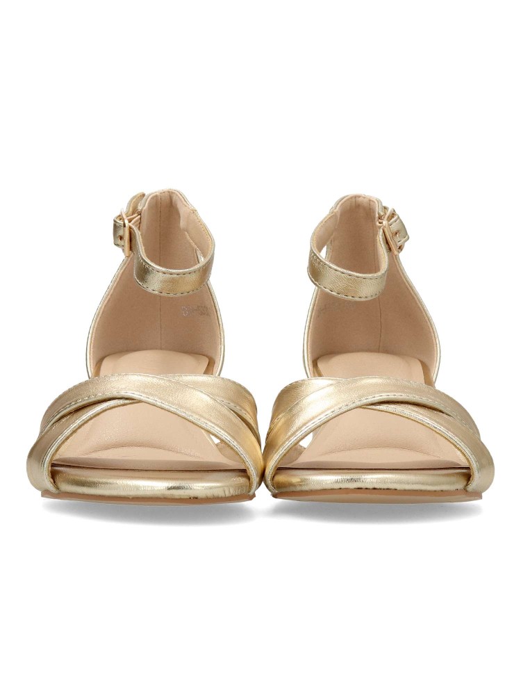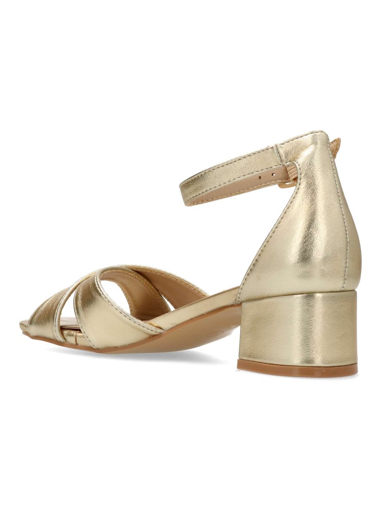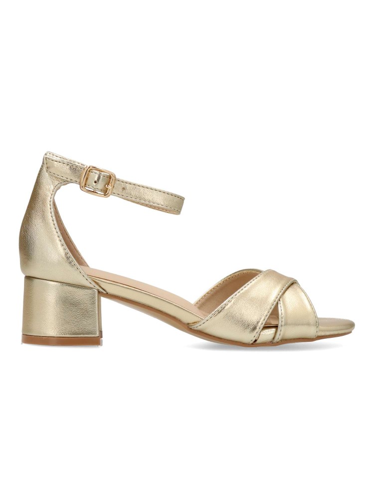 Sandalia de mujer con tira al tobillo y cierre de hebilla. Modelo con pala de tiras cruzadas, fabricado en piel sintética con suela de goma. Color oro. Tacón de 4 cm. Estas sandalias serán la estrella de tus looks en eventos, fiestas y celebraciones.