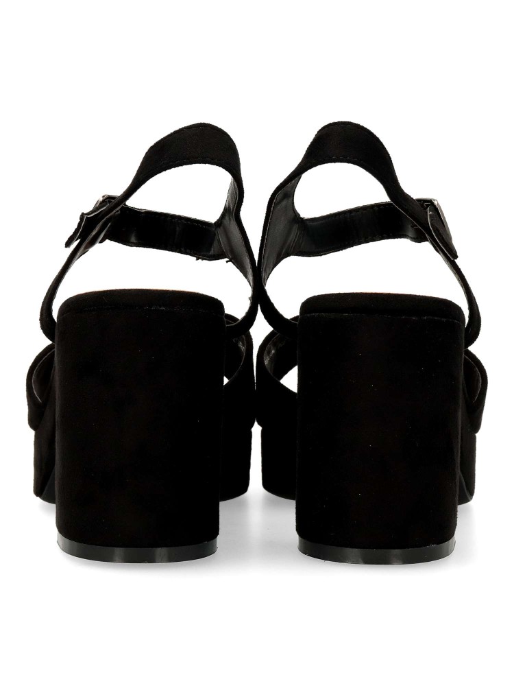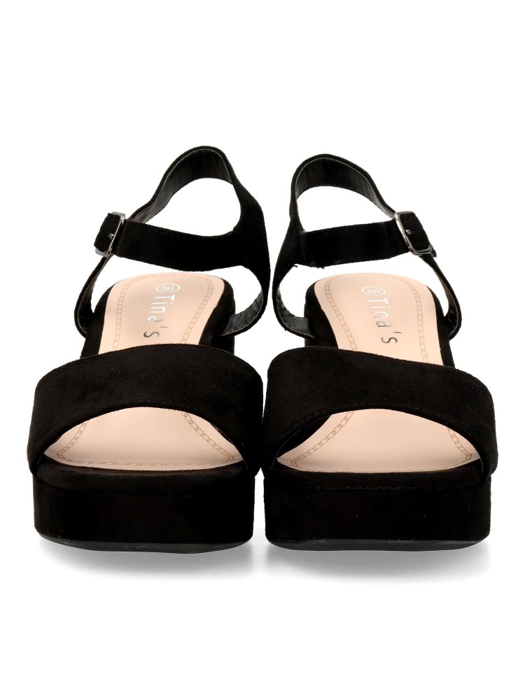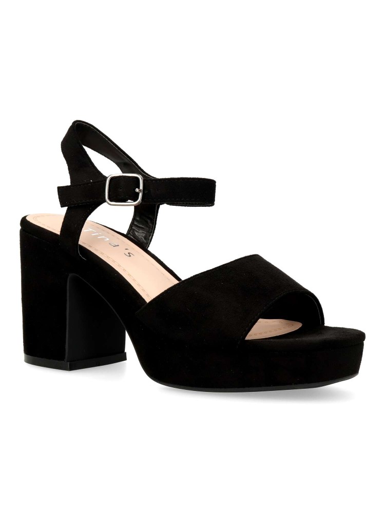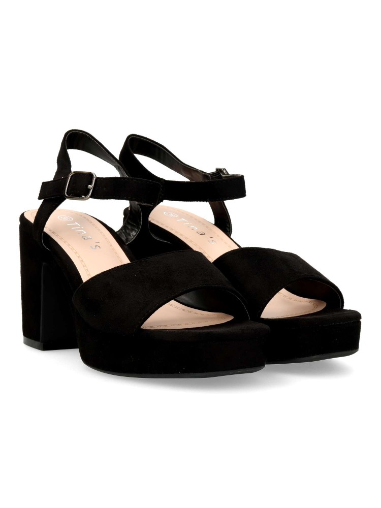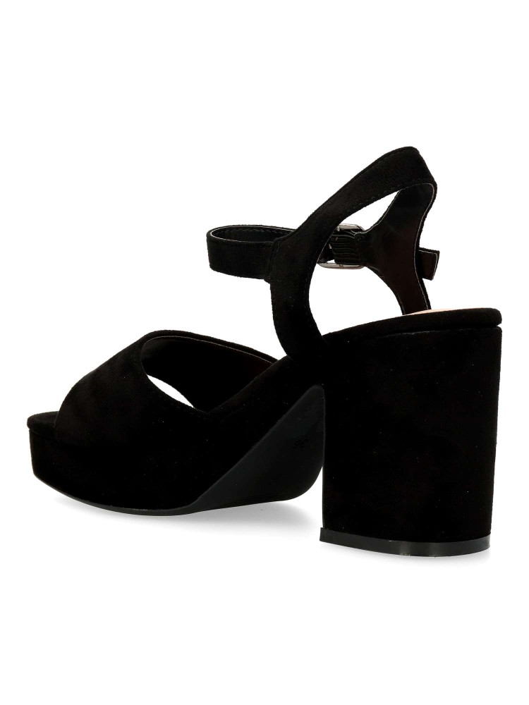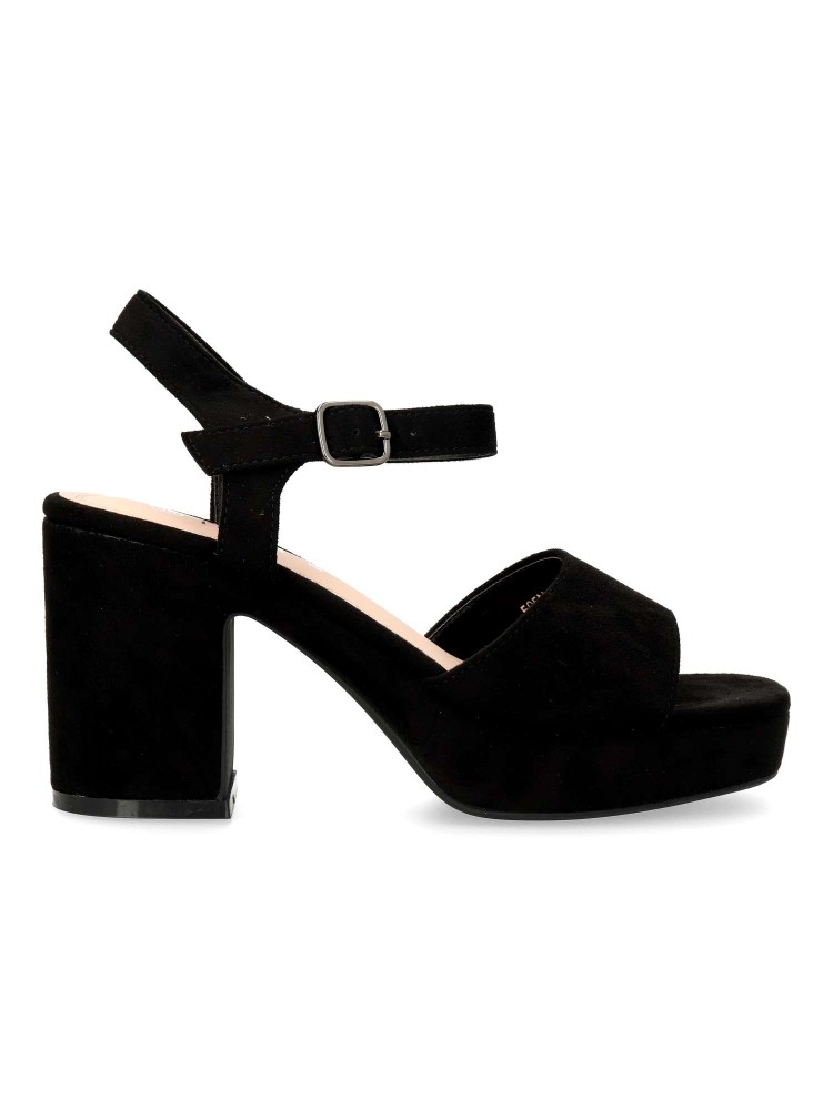 Sandalia de fiesta cómoda para mujer. Cierre de hebilla al tobillo. Fabricada en textil antelina negro, con suela de goma. Planta acolchada. Tacón ancho de 8 cm. y plataforma de 2,5 cm. Ideal tanto para celebraciones, como con tus outfits arreglados.