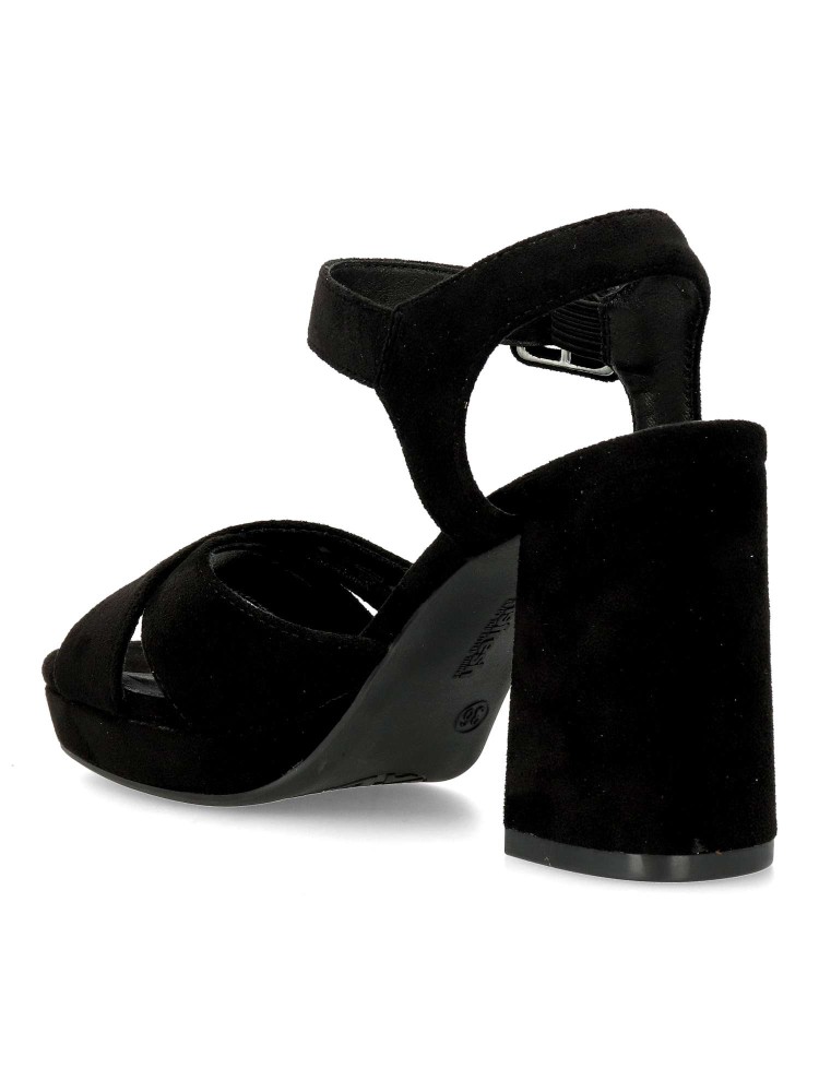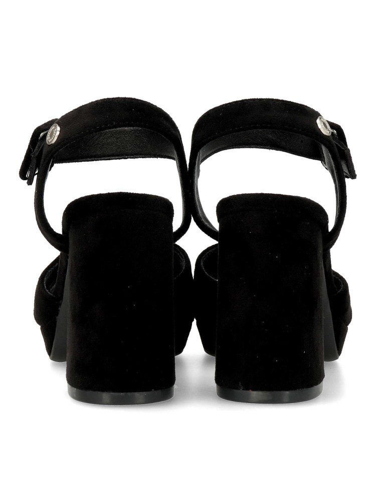 Sandalia de fiesta para mujer. Fabricada en piel sintética antelina, con suela de goma antideslizante. Pulsera al tobillo con hebilla regulable. Tacón ancho de 9 cm. con plataforma delantera. Ideal para eventos y celebraciones. Certificado vegano.