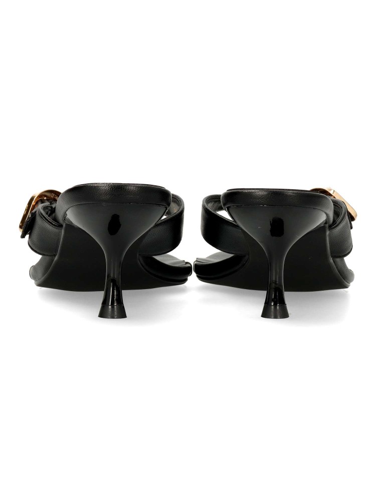Sandalia de fiesta para mujer. Modelo tipo esclava, con hebilla decorativa. Fabricado en piel sintética, con suela de goma. Tacón fino de 5,5 cm. de altura. Color negro. Ideal para bodas, comuniones y demás eventos y celebraciones.