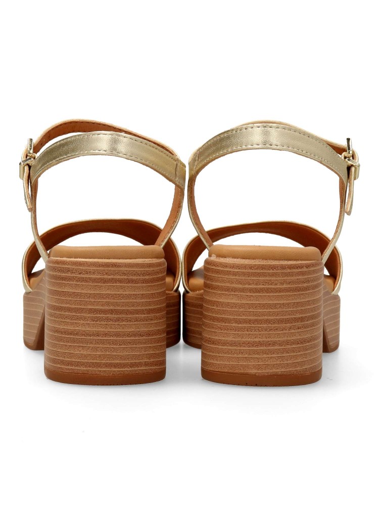 Sandalia cómoda de mujer, con tacón efecto madera. Fabricada en piel natural. Cierre de hebilla. Color platino. Planta acolchada. Suela de caucho. Altura tacón 6 cm. Diseño y confort con tus outfits de verano. Hecho en España.
